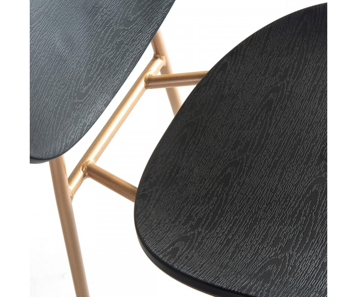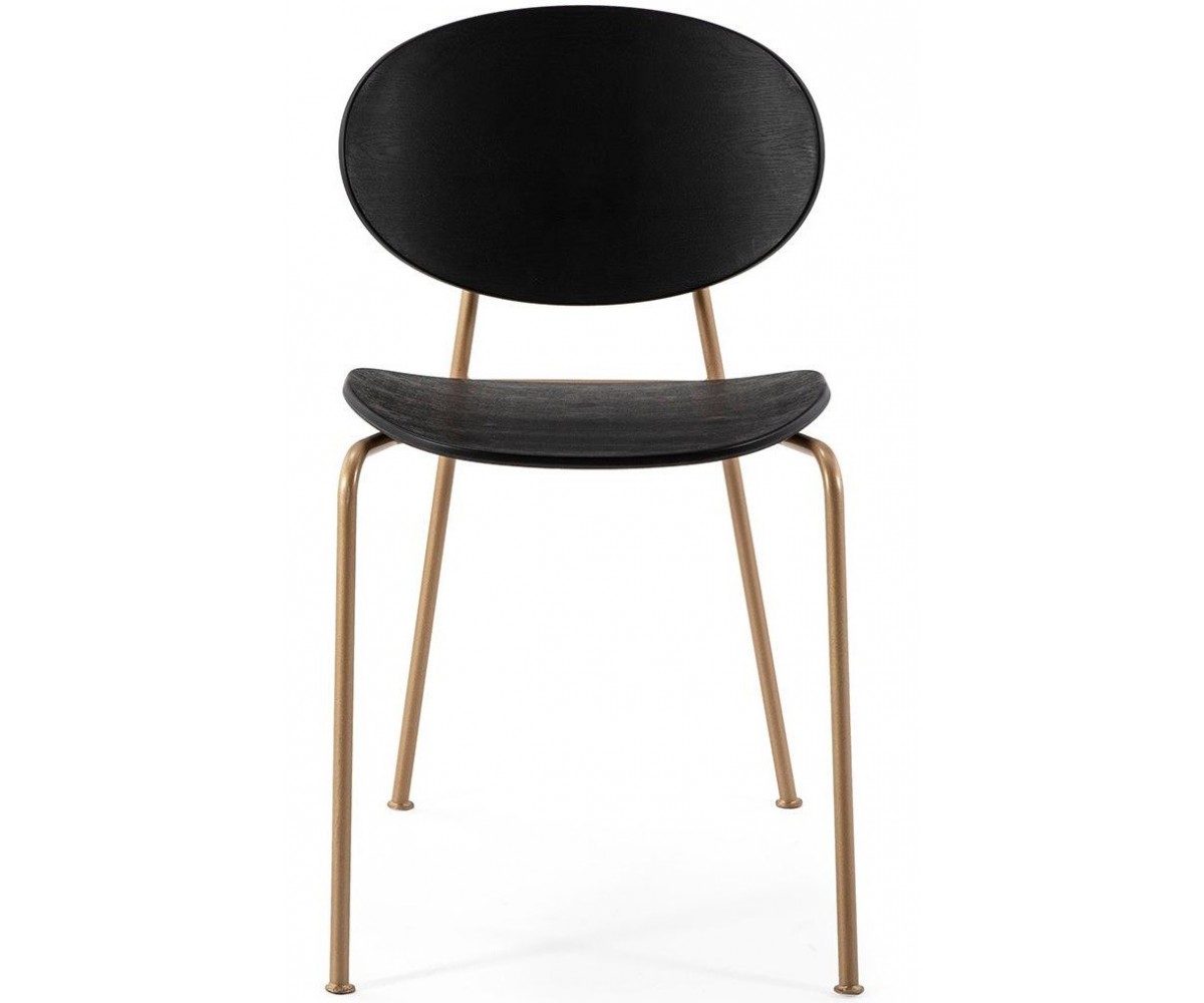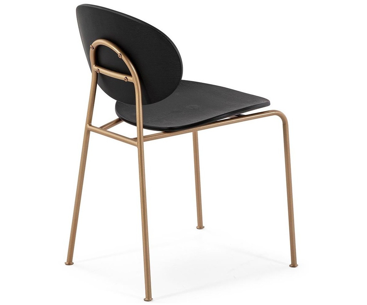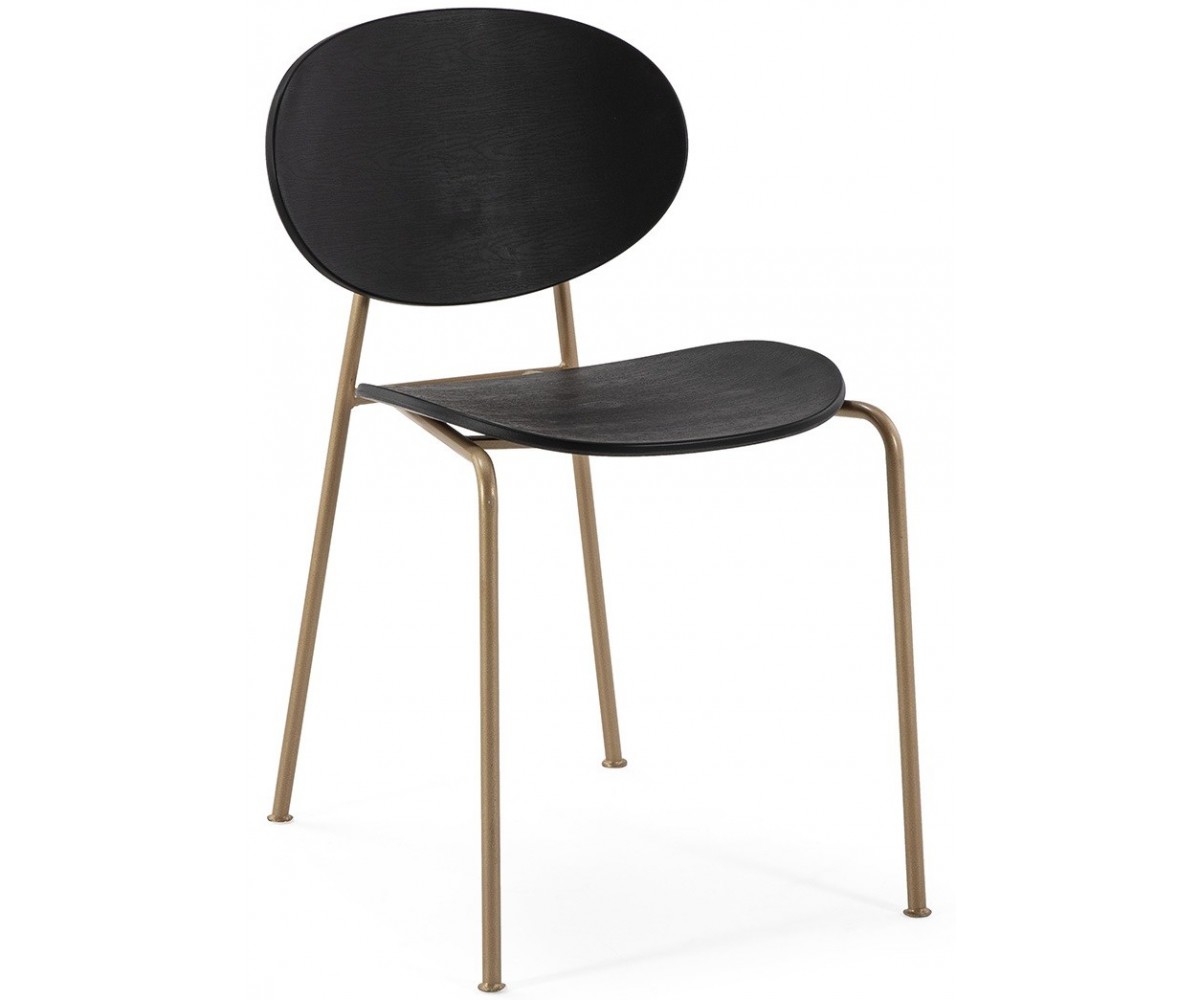 Silla inspirada en un diseño de Tim Rundle de la serie Michelle. Estructura tubular en acero terminación dorado. Asiento y respaldo en polipropileno terminación madera color negro. También disponible con asiento y respaldo tapizado en tejido. Réplica exacta con materiales originales de máxima calidad.