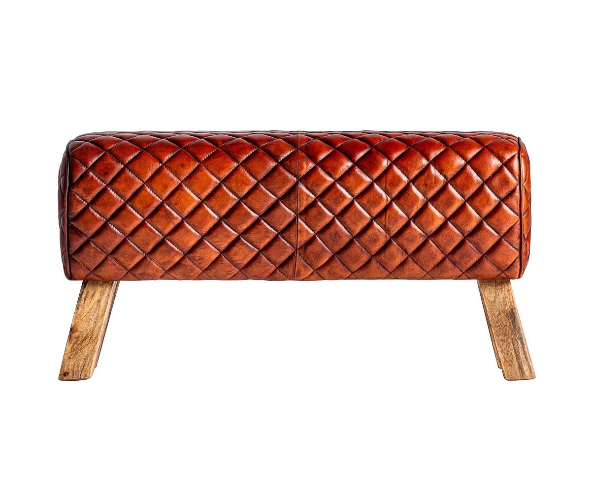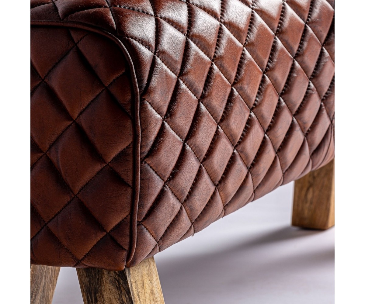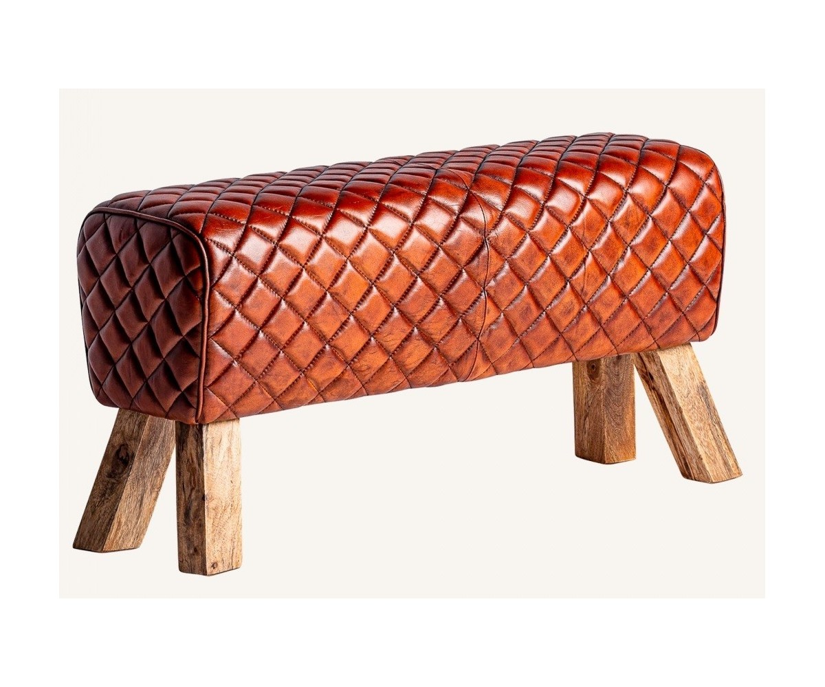 Banco inspirado en un diseño de Pedro Mendes. Fabricado de forma artesanal en madera de mango y tapizado en cuero italiano color marrón envejecido tratado. Réplica con materiales originales de máxima calidad.