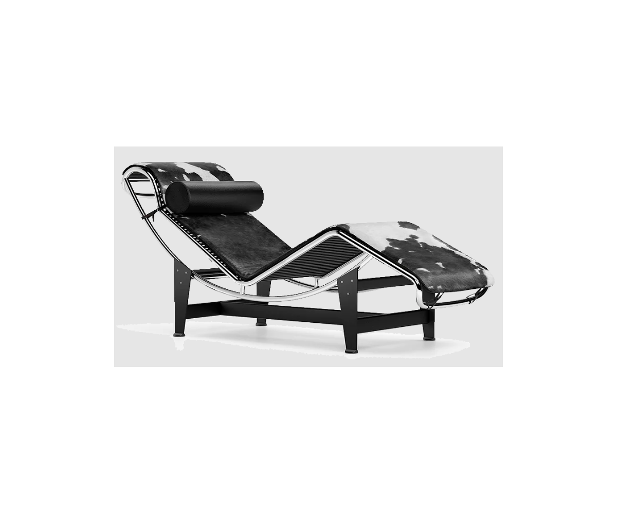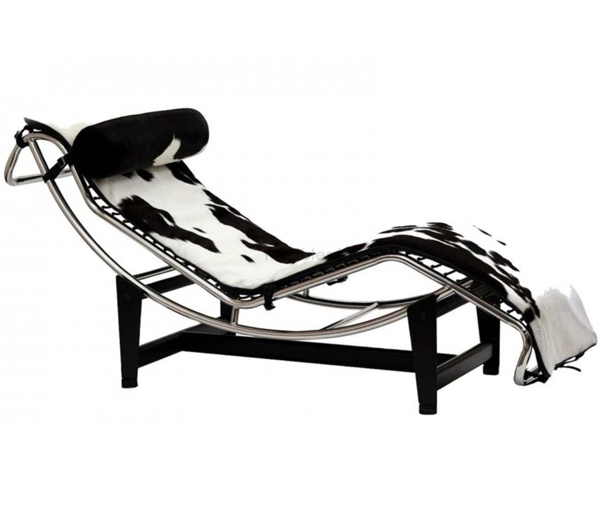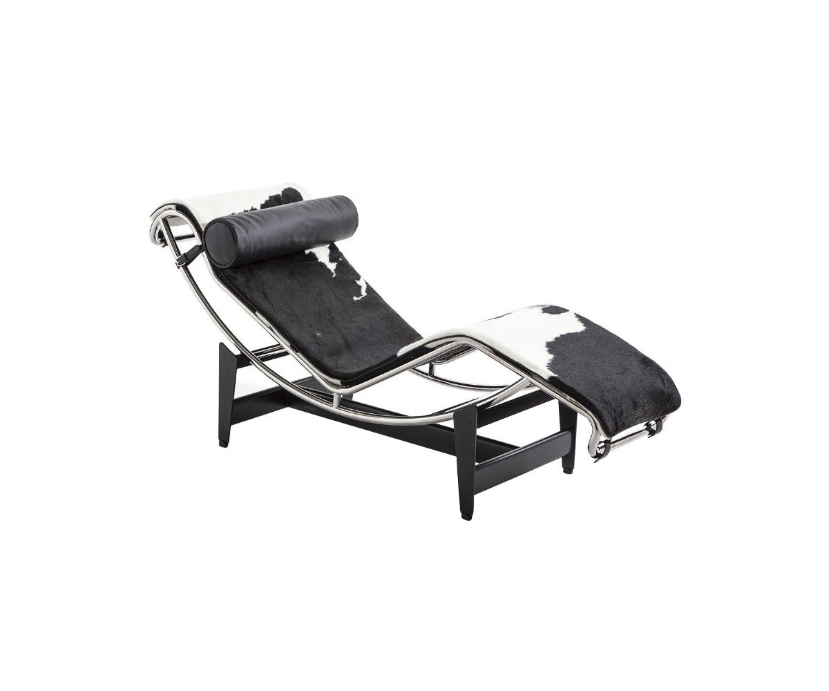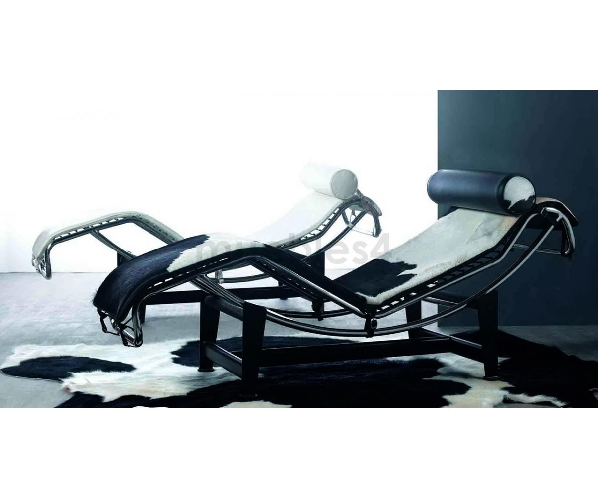 Tumbona inspirada en un diseño de Le Corbusier. Realizada en acero cromado brilllo tubular sobre base lacado en negro epoxi. Colchoneta tapizada en piel de potro/poni y almohadilla tapizadoa en piel de alta calidad en color negro y blanco. Los dibujos de la piel varian. Inclinación variable. Réplica exacta con materiales originales de máxima calidad.