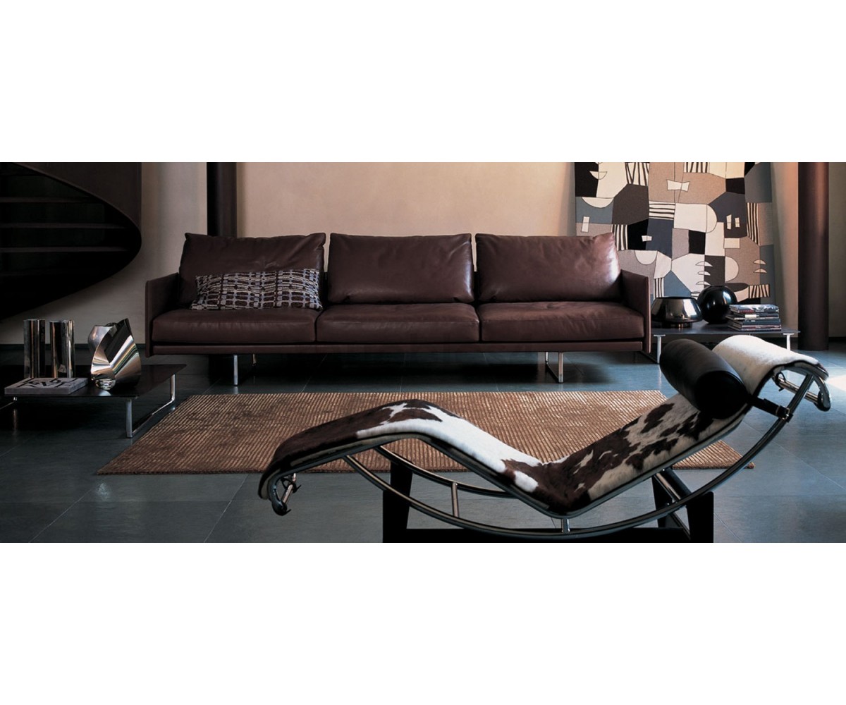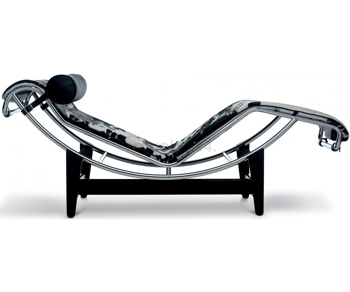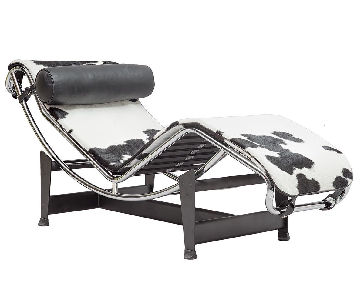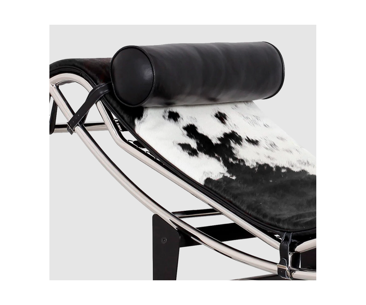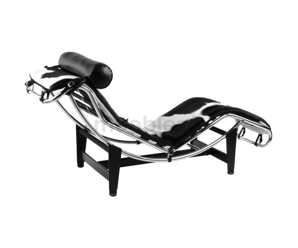Tumbona inspirada en un diseño de Le Corbusier. Realizada en acero cromado brilllo tubular sobre base lacado en negro epoxi. Colchoneta tapizada en piel de potro/poni y almohadilla tapizadoa en piel de alta calidad en color negro y blanco. Los dibujos de la piel varian. Inclinación variable. Réplica exacta con materiales originales de máxima calidad.