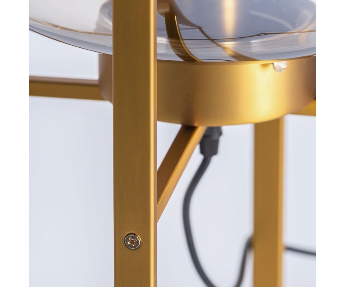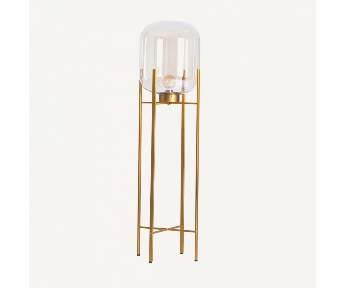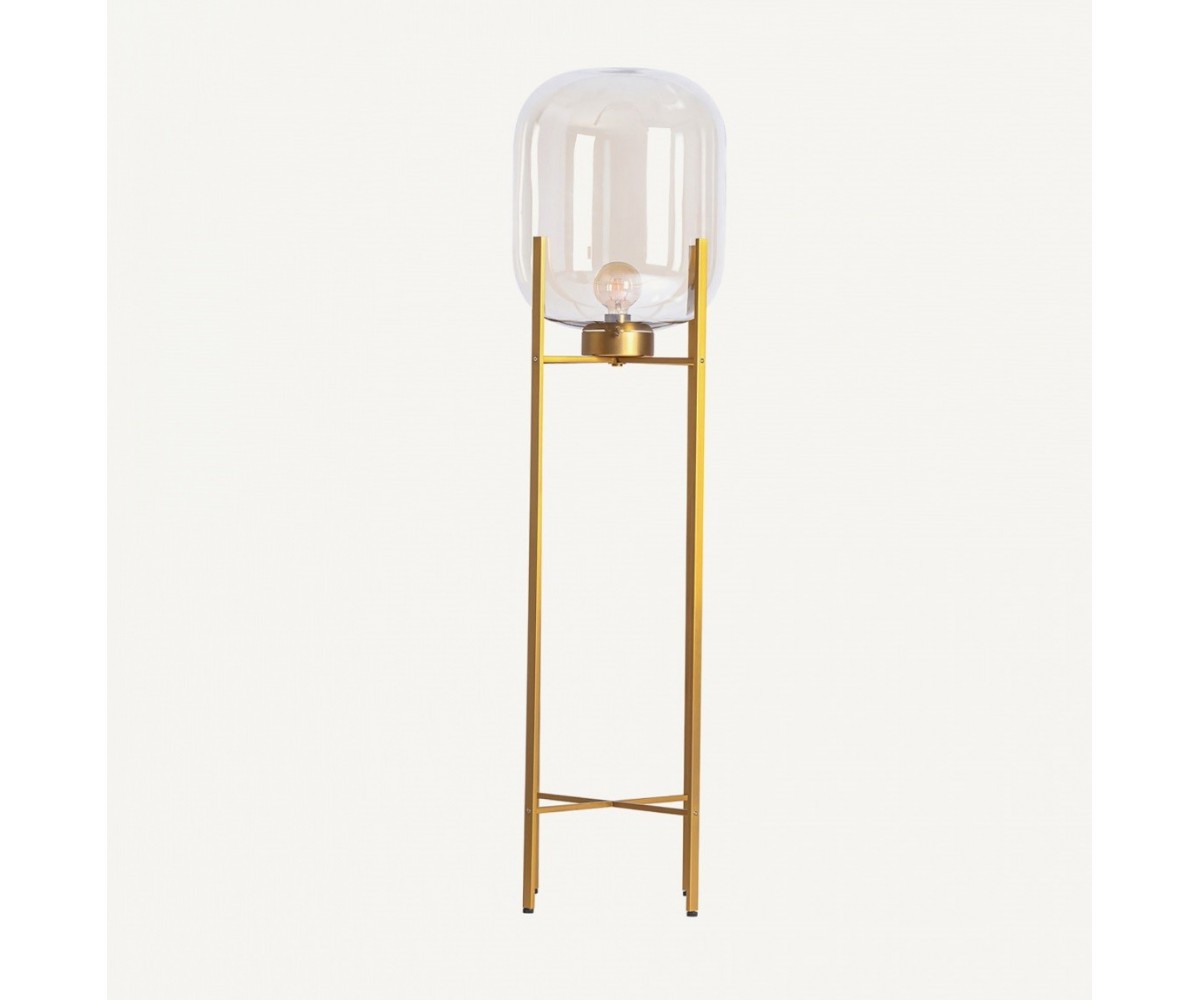 Lámpara de suelo inspirada en un diseño de Sebastian Herkner. Estructura en acero terminación dorado. Tulipa en cristal soplado transparente. Rosca para bombilla E27 máximo 40W, no incluida. Medidas de la pantalla 35x35x45cm. Largo del cable 310cm, distancia del interruptor 200cm. Patas regulables. Peso máximo 6kg. Serie compuesta por lámpara de suelo y sobremesa. Réplica con materiales originales de máxima calidad.