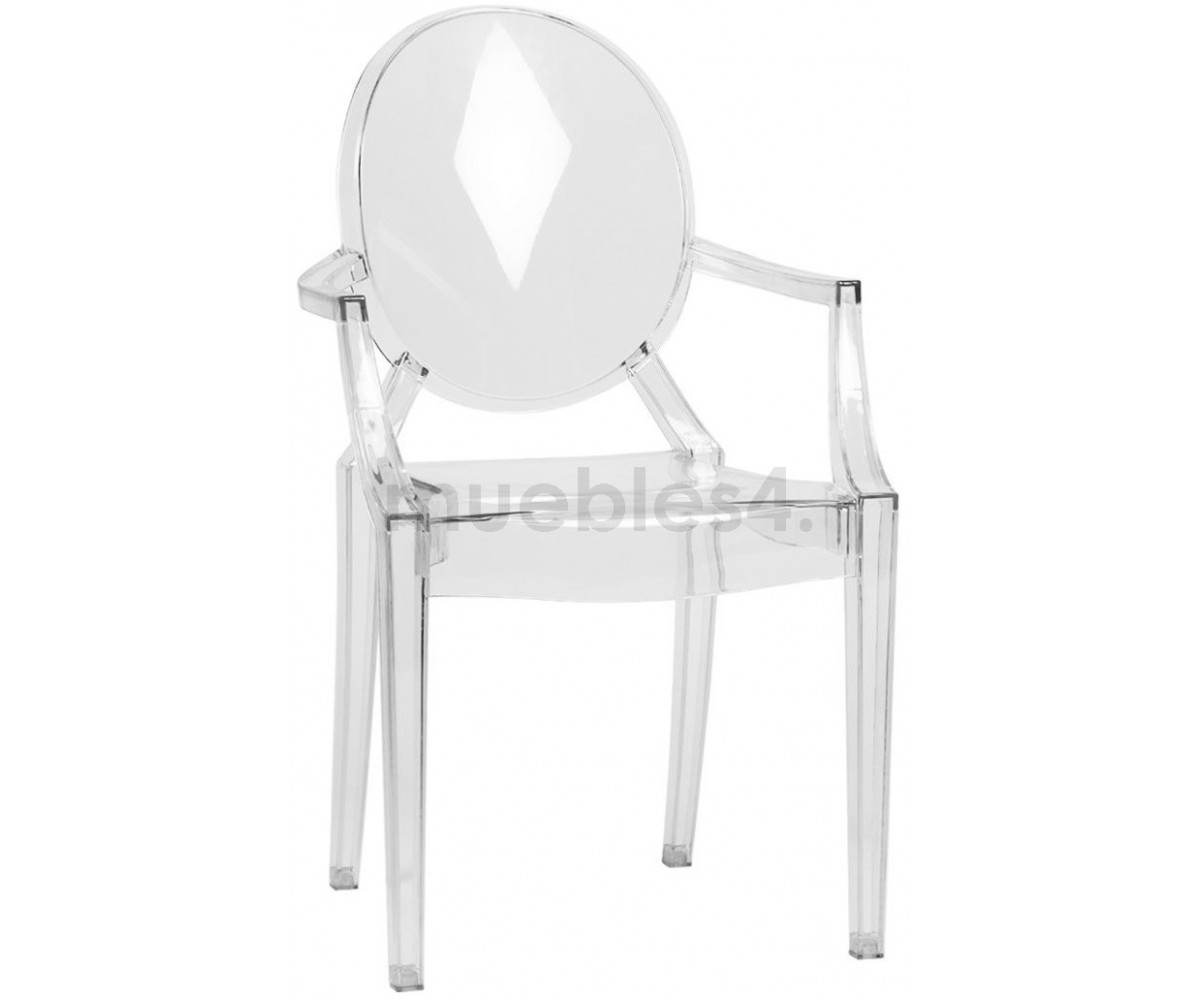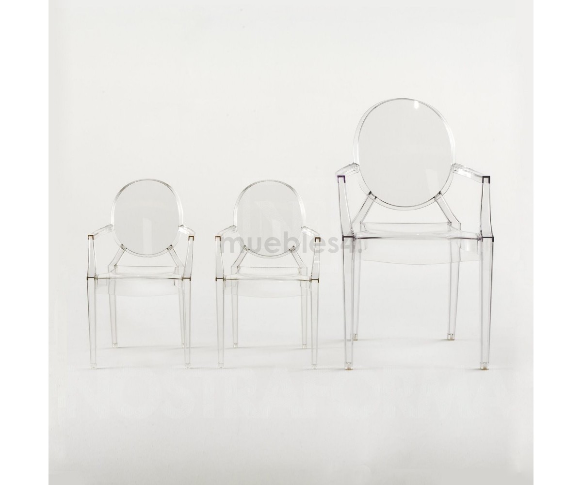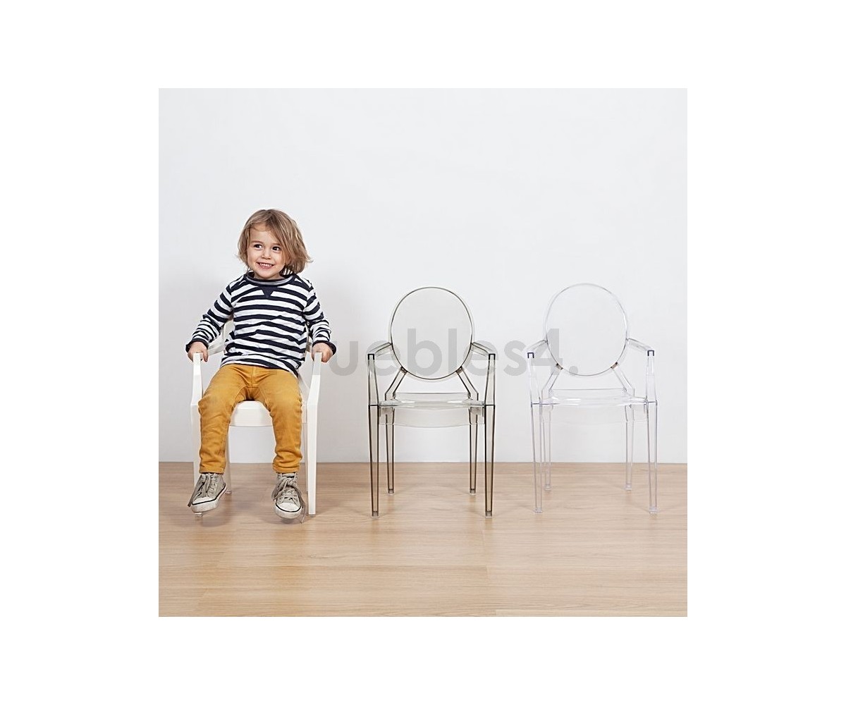 Silla para niños con brazos inspirada en un diseño de Philippe Starck. Realizada en policarbonato de gran dureza, resistente a rayados y temperaturas, terminación transparente. Fabricada en solo una pieza. Réplica exacta con materiales originales de máxima calidad.