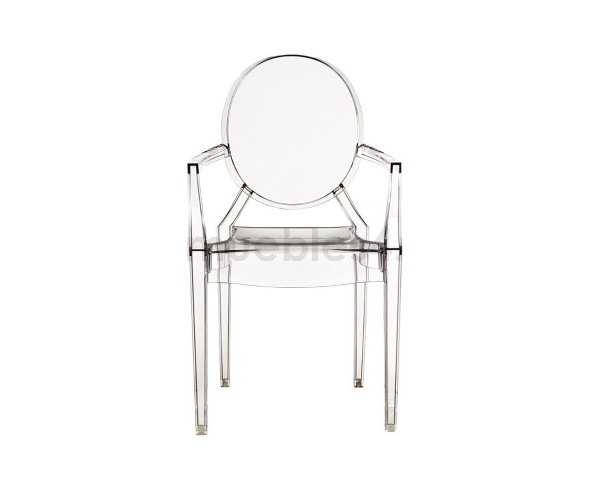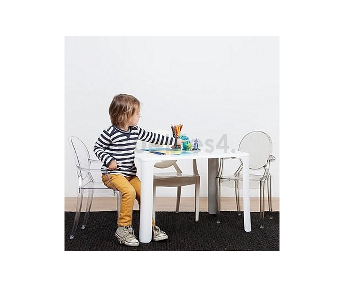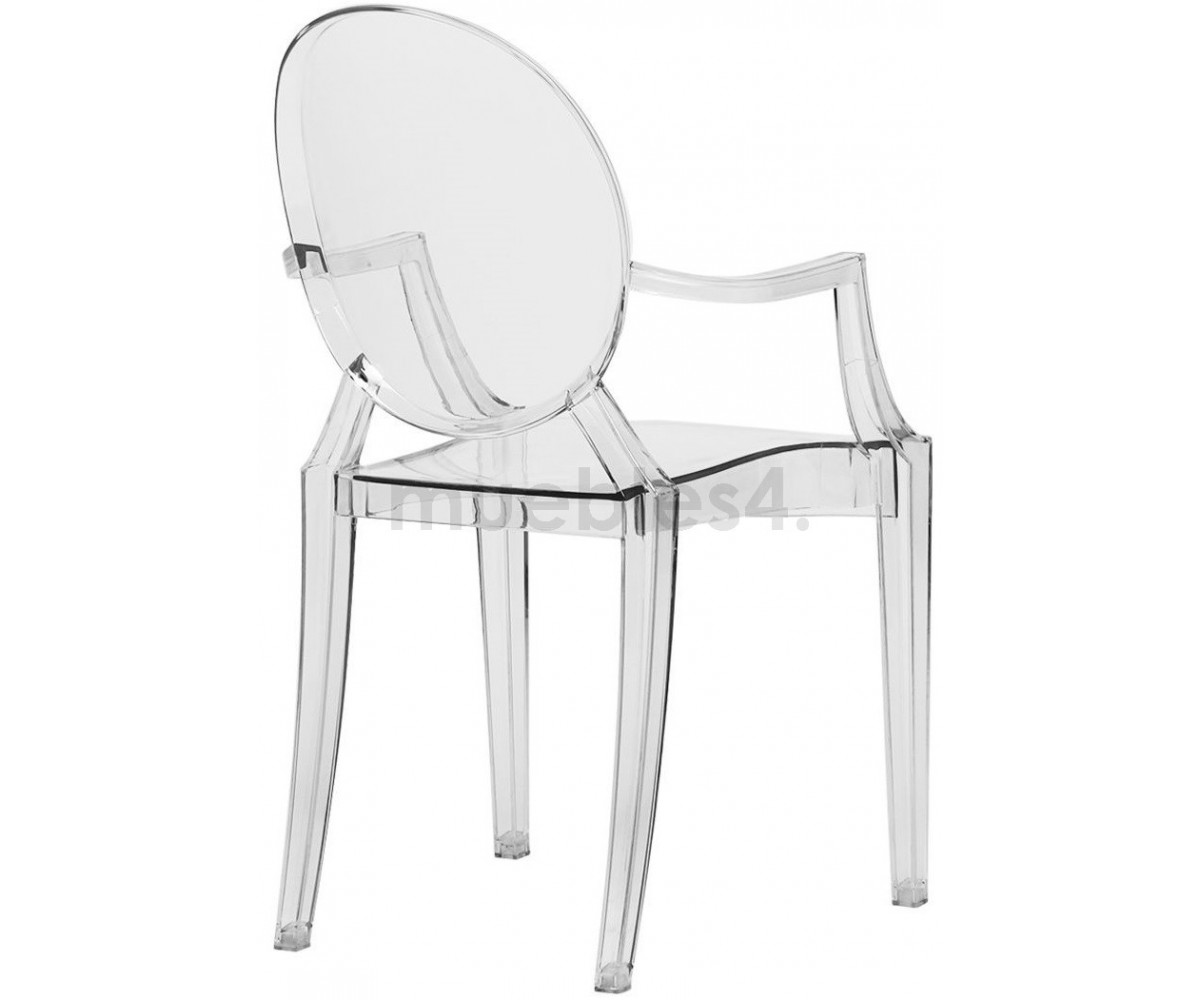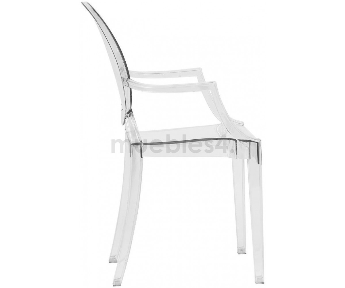 Silla para niños con brazos inspirada en un diseño de Philippe Starck. Realizada en policarbonato de gran dureza, resistente a rayados y temperaturas, terminación transparente. Fabricada en solo una pieza. Réplica exacta con materiales originales de máxima calidad.