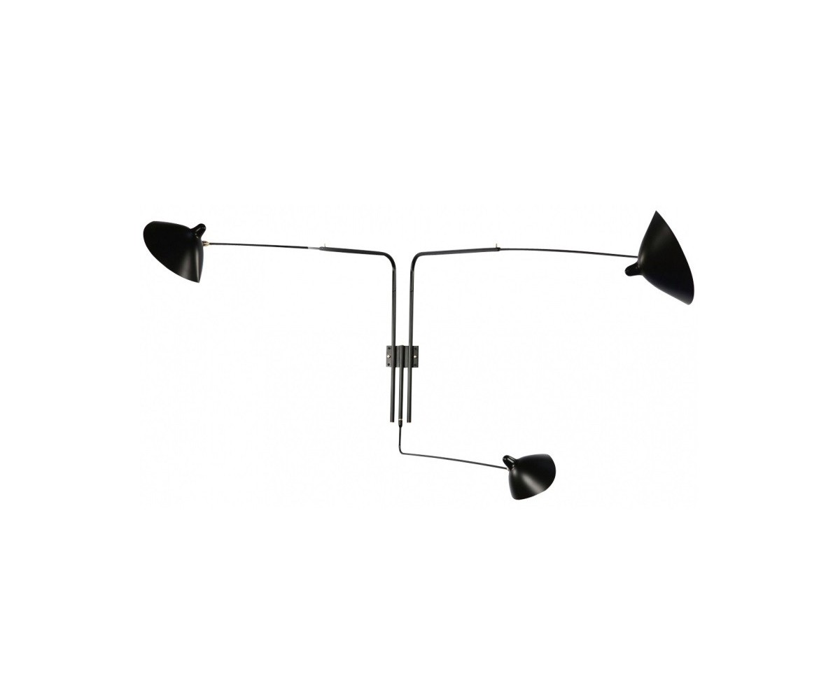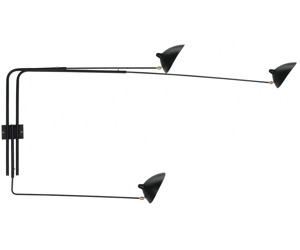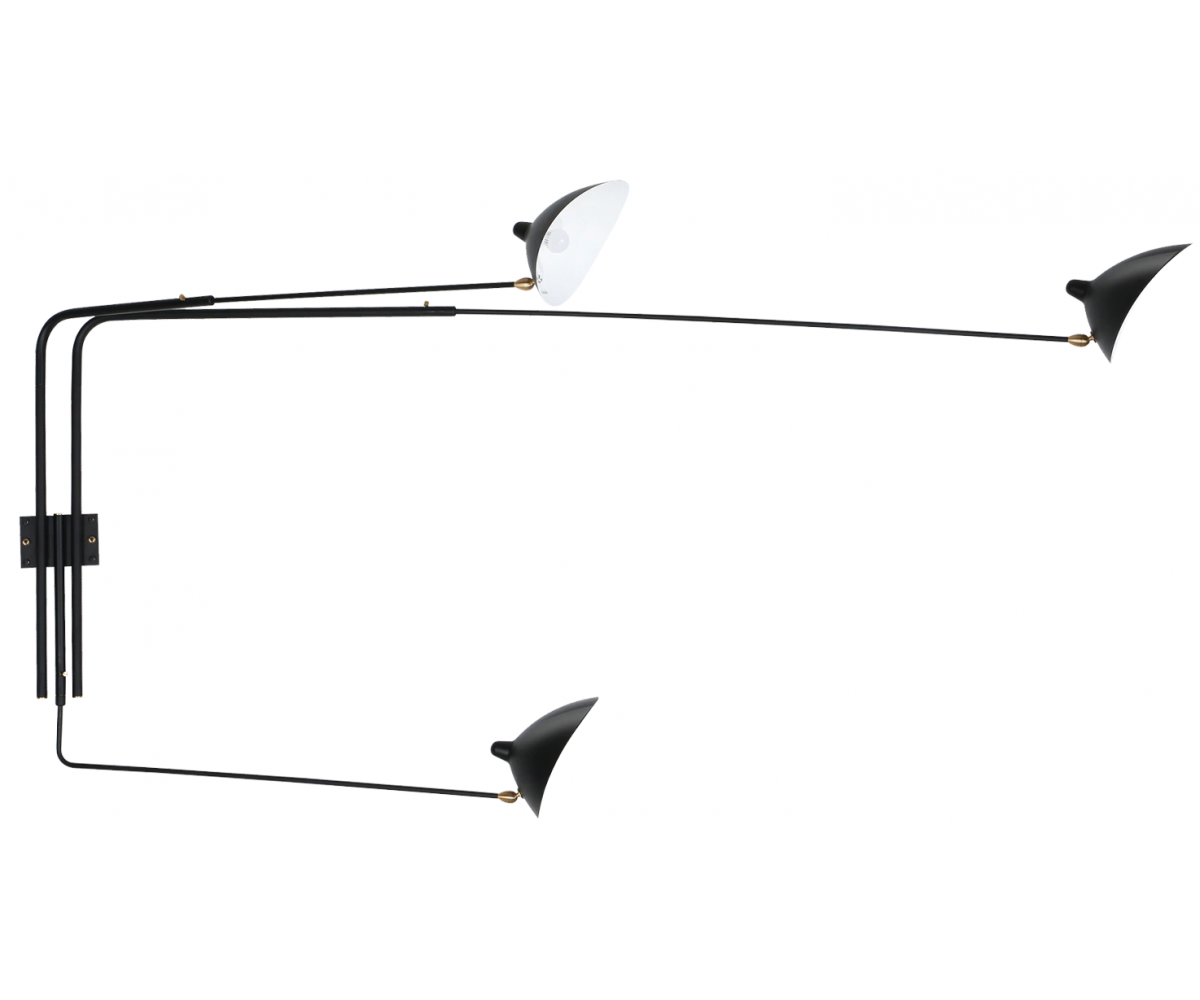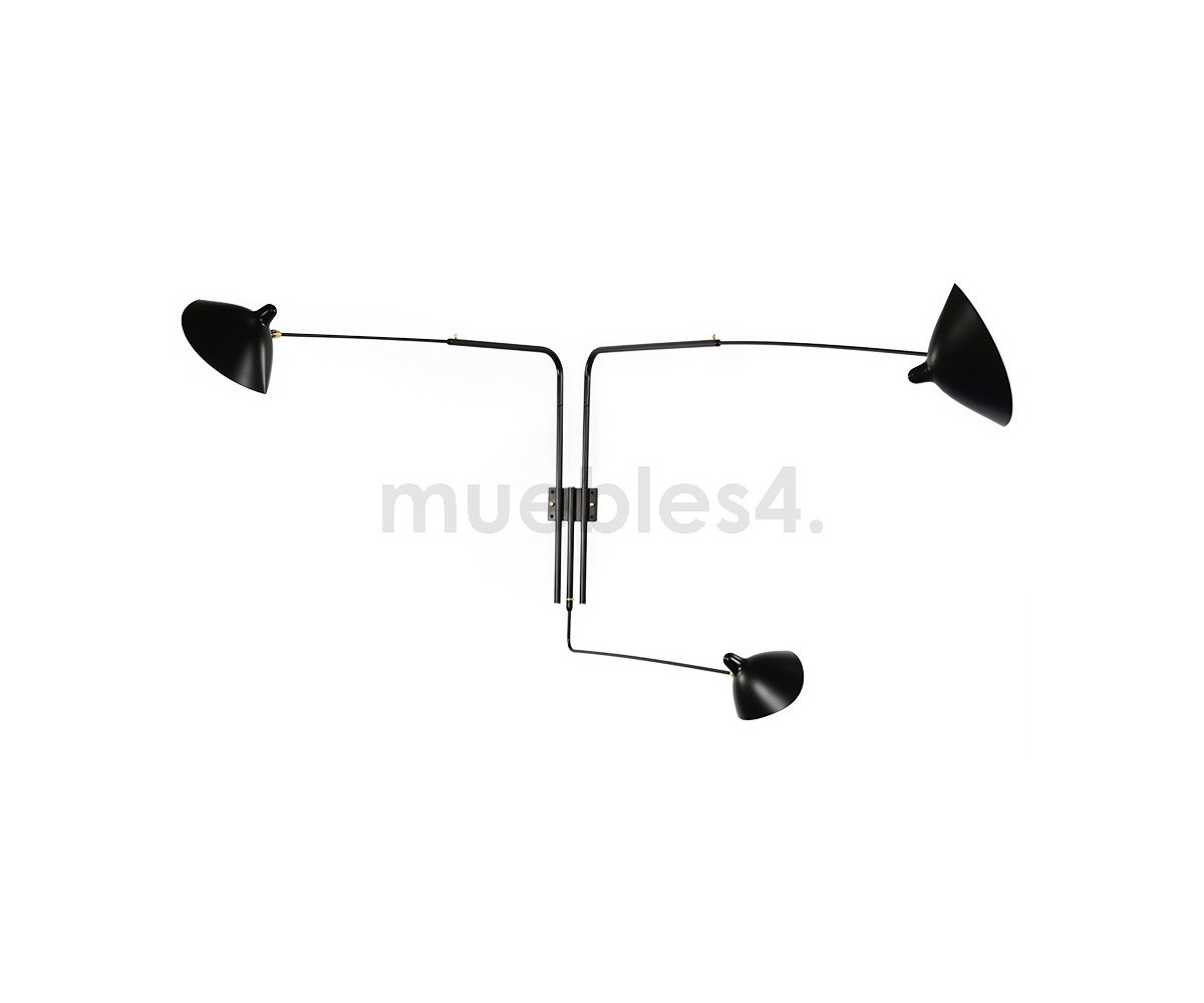 Lámpara aplique, inspirado en un diseño de Serge Mouille. Realizada en acero TRIPLE LACADO color negro mate. Compuesta de tres brazos con pantallas articuladas con rotula de giro. Difusor orientable. Modelo para colocar directamente en punto de luz en pared con encendido y apagado desde interrptor empotrado en pared. Réplica con materiales originales de máxima calidad.