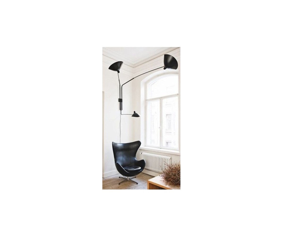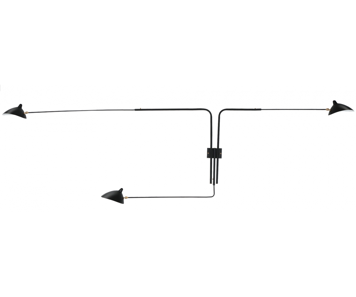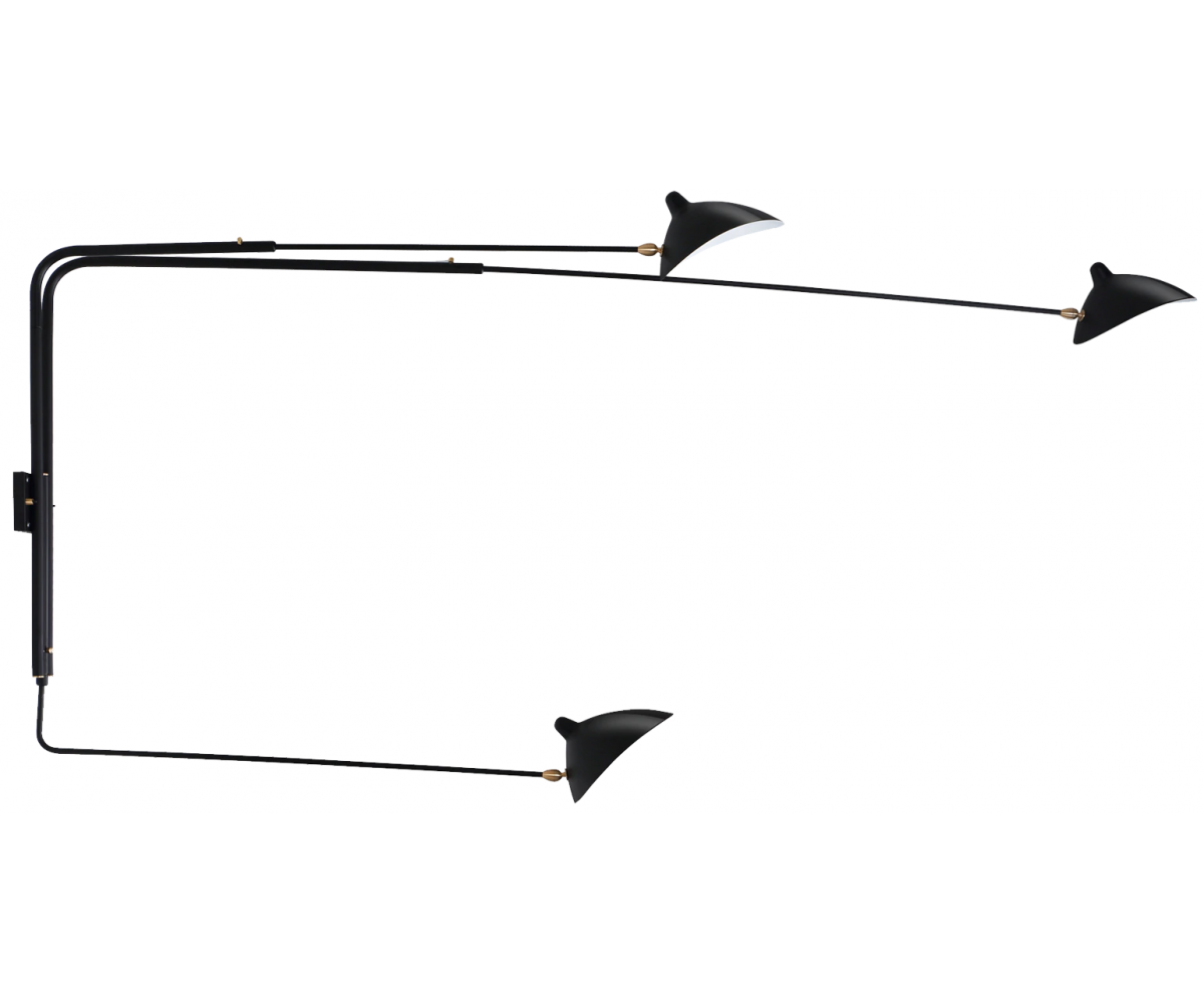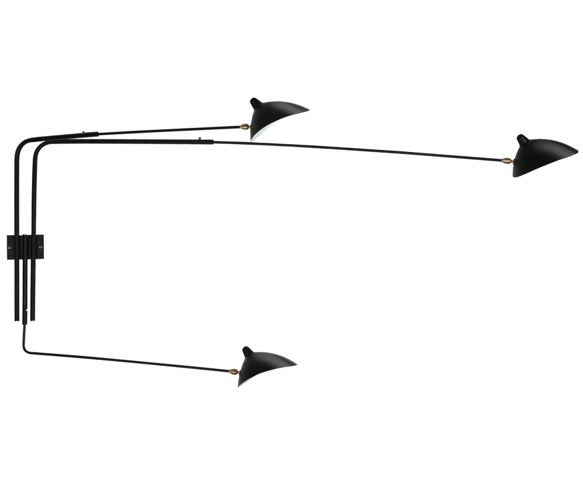 Lámpara aplique, inspirado en un diseño de Serge Mouille. Realizada en acero TRIPLE LACADO color negro mate. Compuesta de tres brazos con pantallas articuladas con rotula de giro. Difusor orientable. Modelo para colocar directamente en punto de luz en pared con encendido y apagado desde interrptor empotrado en pared. Réplica con materiales originales de máxima calidad.