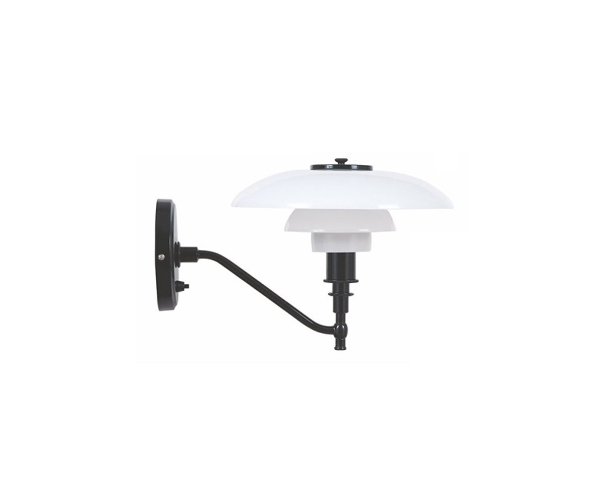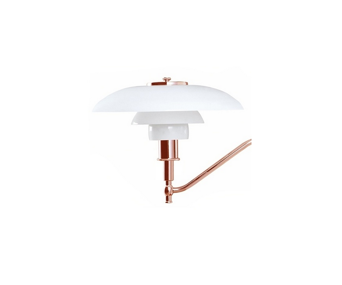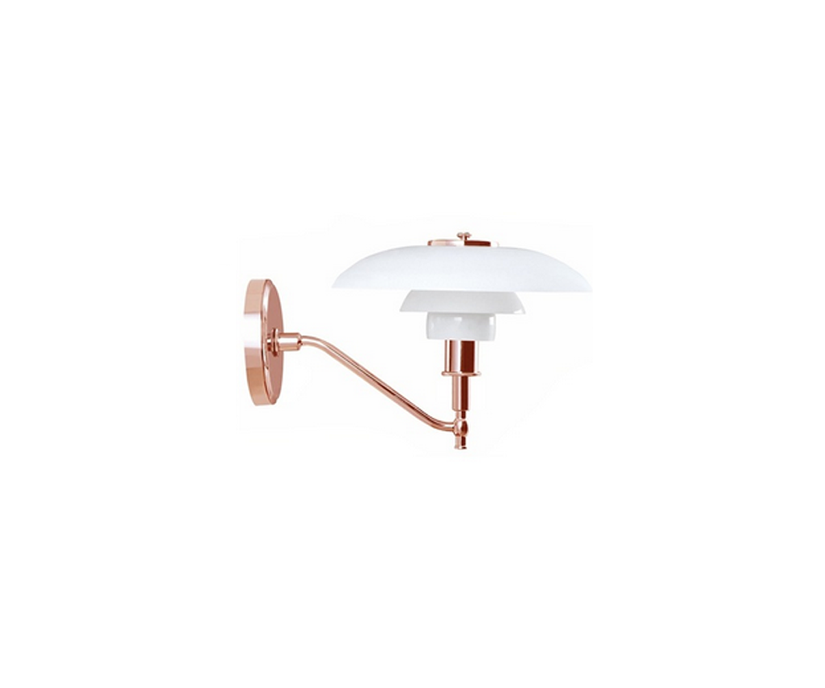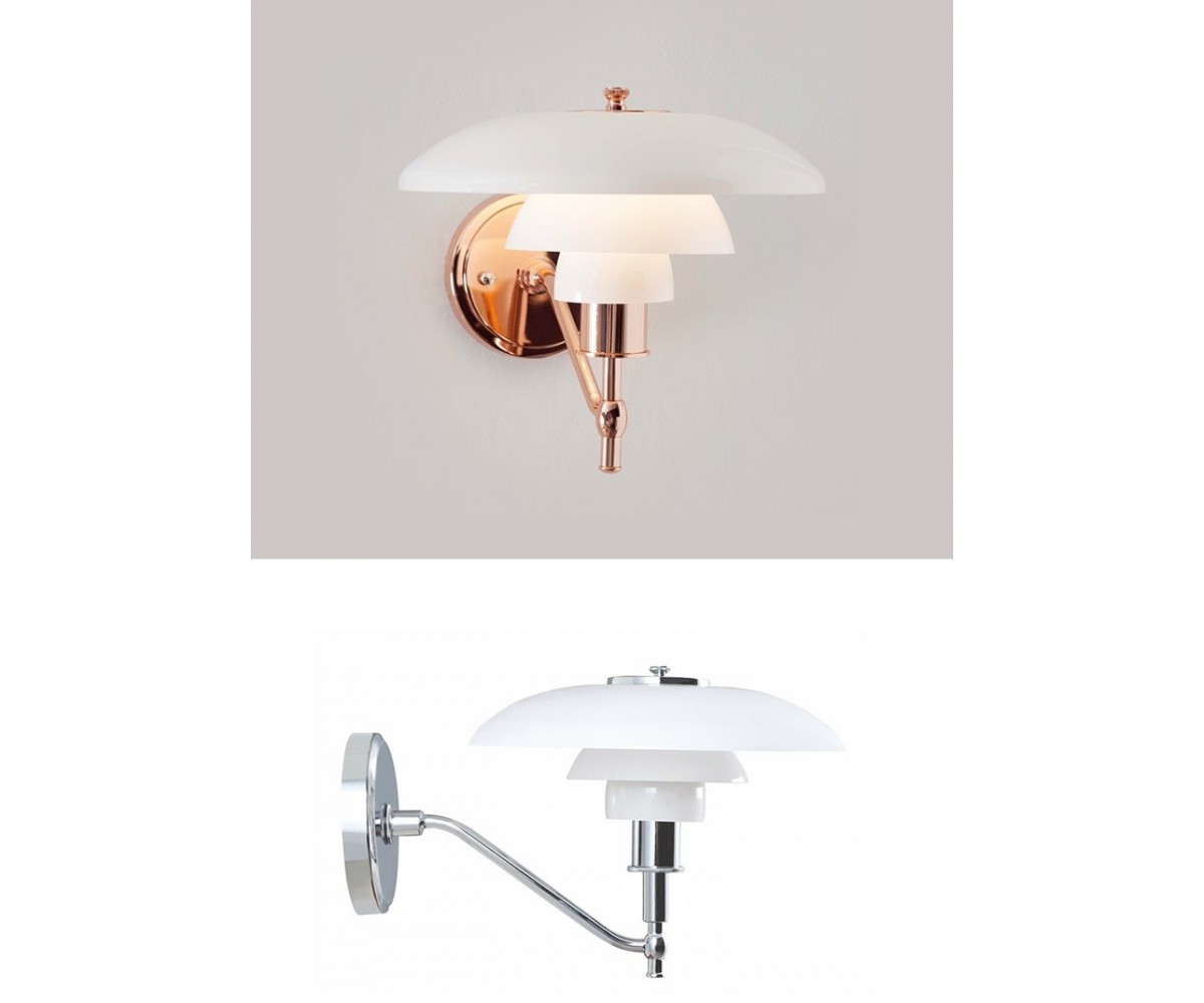 Lámpara de pared aplique inspirada en un diseño de Poul Henningsen. Armazón fabricado en acero color plata, oro rosa o negro, tulipa en cristal templado color blanco. Modelo de bombilla E27 LED. Disponible en lámpara de suelo, sobremesa y techo. Réplica exacta con materiales originales de máxima calidad.