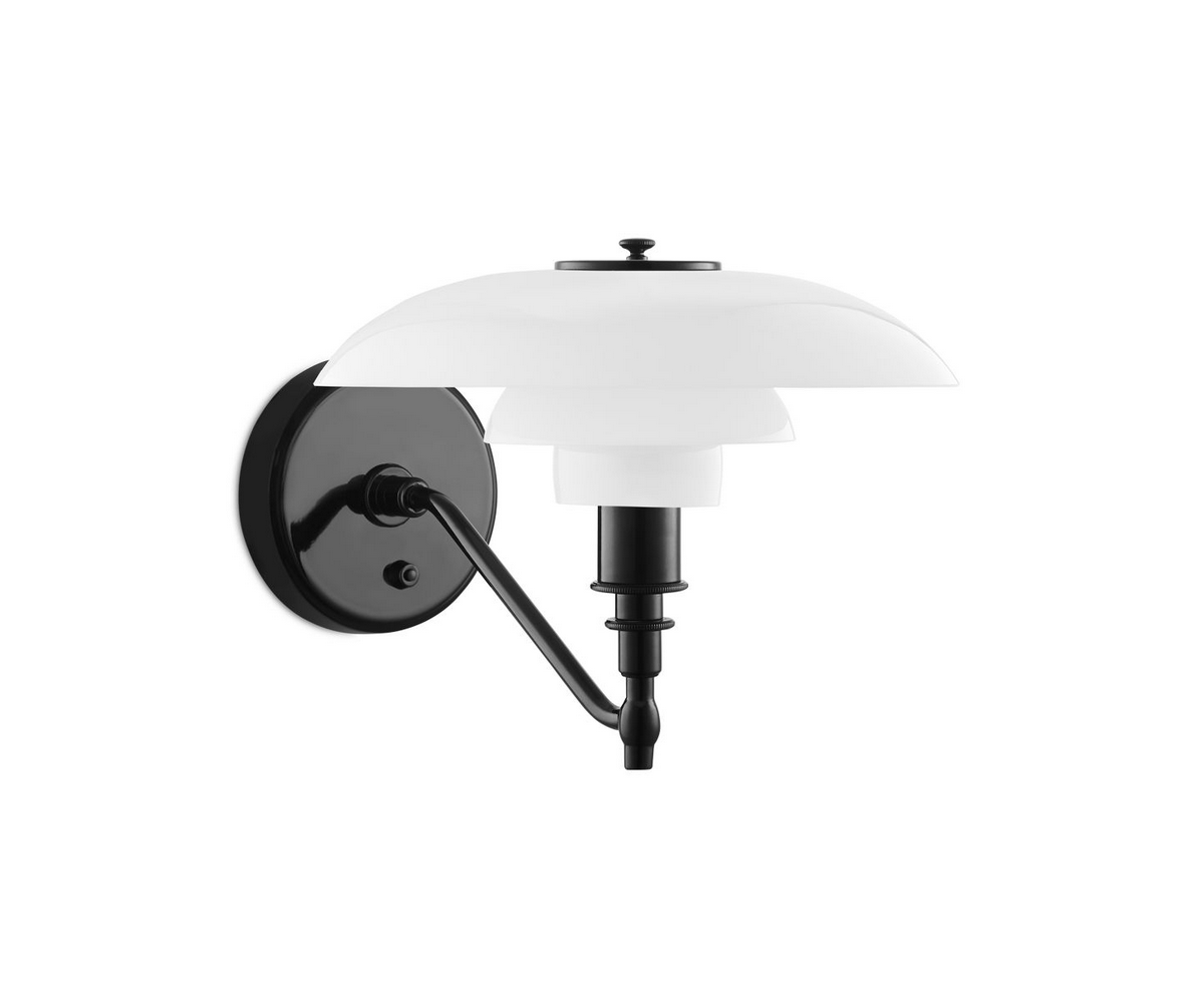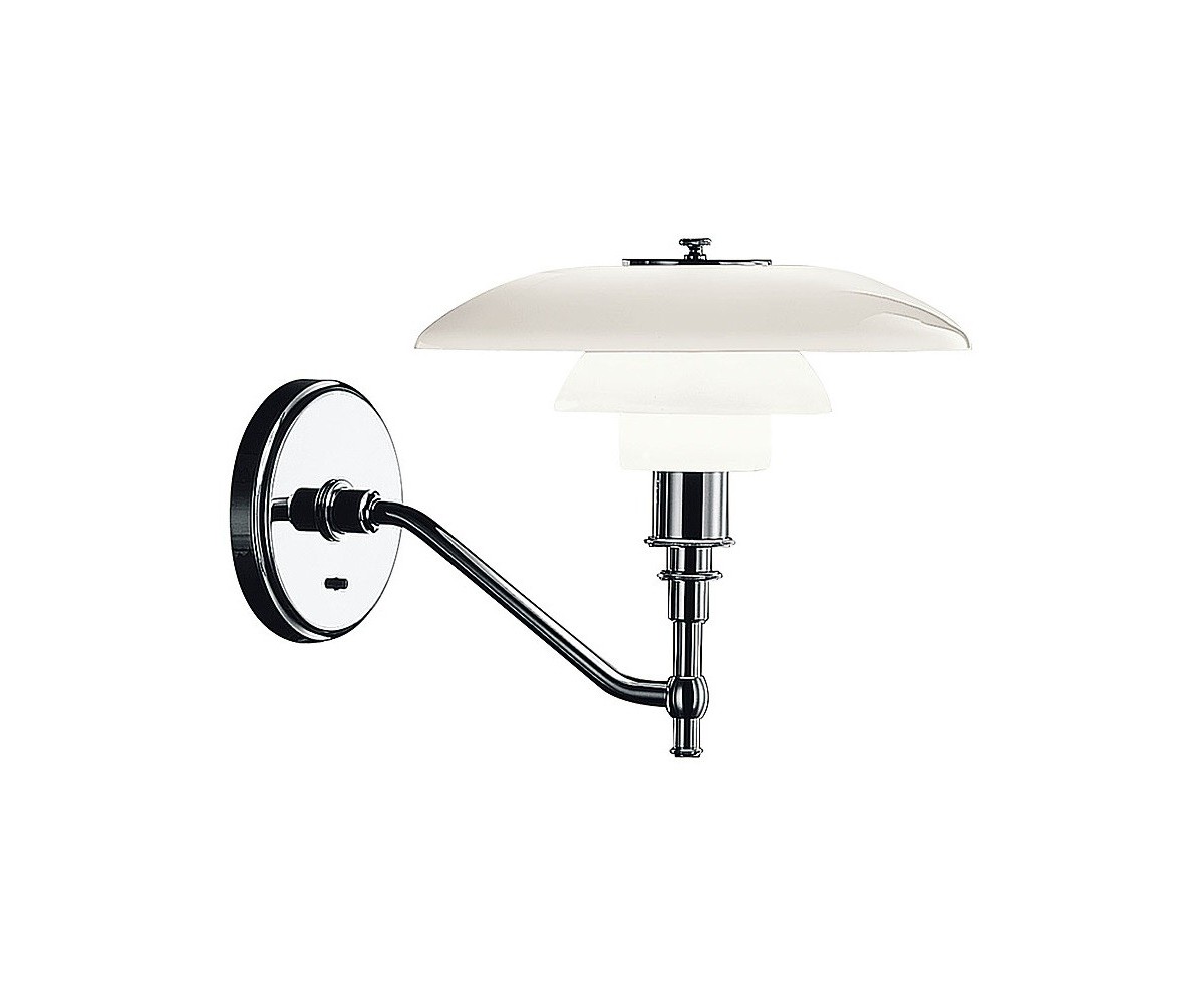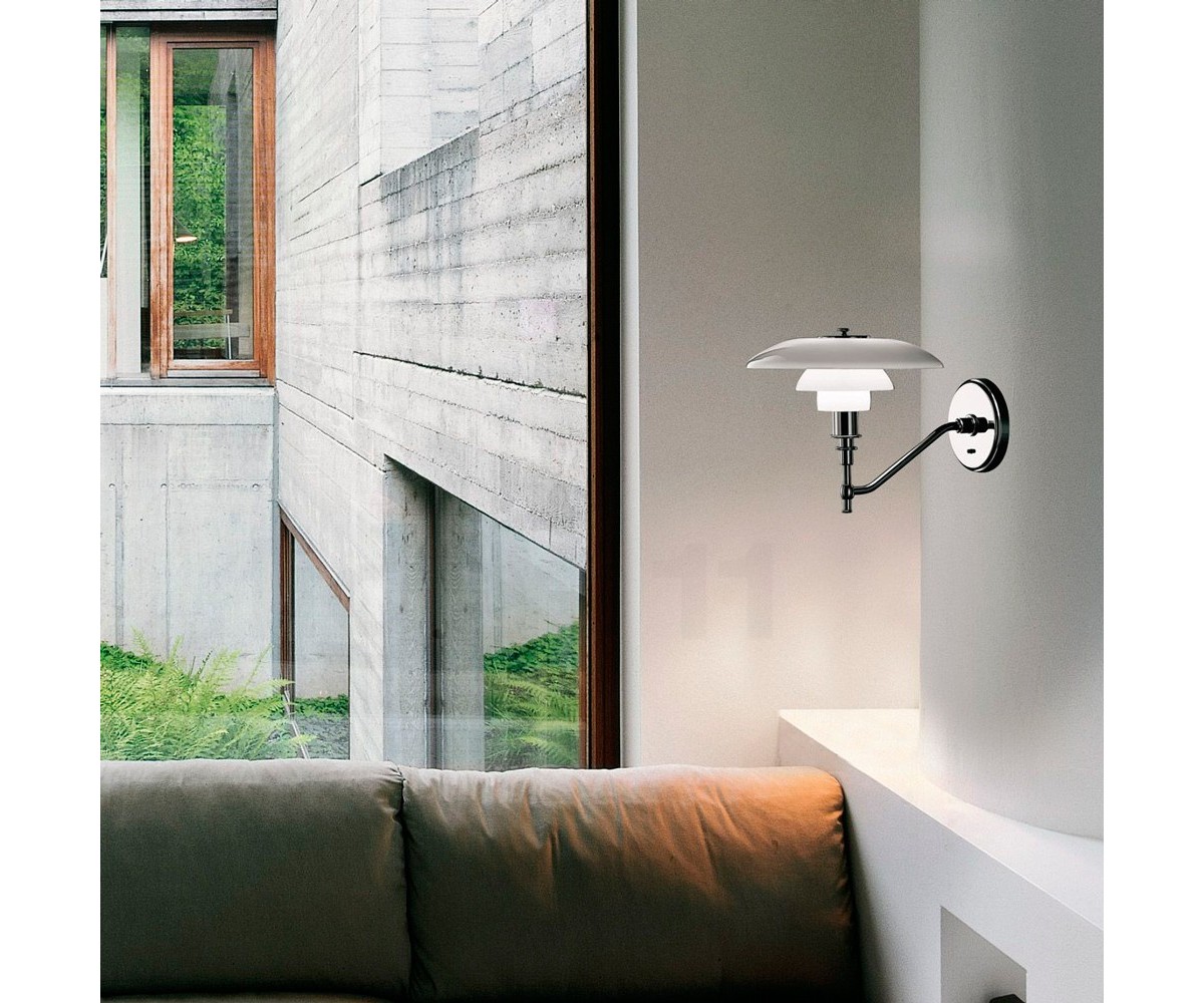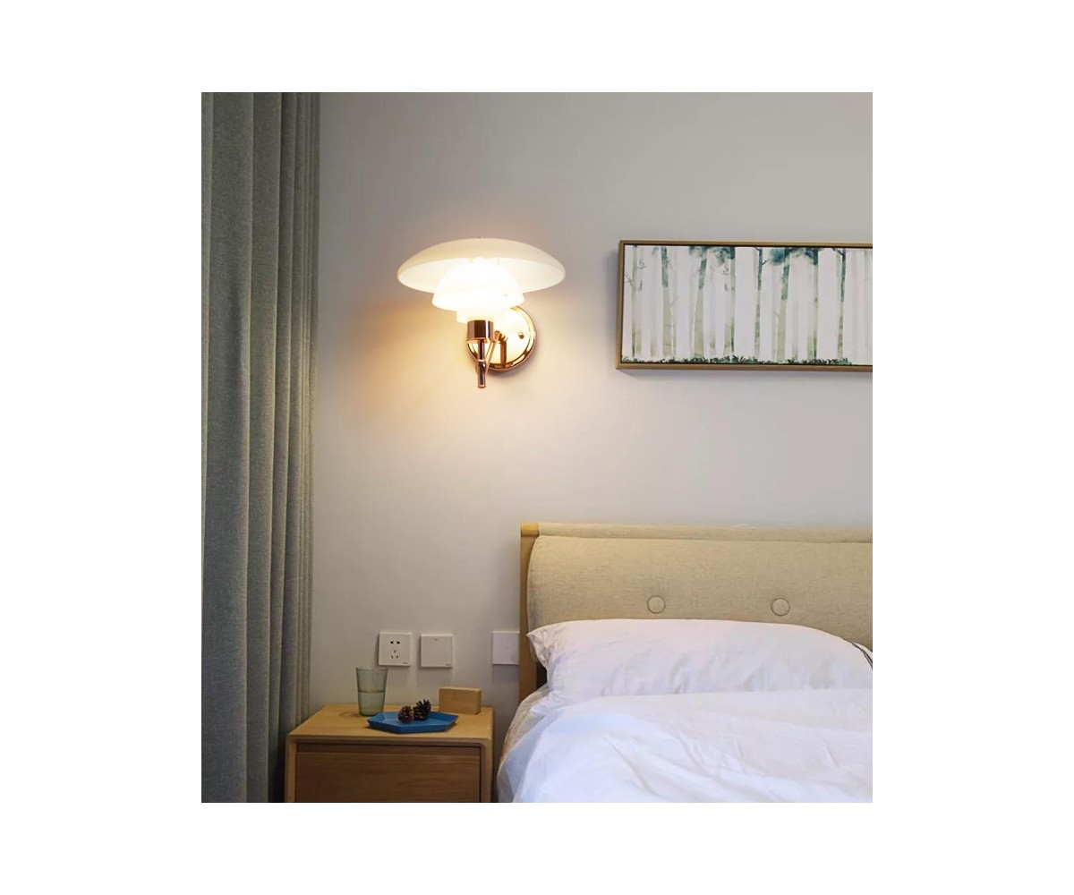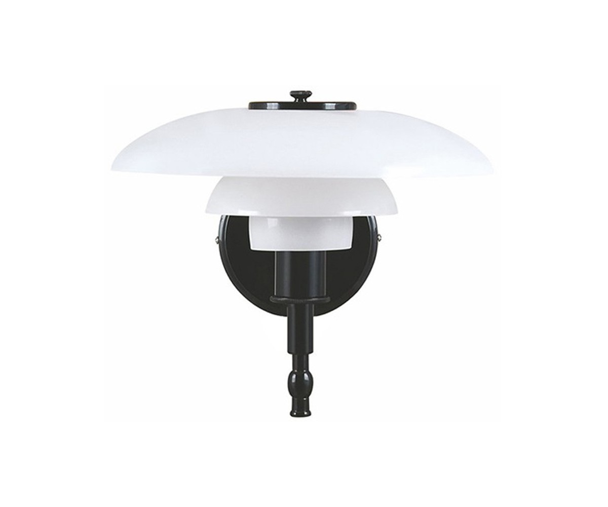 Lámpara de pared aplique inspirada en un diseño de Poul Henningsen. Armazón fabricado en acero color plata, oro rosa o negro, tulipa en cristal templado color blanco. Modelo de bombilla E27 LED. Disponible en lámpara de suelo, sobremesa y techo. Réplica exacta con materiales originales de máxima calidad.