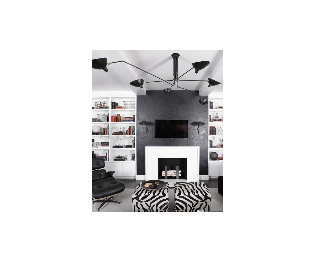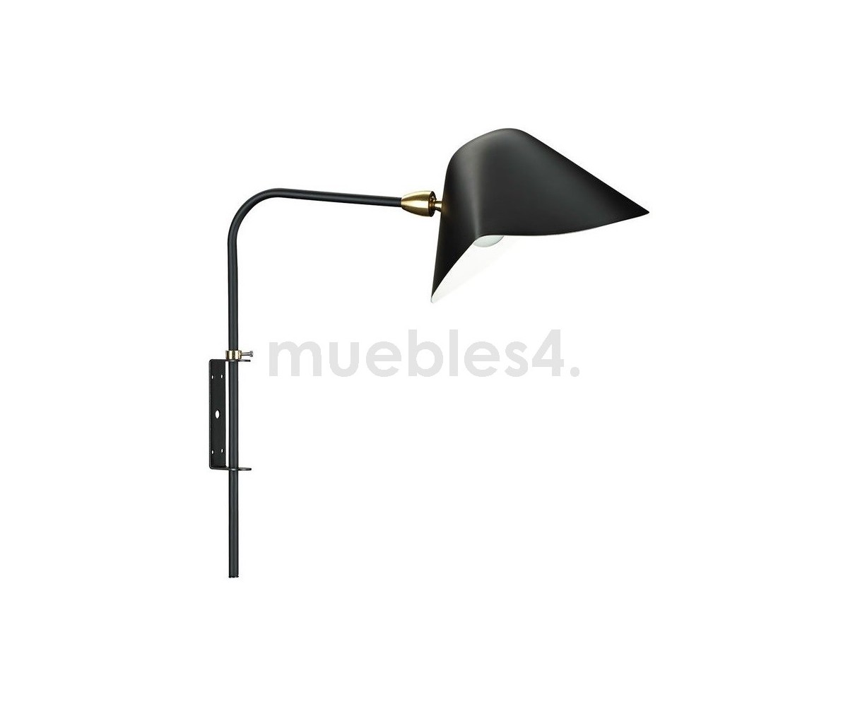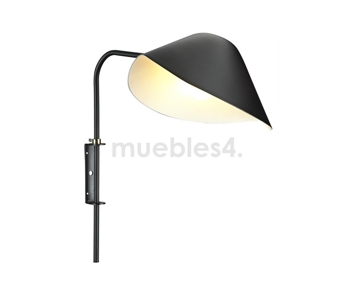 Aplique inspirado en un direño de Serge Mouille. Fabricado en acero color negro, pantalla en aluminio triple lacado color negro y interior en blanco, con herrajes en bronce. Dispone de interruptor apagado/encendido en el cable. Modelo de bombilla E27. Réplica exacta con materiales originales de máxima calidad.