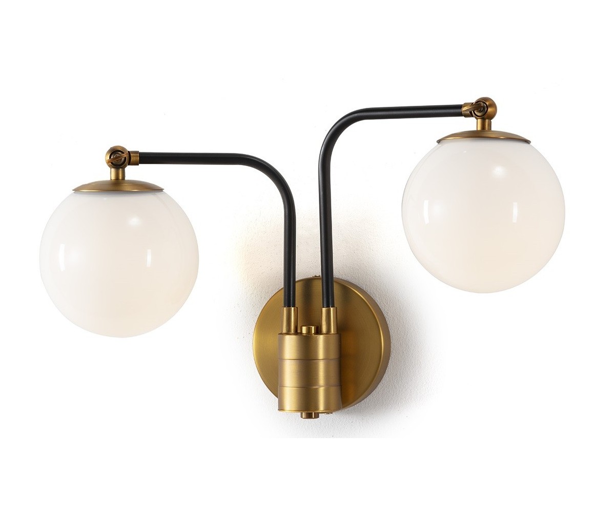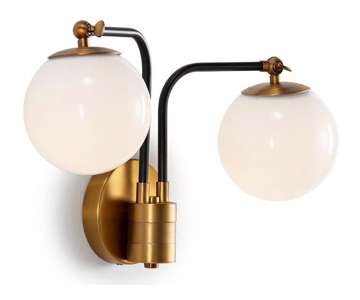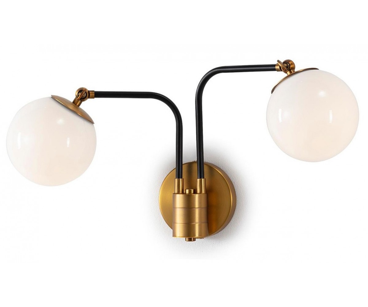 Lámpara de pared inspirada en un diseño de CTO Lighting. Fabricado en acero dorado / oro, cuerpo lacado en acero color negro, tulipas circulares en cristal opal blanco. No requiere montaje. Modelo bombilla E14 LED, incluida. Réplica con materiales originales de máxima calidad.
