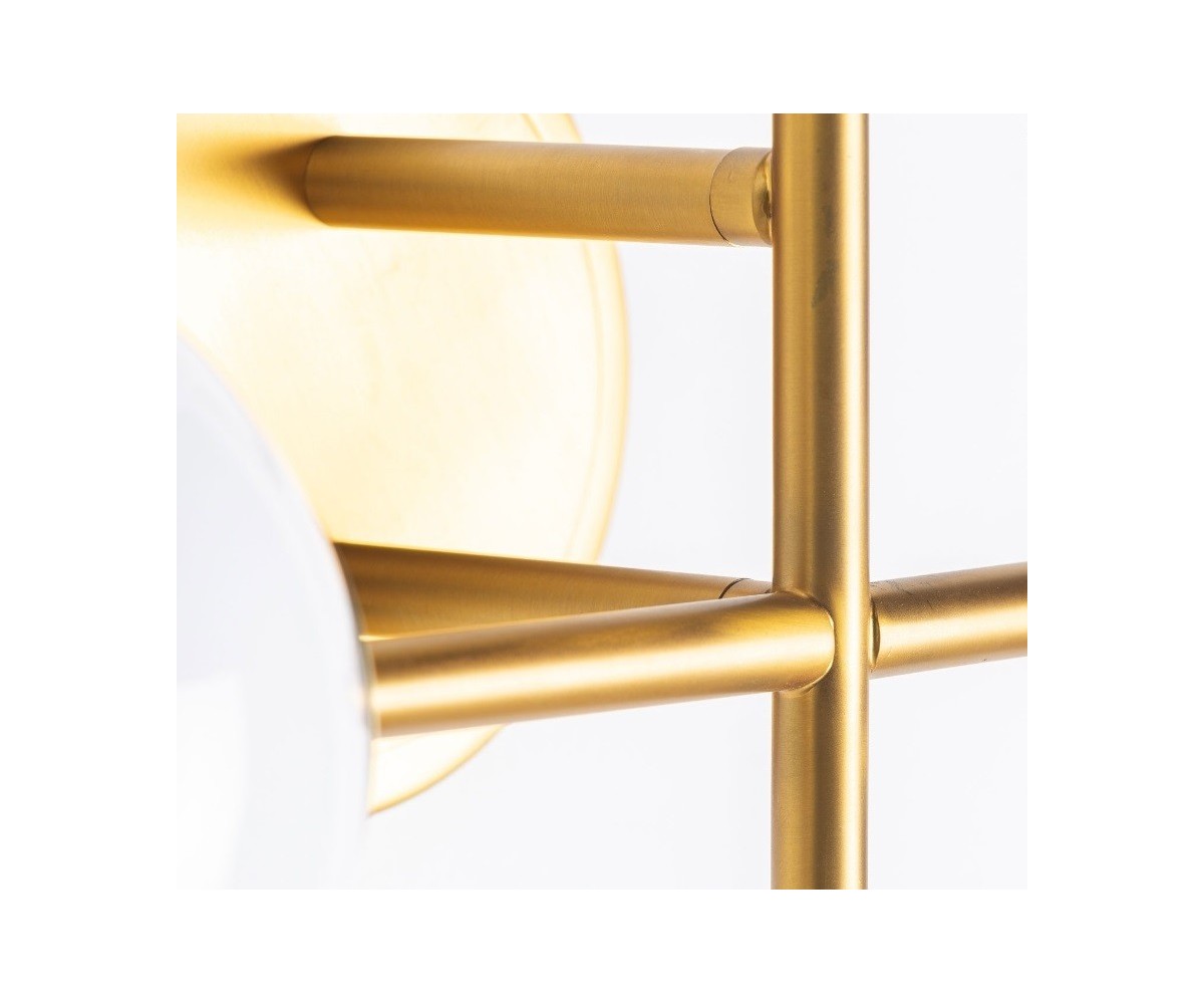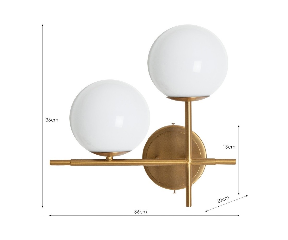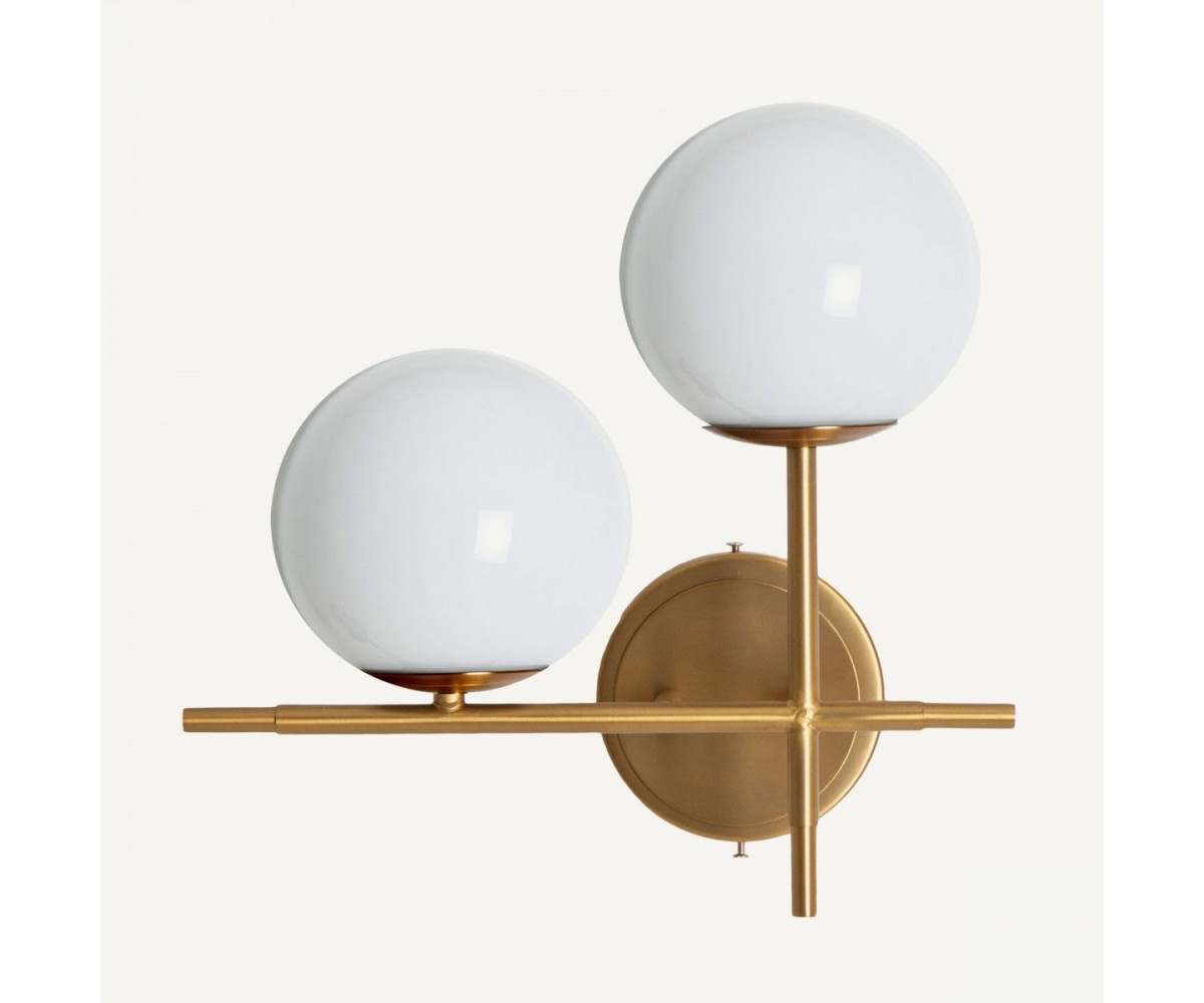 Lámpara de pared inspirada en un diseño de Eichholtz. El «art déco» y el estilo Mid Century moderno se aúnan en la impresionante lámpara de pared izquierda Senso. Dos pantallas esféricas de vidrio blanco esparcen una luz suave y cálida por toda la habitación, mientras que el acabado en acero dorado envejecido del aplique completan el conjunto con un intenso contraste. Medida de la tulipa 15x15x15. Modelo de casquillo para bombilla E14. Réplica con materiales originales de máxima calidad.