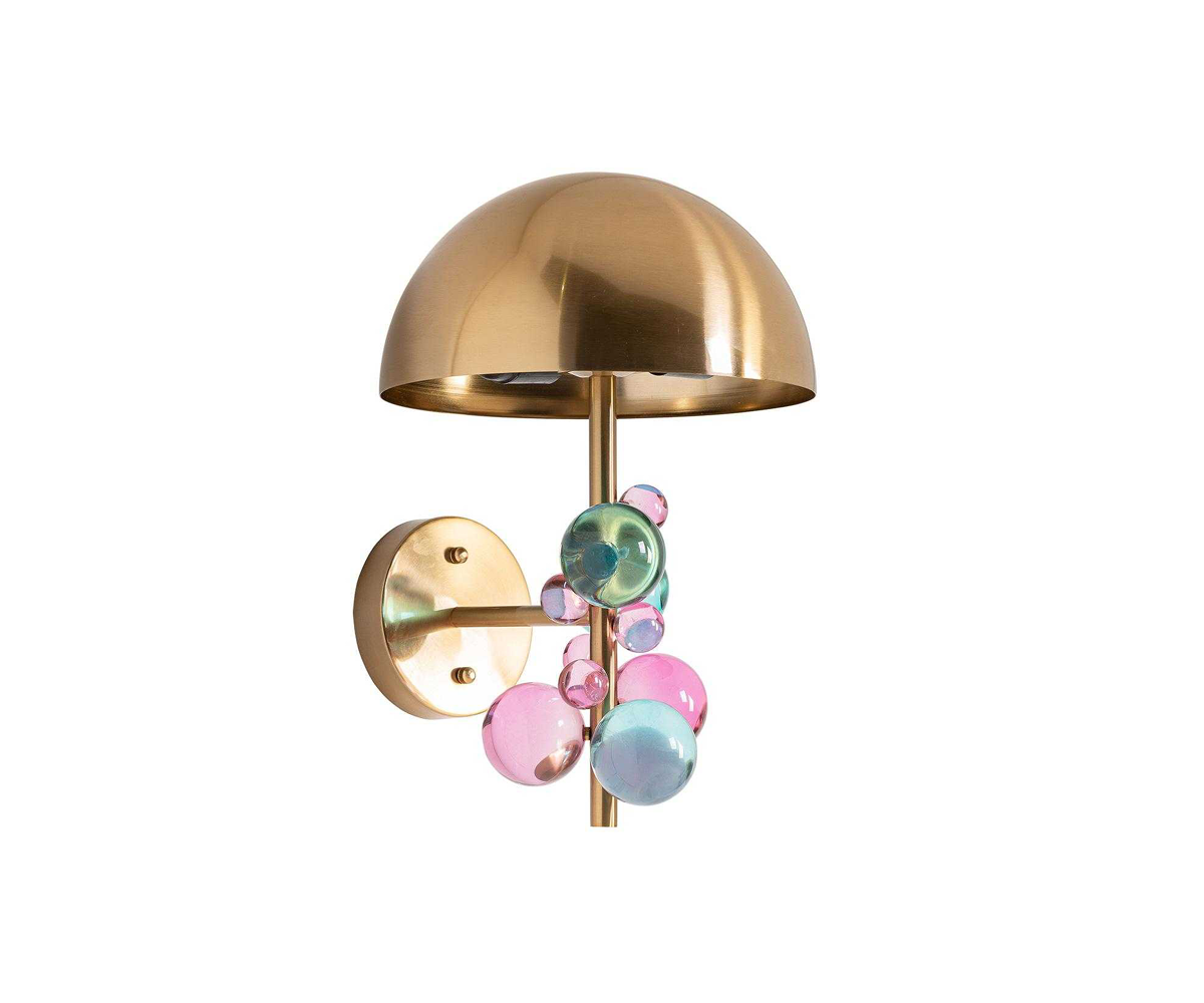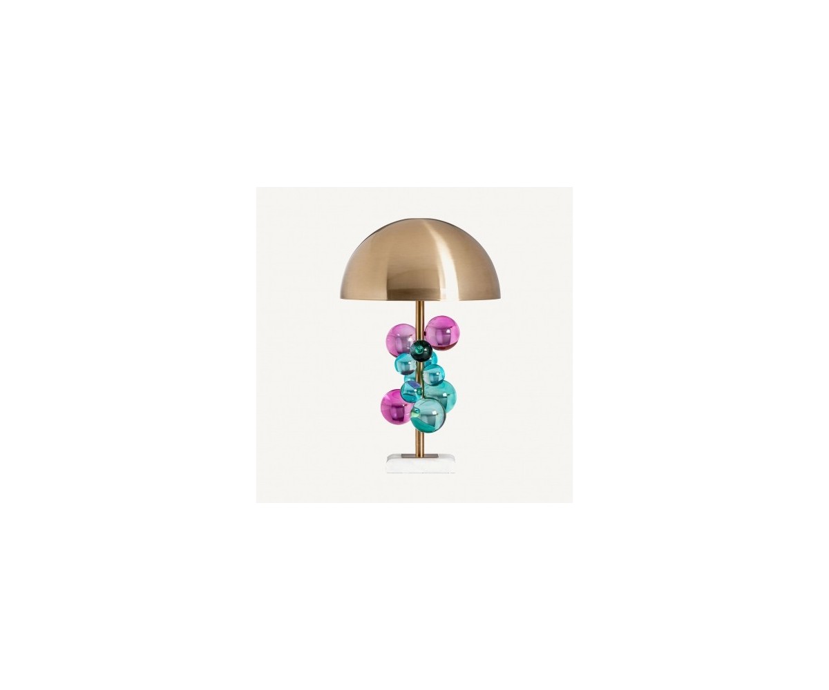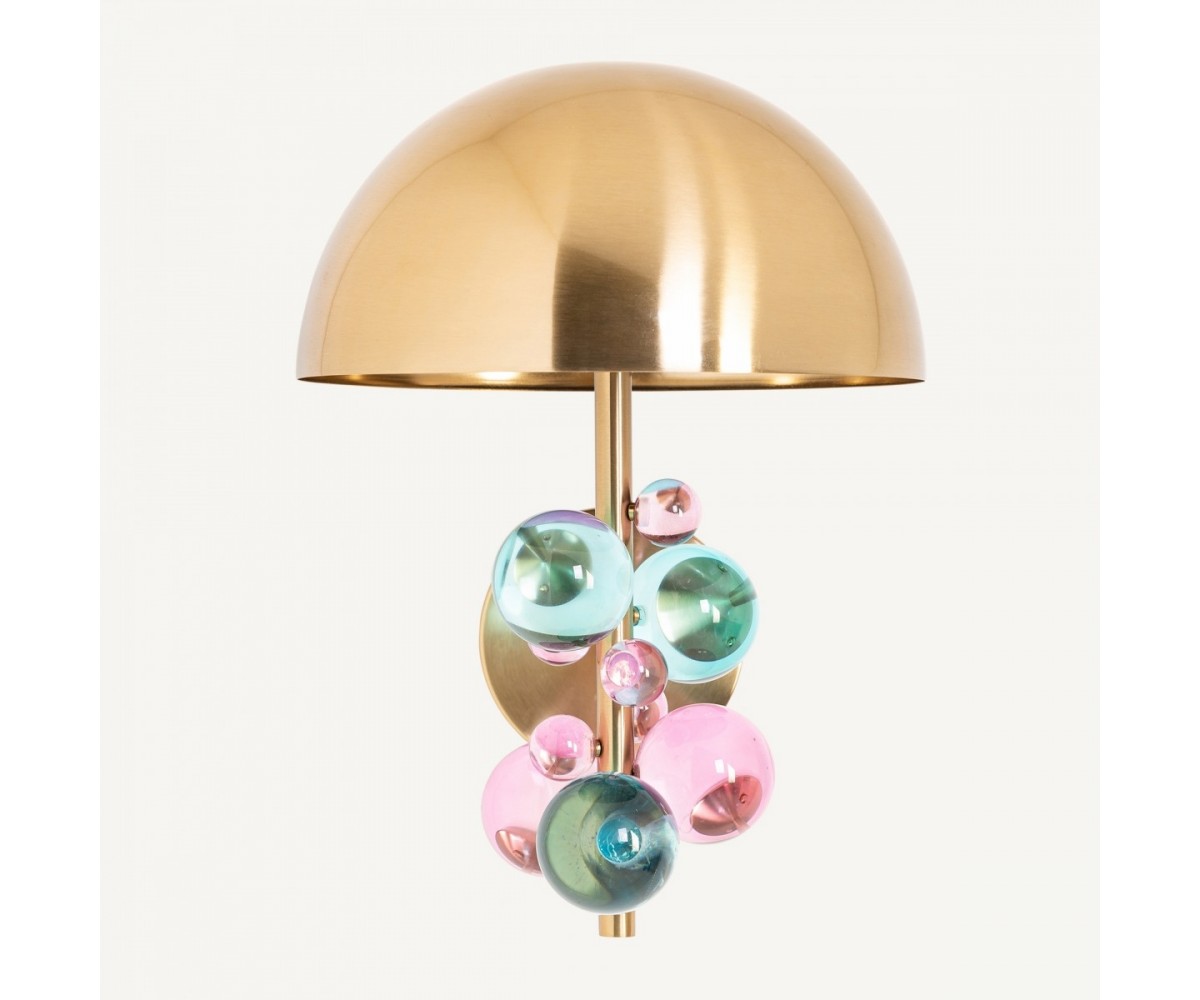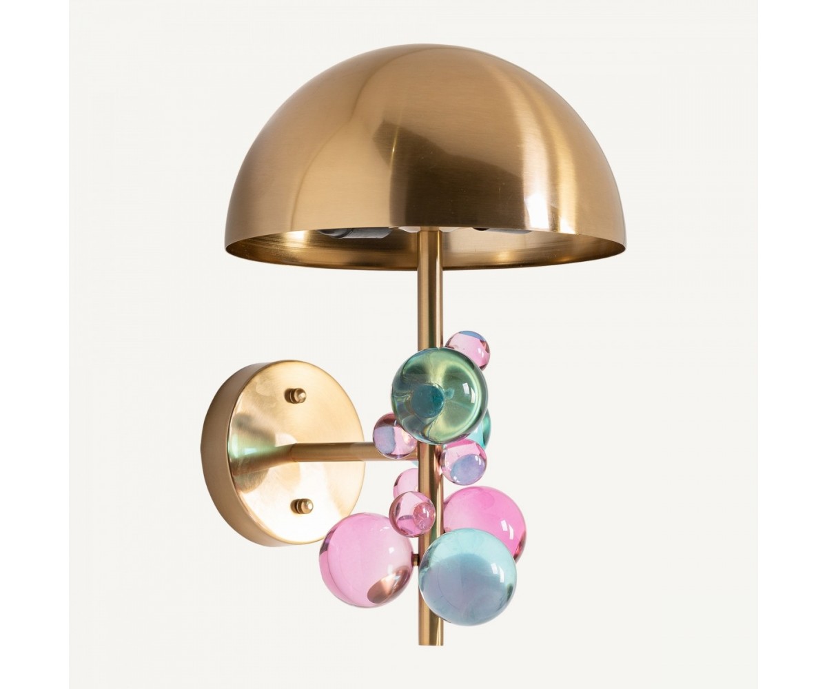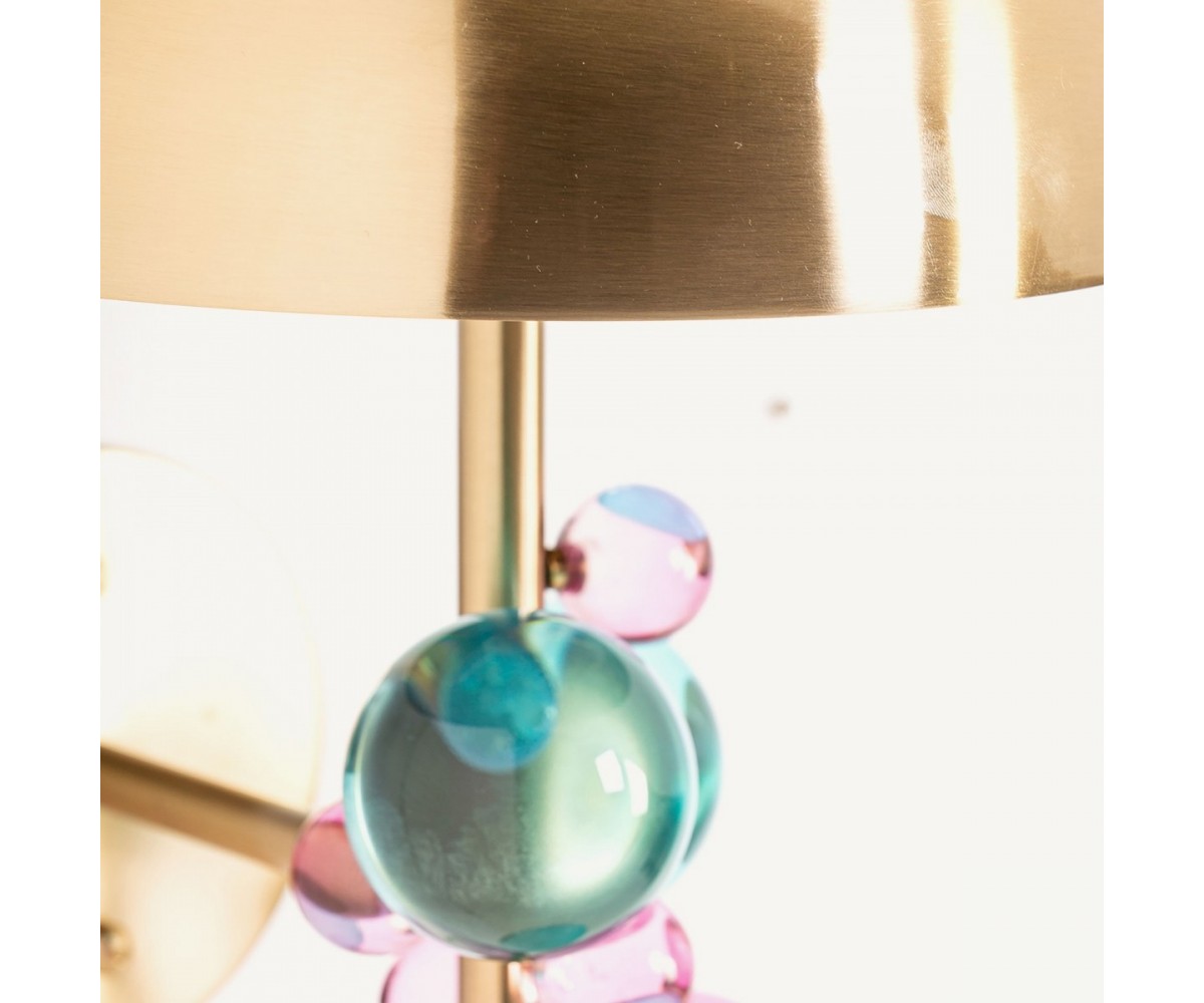 Lámpara de pared ART DECO inspirada en un diseño de Lucia Tucci. Fabricada en acero terminación dorado y bolas de vidrio multicolor. Medidas pantalla 25x25x13cm. Medidas embellecedor 12x12x2.5cm. Largo del cable 10cm. Rosca para bombilla E27 no incluida. Peso total 3 kg. También disponible en lampara de sobremesa. Réplica con materiales originales de máxima calidad.