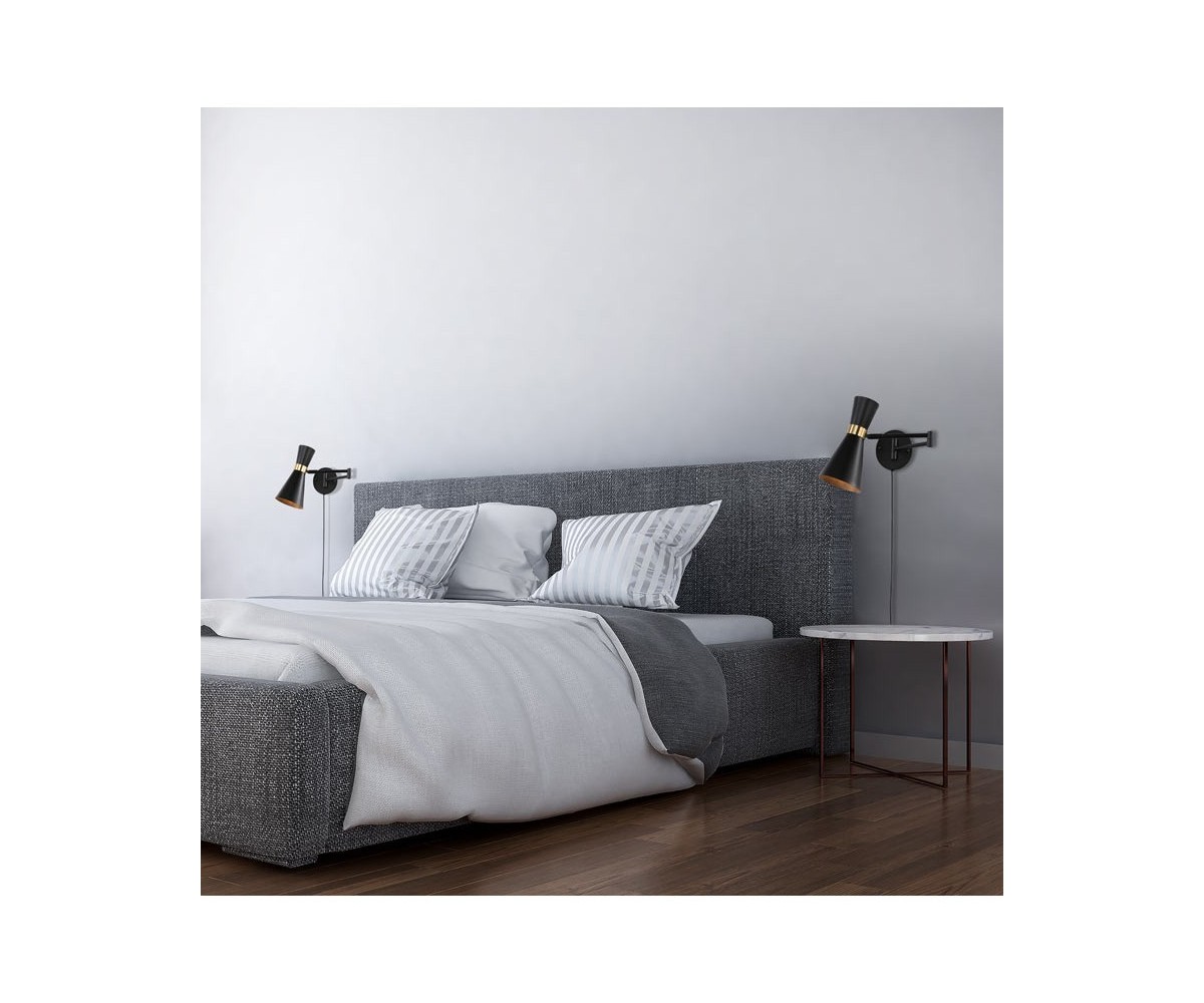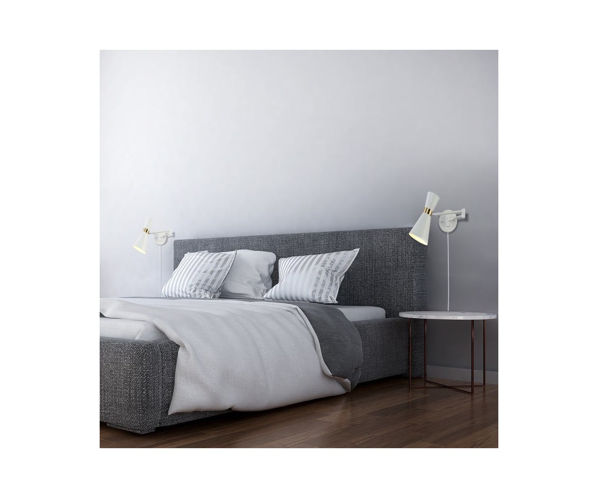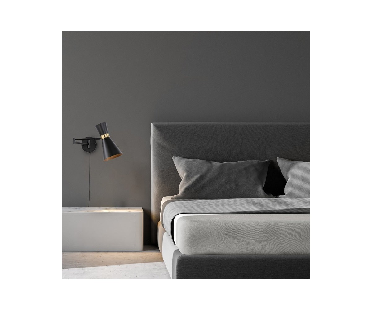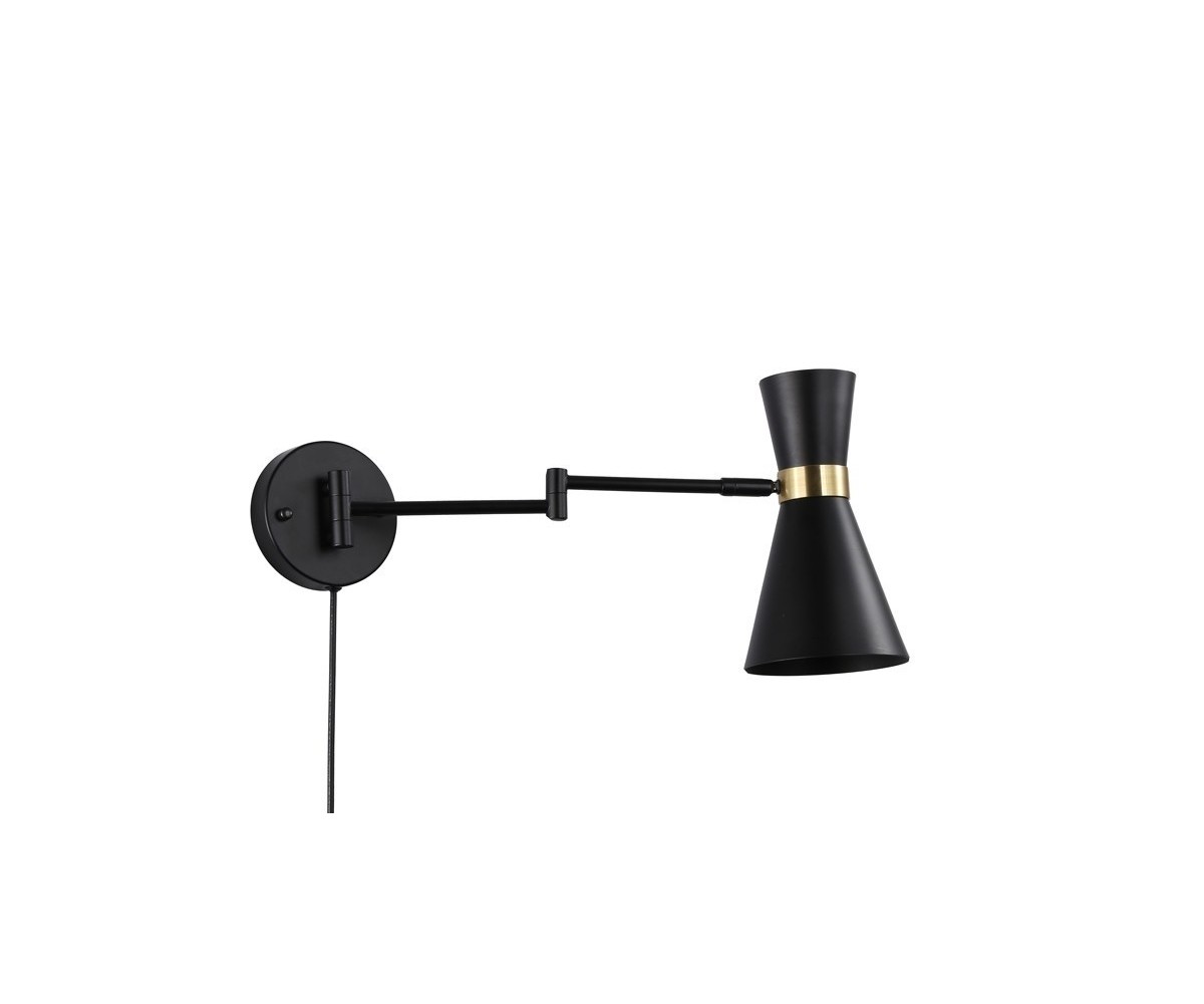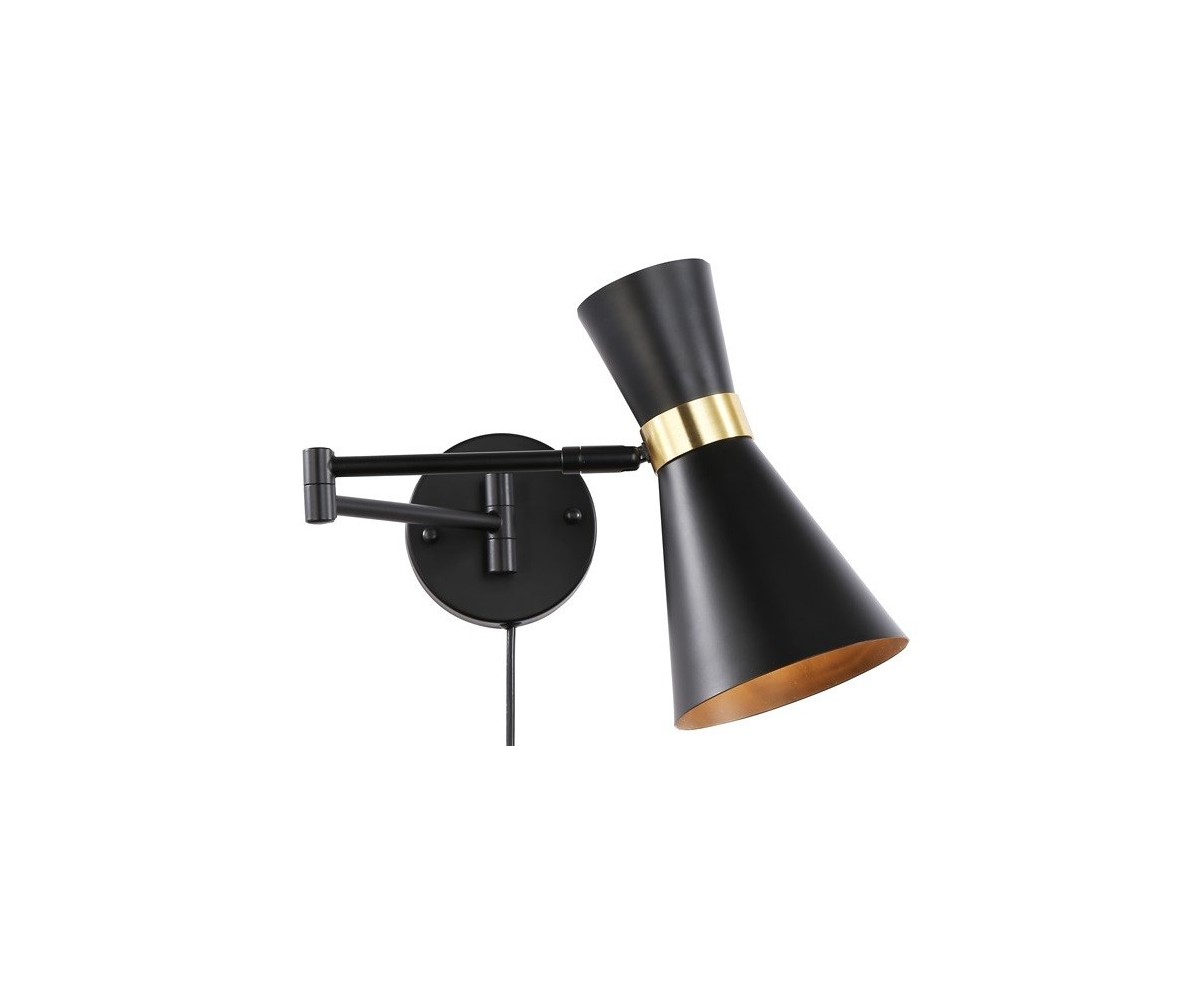Aplique de pared con brazo articulado, inspirada en un diseño de Mike Treanor. Doble pantalla en forma de cono en acero lacado color negro o blanco, agarre central en acero dorado. Con su brazo articulado se puede orientar a cualquier dirección. Se puede conectar directamente a un punto de luz en la pared o con su cable y enchufe. Largo del cable 165 cm, para ajustarlo a la altura que desees. Rosca para bombilla E27, máximo 60w. Tensión nominal 220-240V/AC. Réplica con materiales originales de máxima calidad.