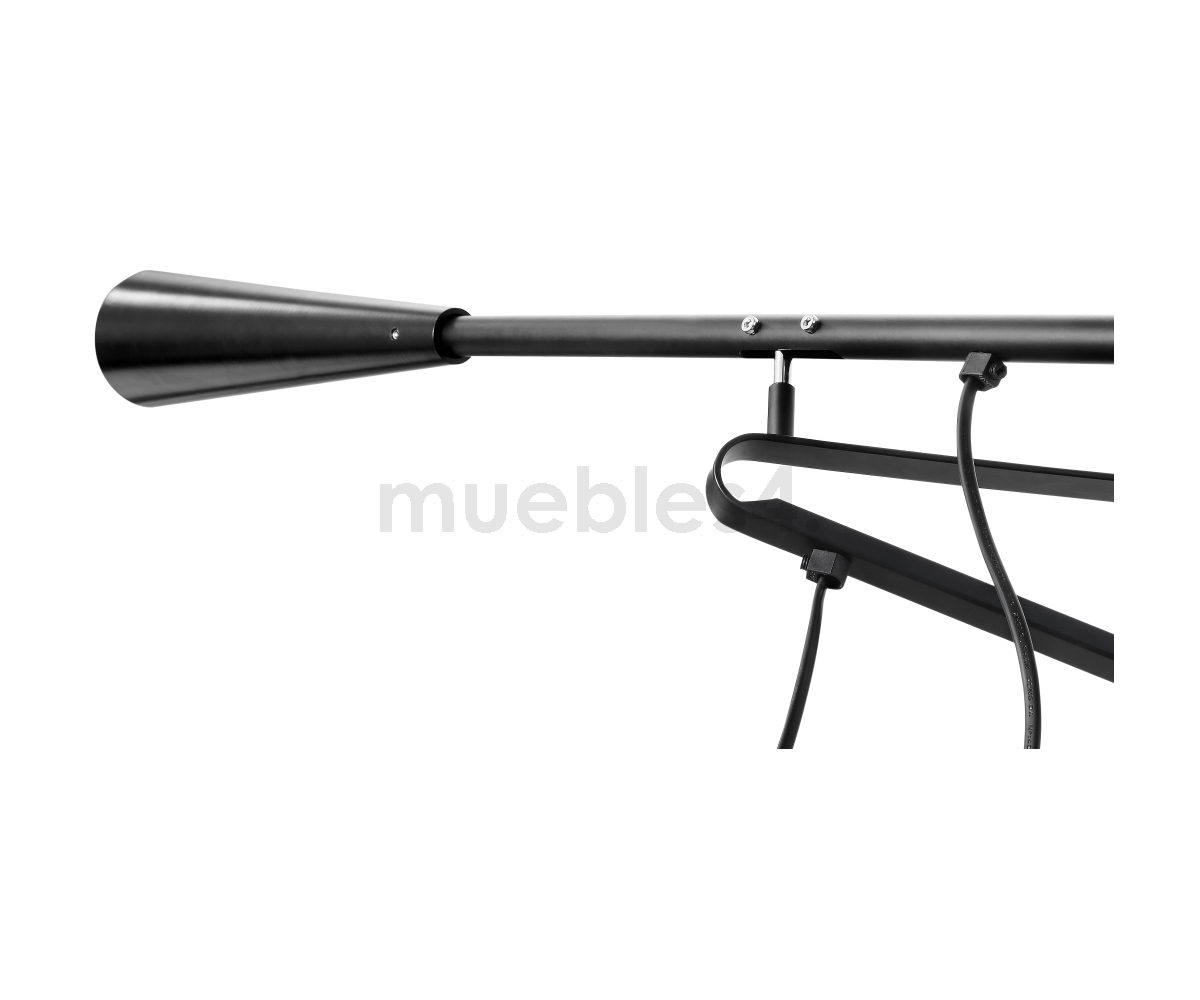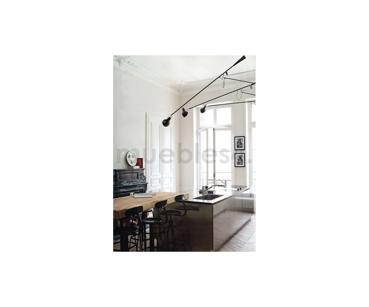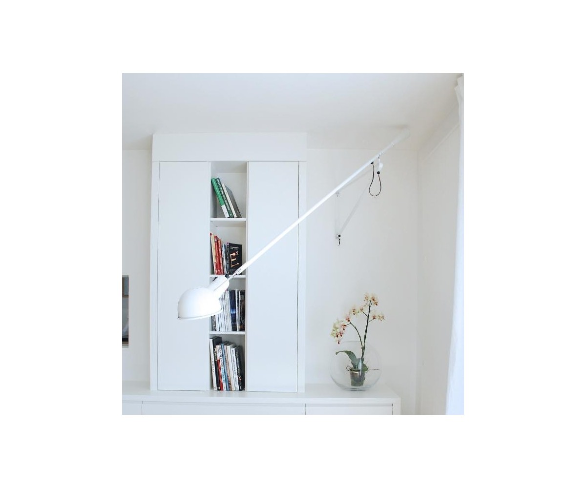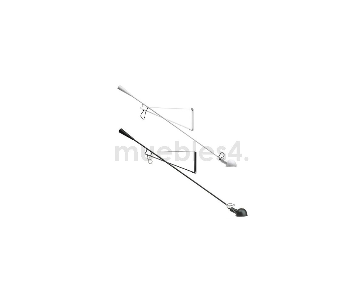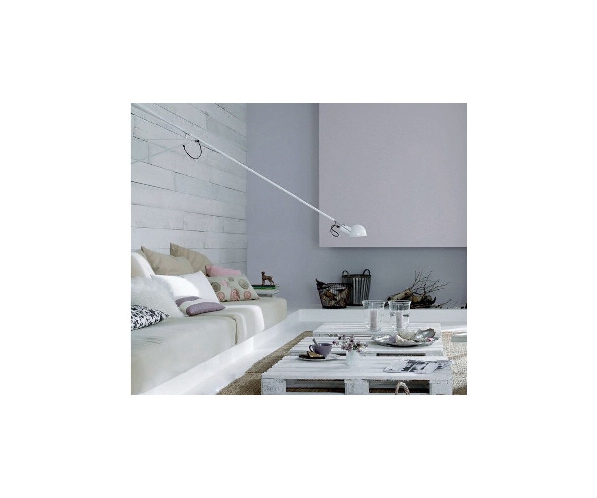 Lámpara aplique de pared inspirada en un diseño de Paolo Rizzatto. Emite una luz directa, muy versátil ya que es orientable tanto en horizontal como en vertical, abarcando un radio de 180 cm., su reflector es igualmente orientable y basculante. Se fija directamente a la pared, para que la lámpara sea estable y poderlo poner en la posición deseada, dispone de un contrapeso con forma cónica en fundición.