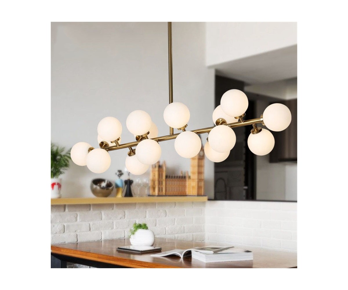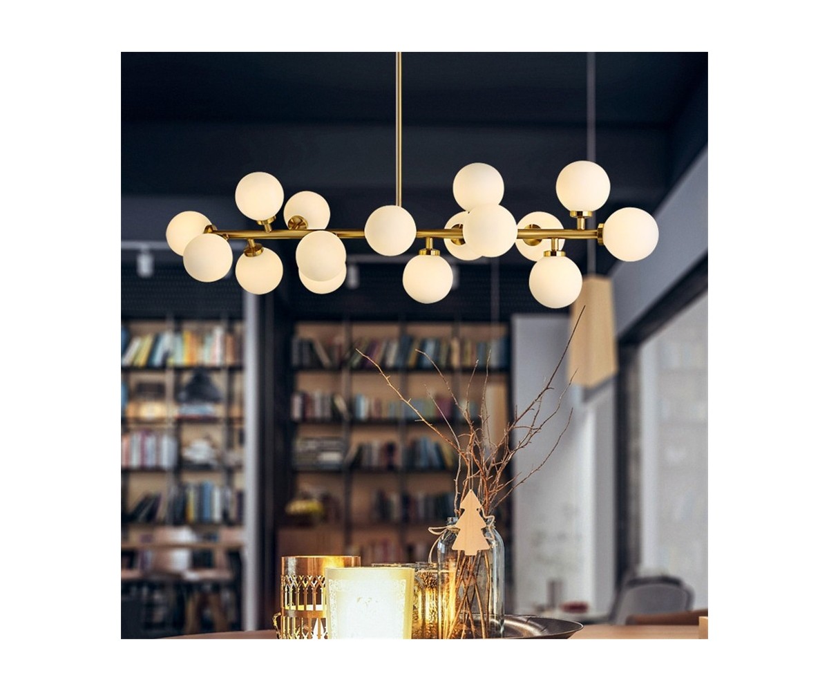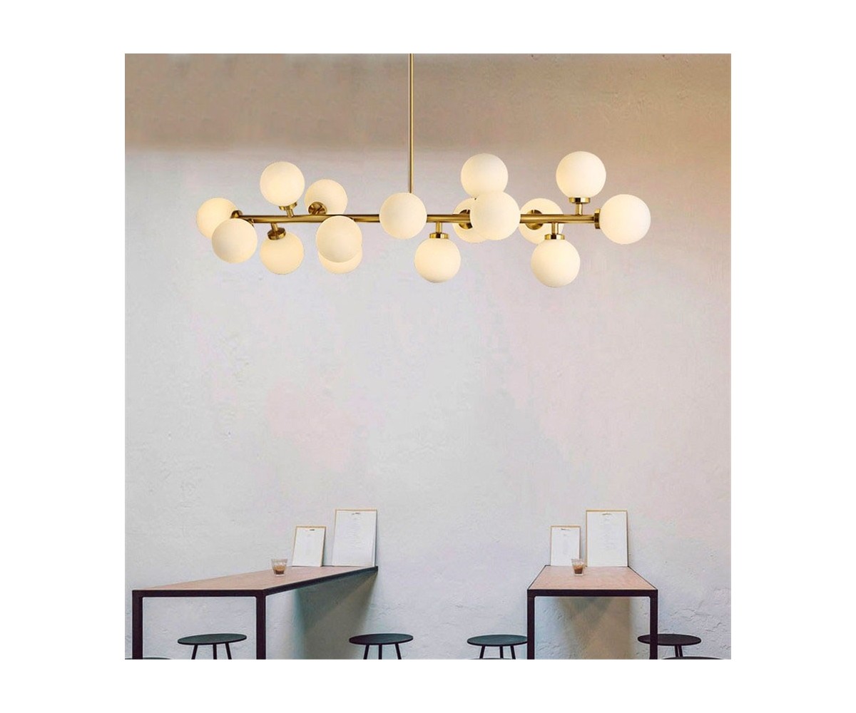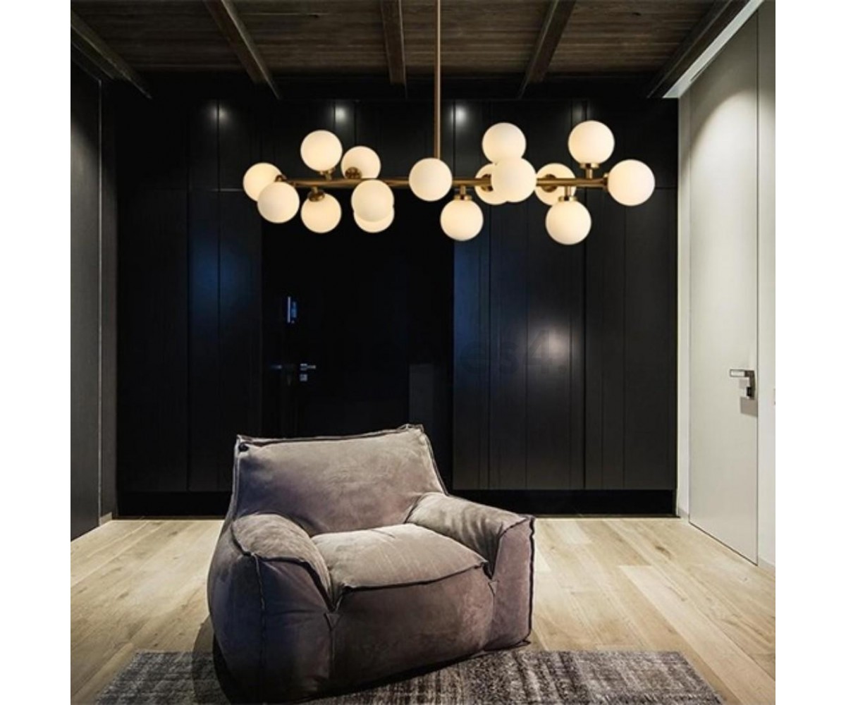 Lámpara de techo inspirada en un diseño de Atelier Areti. Fabricada en acero tubular envejecido, compuesta por 16 globos de cristal terminación blanco. Réplica exacta con materiales originales de máxima calidad.