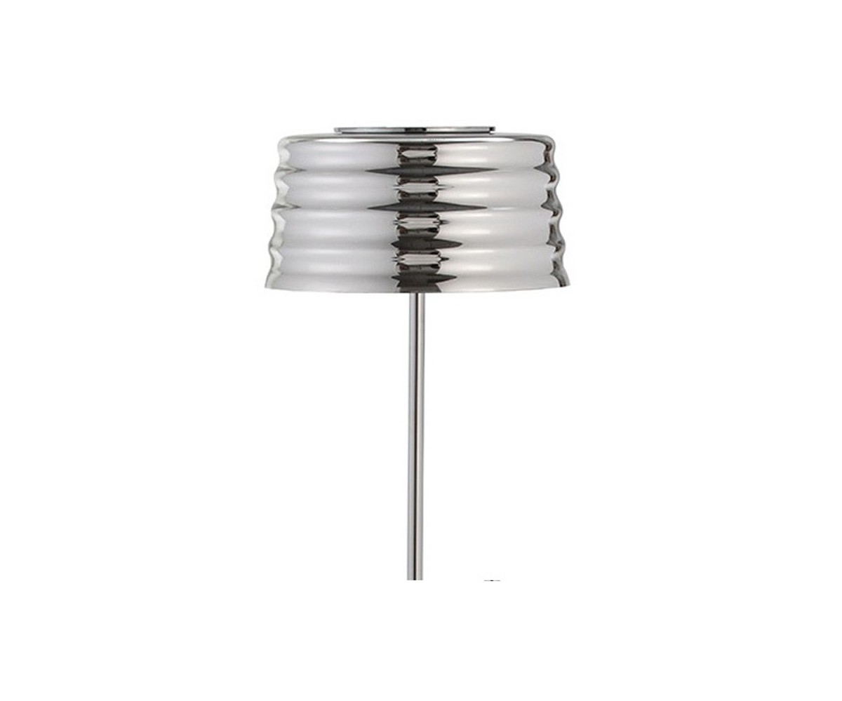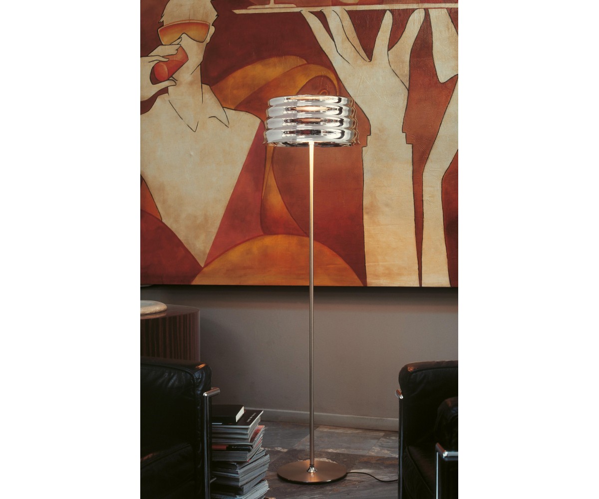 Lámpara de suelo inspirada en un diseño de Massimo Belloni / Umberto Asnago para Penta. Base y pie tubular fabricado en acero terminación brillo, tulipa circular en cristal templado efecto espejo haciendo ondas. Réplica exacta con materiales originales de máxima calidad.
