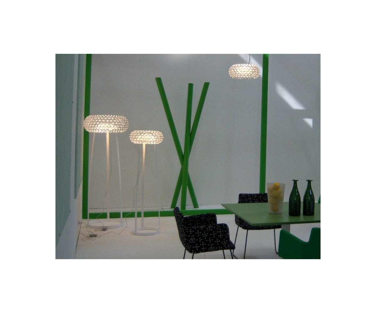 Lámpara suelo pantalla circular, inspirada en un diseño de Patricia Urquiola y Eliana Gerotto. Pantalla fabricada por esferas en acrílilco/metacrilato transparente. Vástago en acero compuesto por tres soportes que unen la base redonda del suelo con el recuerdo de la forma esférica del difusor. Modelo de bombilla R7S (1X200W). Largo del cable 170cm. Hace falta montaje. Réplica exacta con materiales originales de máxima calidad.