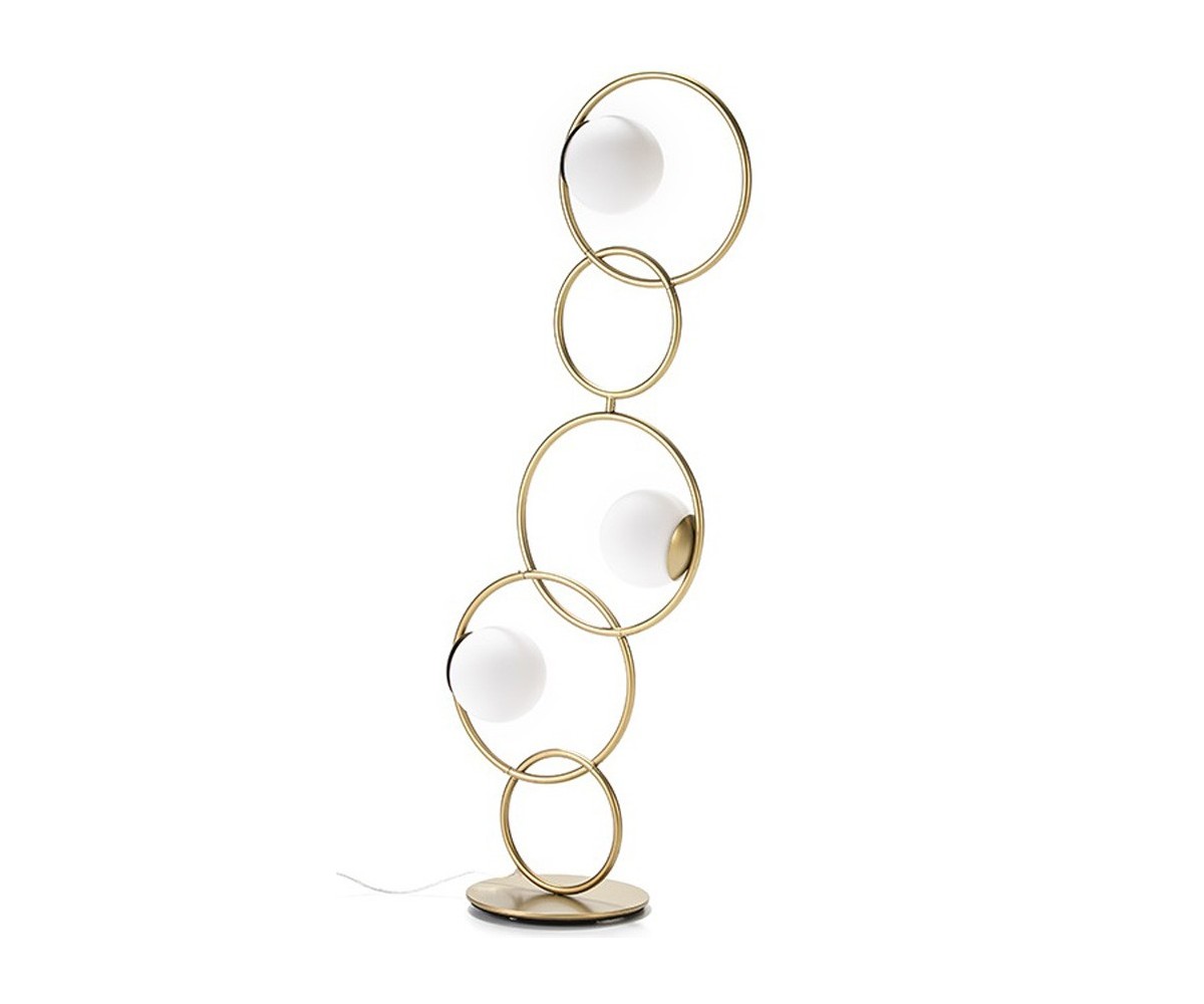 Lámpara de suelo inspirada en un diseño de Melissa Lunardi e Massimo Tonetto para Venicem. Armazón fabricame mediante aros tubulares en acero de máxima calidad, terminación dorado. Tulipas circulares en cristal templado color blanco. Disponible en lámpara de sobremesa. Réplica exacta con materiales originales de máxima calidad.