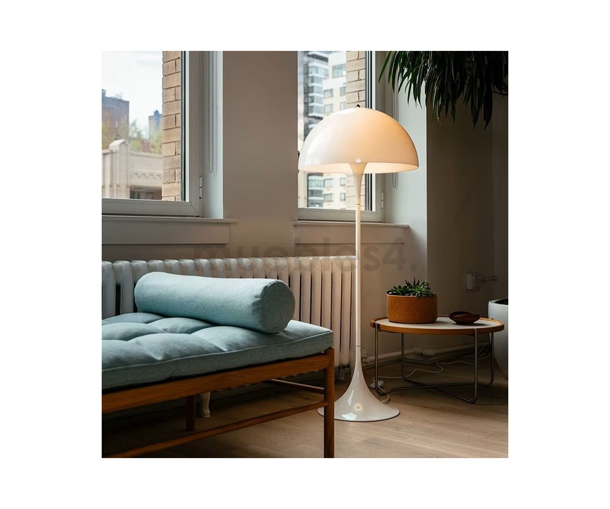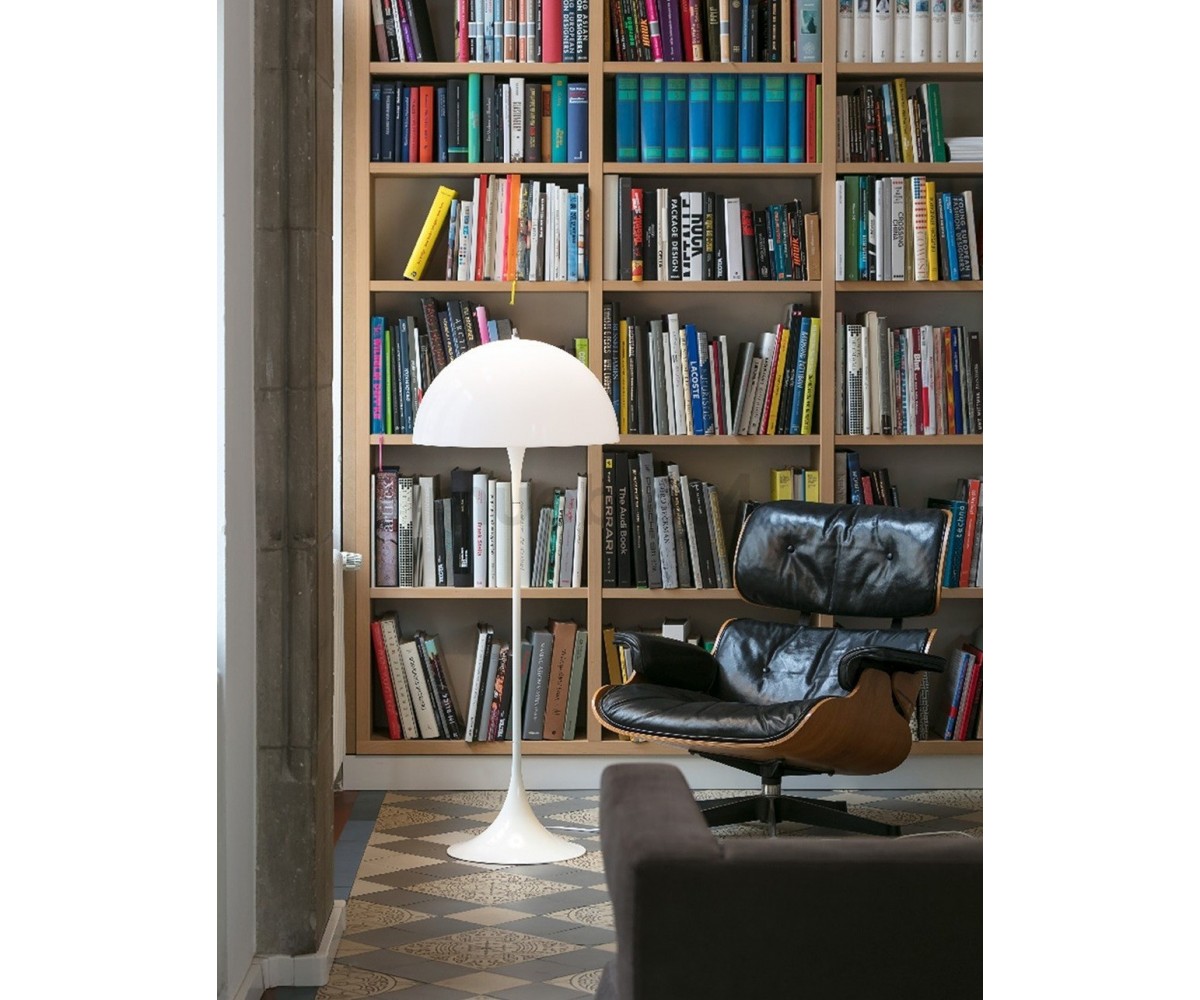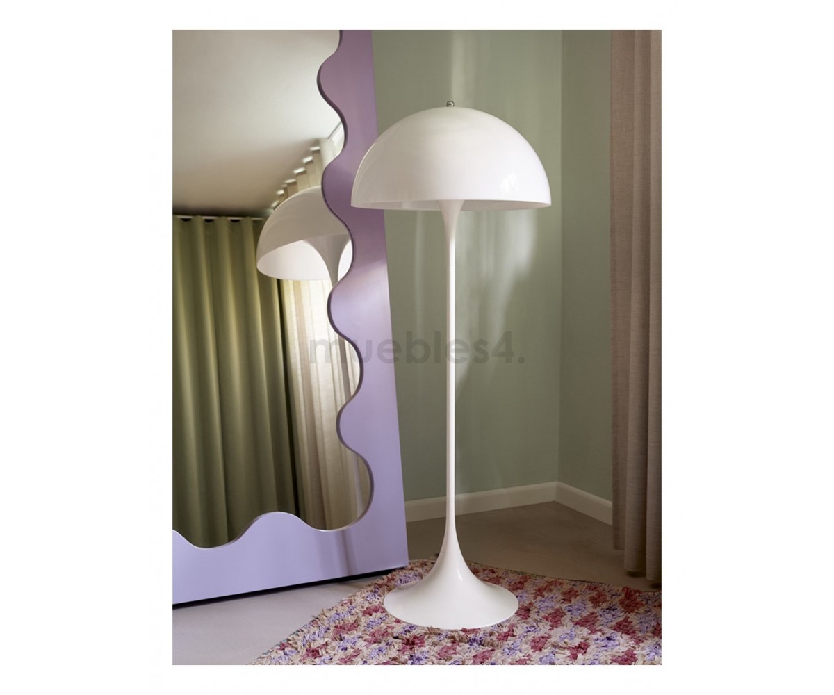 Lámpara de suelo danesa inspirada en un diseño de Verner Panton para Louis Poulsen. Destaca por sus formas delicadas de inspiración orgánica y una pantalla de diseño semiesférico. La pantalla se convierte en el elemento central de esta pieza. Se convirtió en uno de los referentes más destacados en la escena del interiorismo de la década de los años 20. Esta luminaria salió al mercado en 1971 y ha recibido el premio iF Design Award.