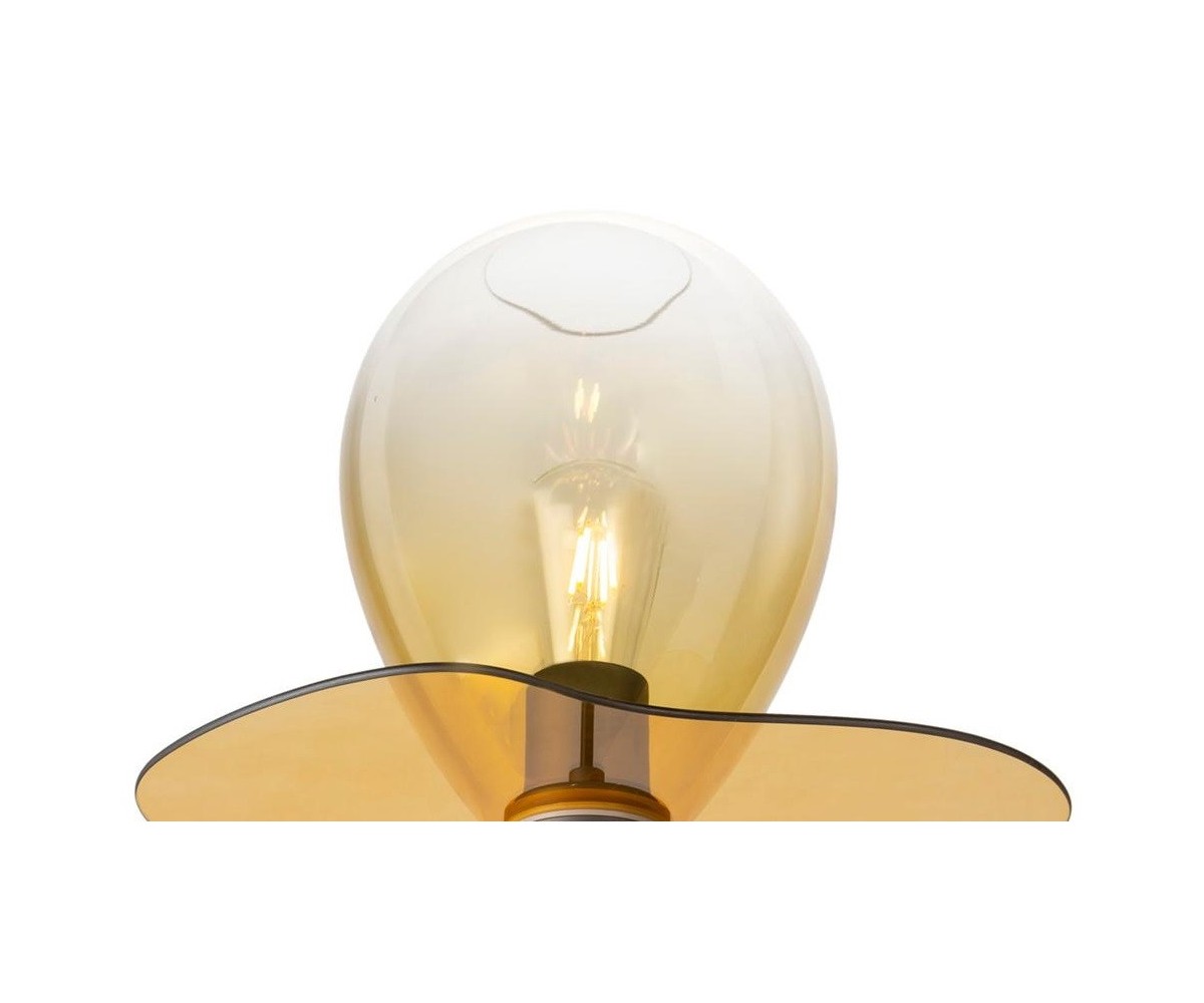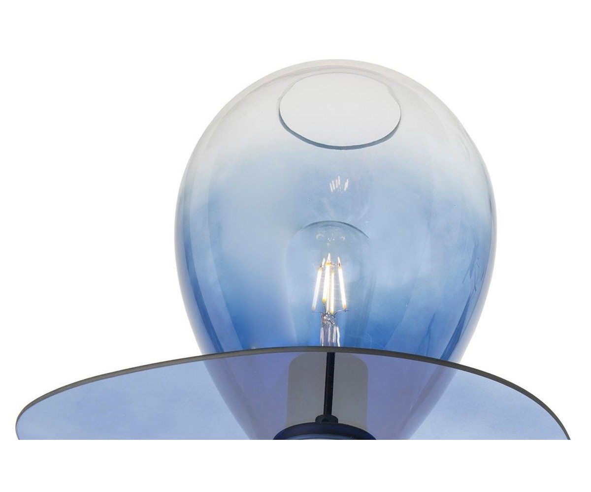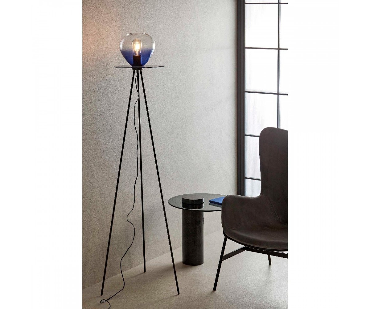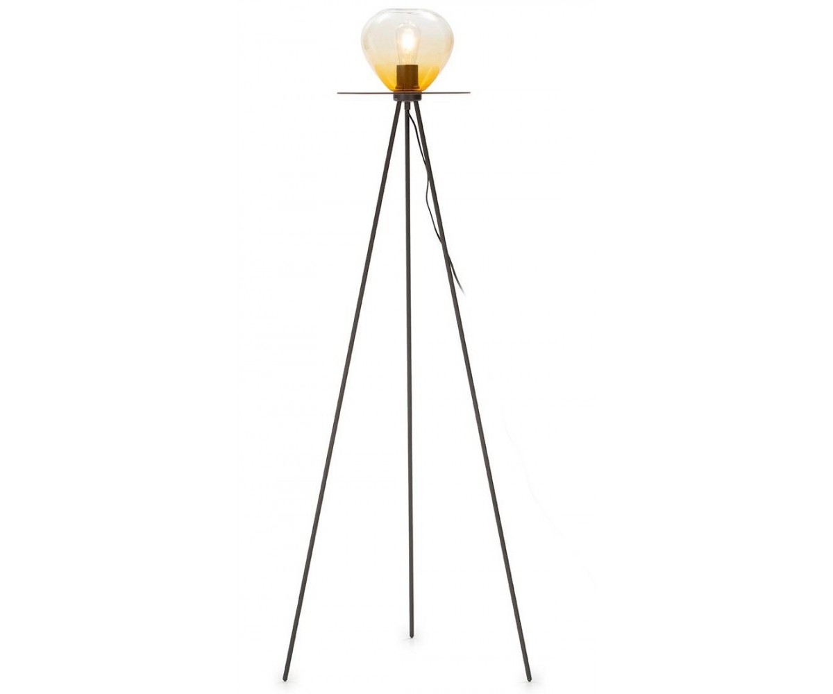 Lámpara de suelo inspirado en un diseño de Wilhelm Wagenfeld. Base en acero tubular lacado al horno en color negro formado un trípode. Tulipa en cristal soplado color ambar o azul. También disponible en lámpara de techo. Casquillo para bombilla E27 Led, no incluida. Réplica con materiales originales de máxima calidad