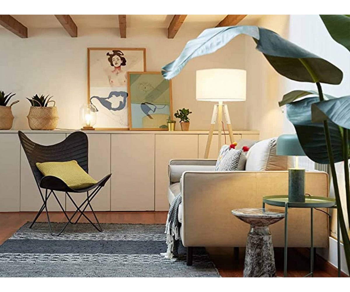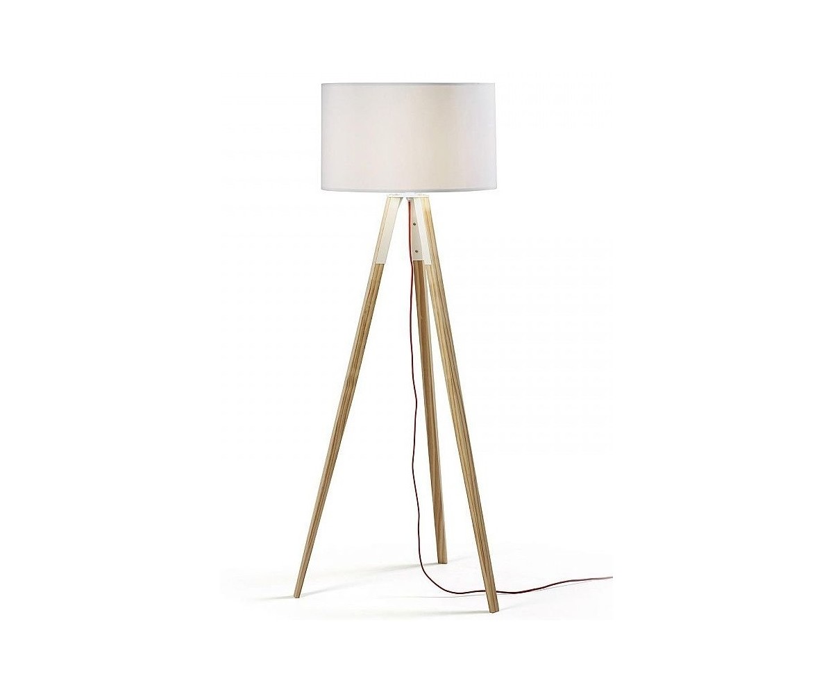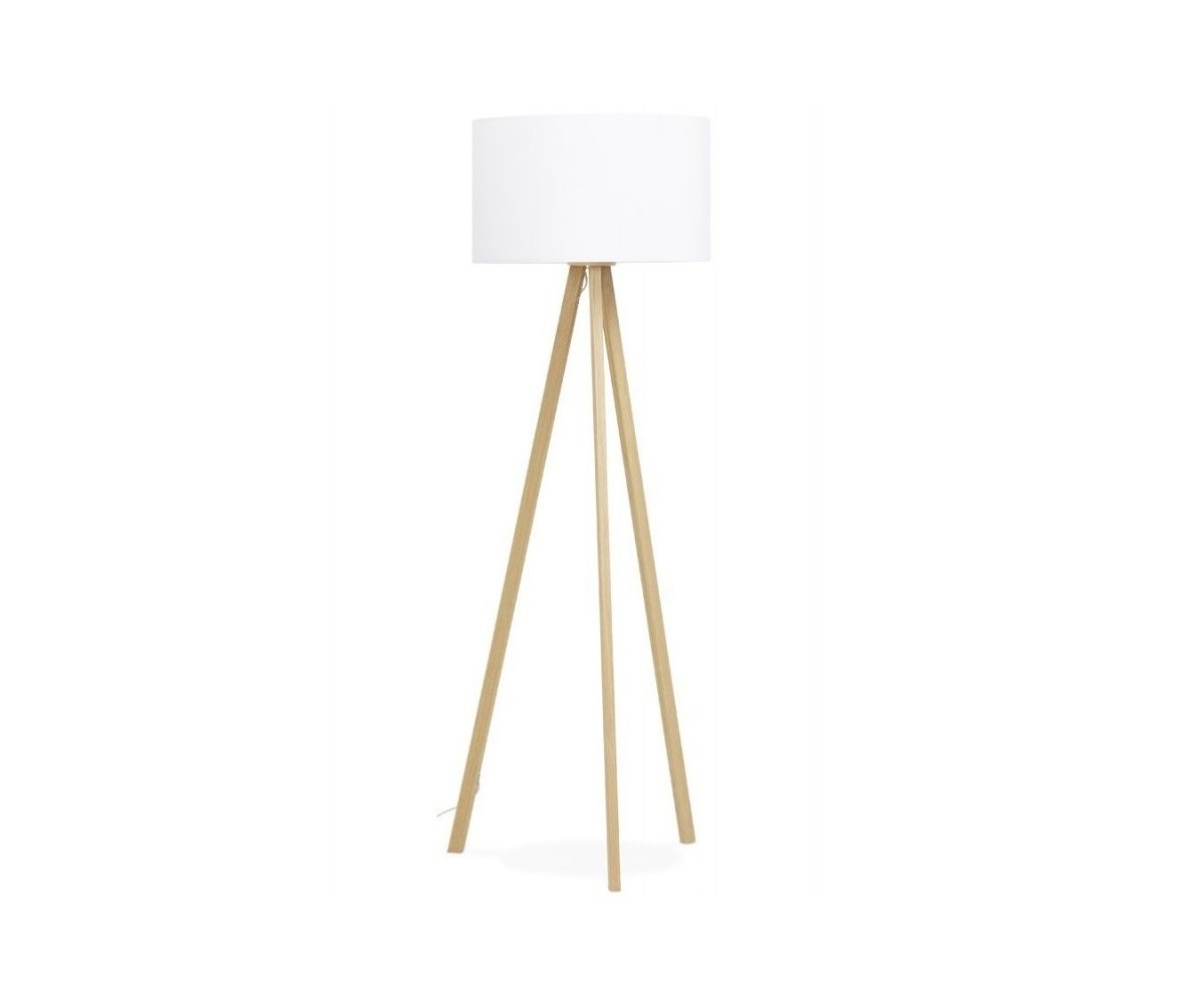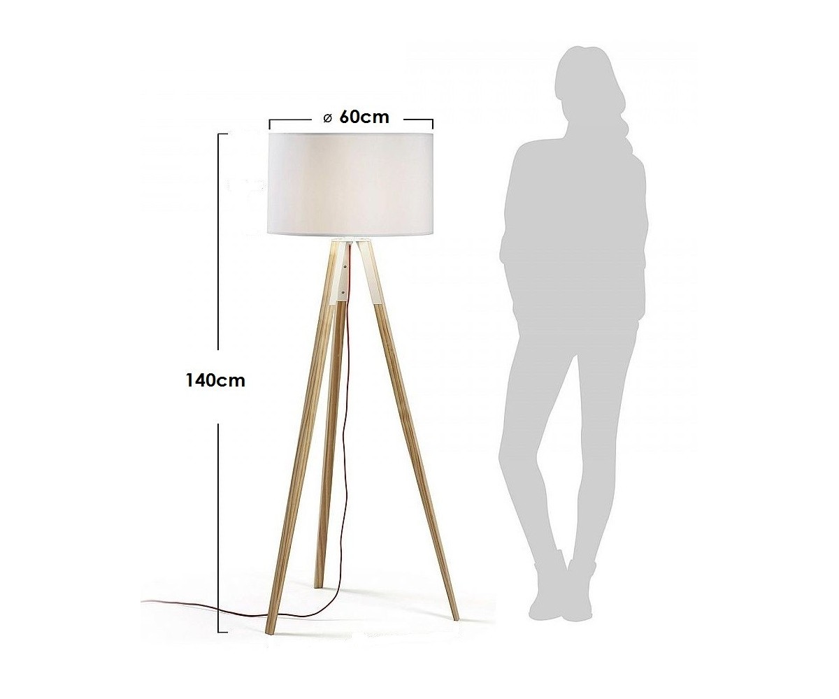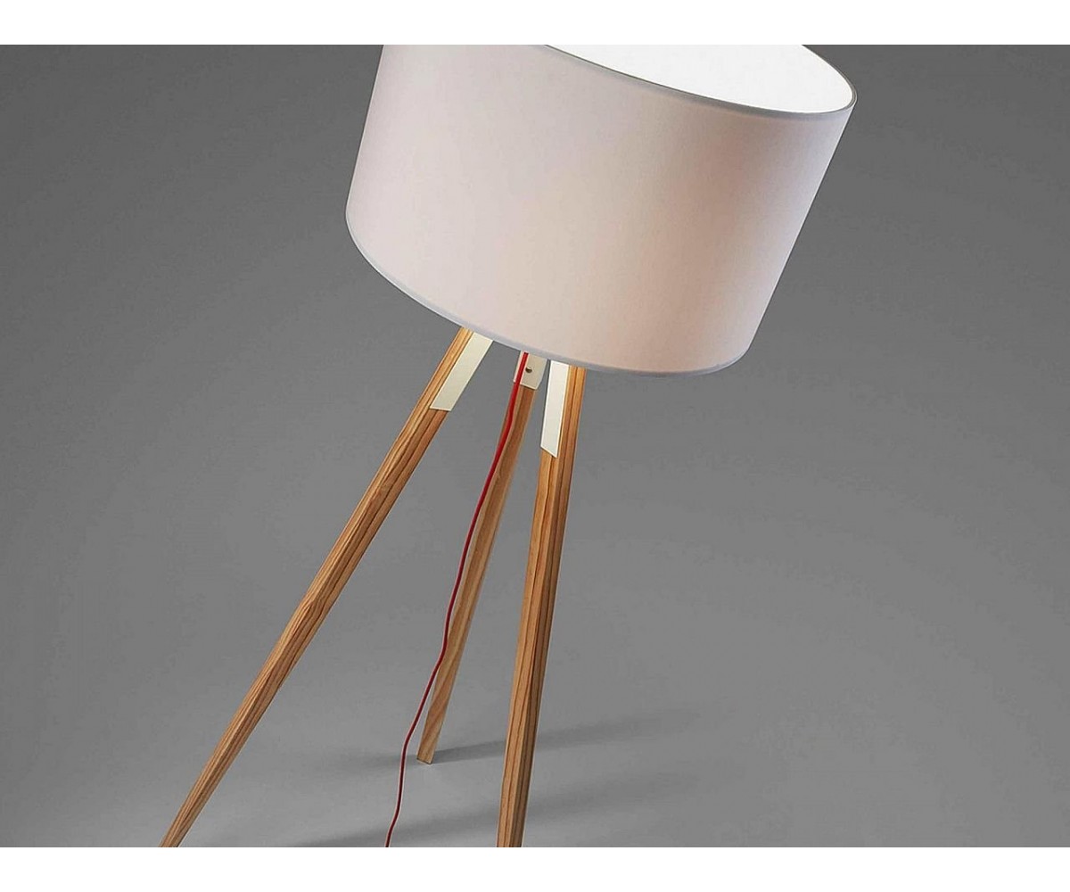 Lámpara de suelo inspirada en un diseño de J. Kanvisky. Base de tres patas formando un trípode fabricada en madera de roble claro. Tulipa circular color blanco. Modelo de bombilla E27 no incluida. Réplica con materiales originales de máxima calidad.