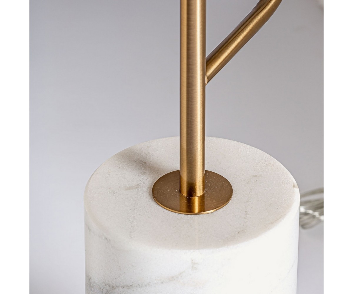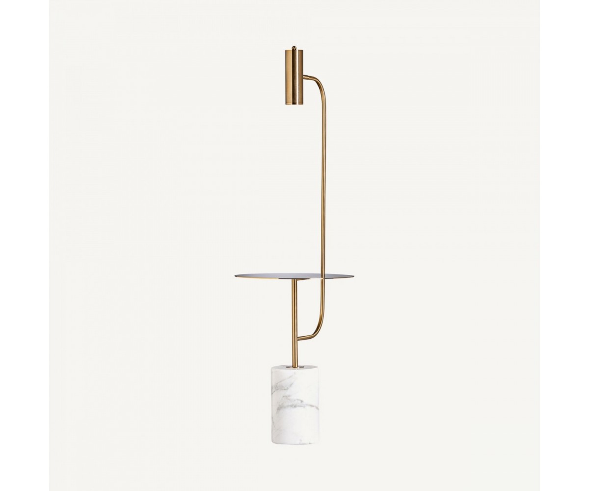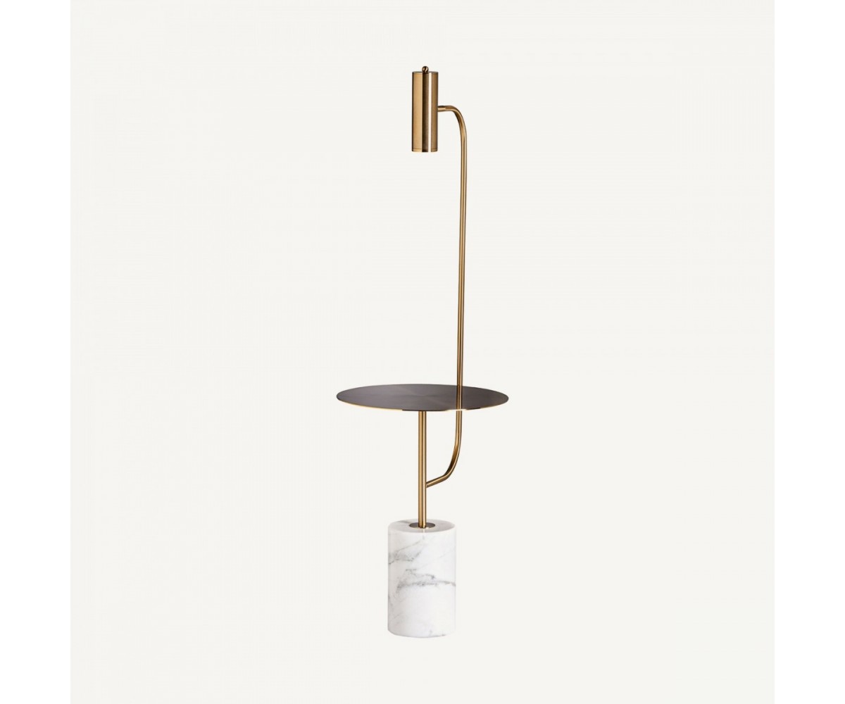 Lámpara de suelo inspirada en un diseño de Kelly Wearstler. Cuerpo fabricado en acero tubular dorado, foco tubular orientable en acero dorado, base circular en mármol blanco. Sobre de chapa de acero dorado. Modelo de bombilla GU10. Peso total 18kg. Largo del cable 190cm, interruptor a 16cm. Réplica con materiales originales de máxima calidad.