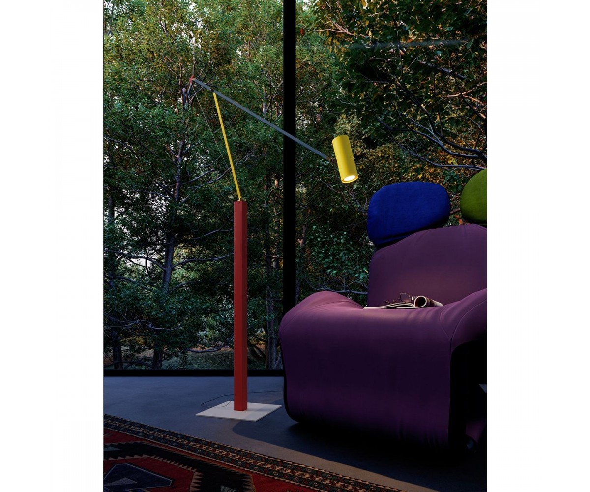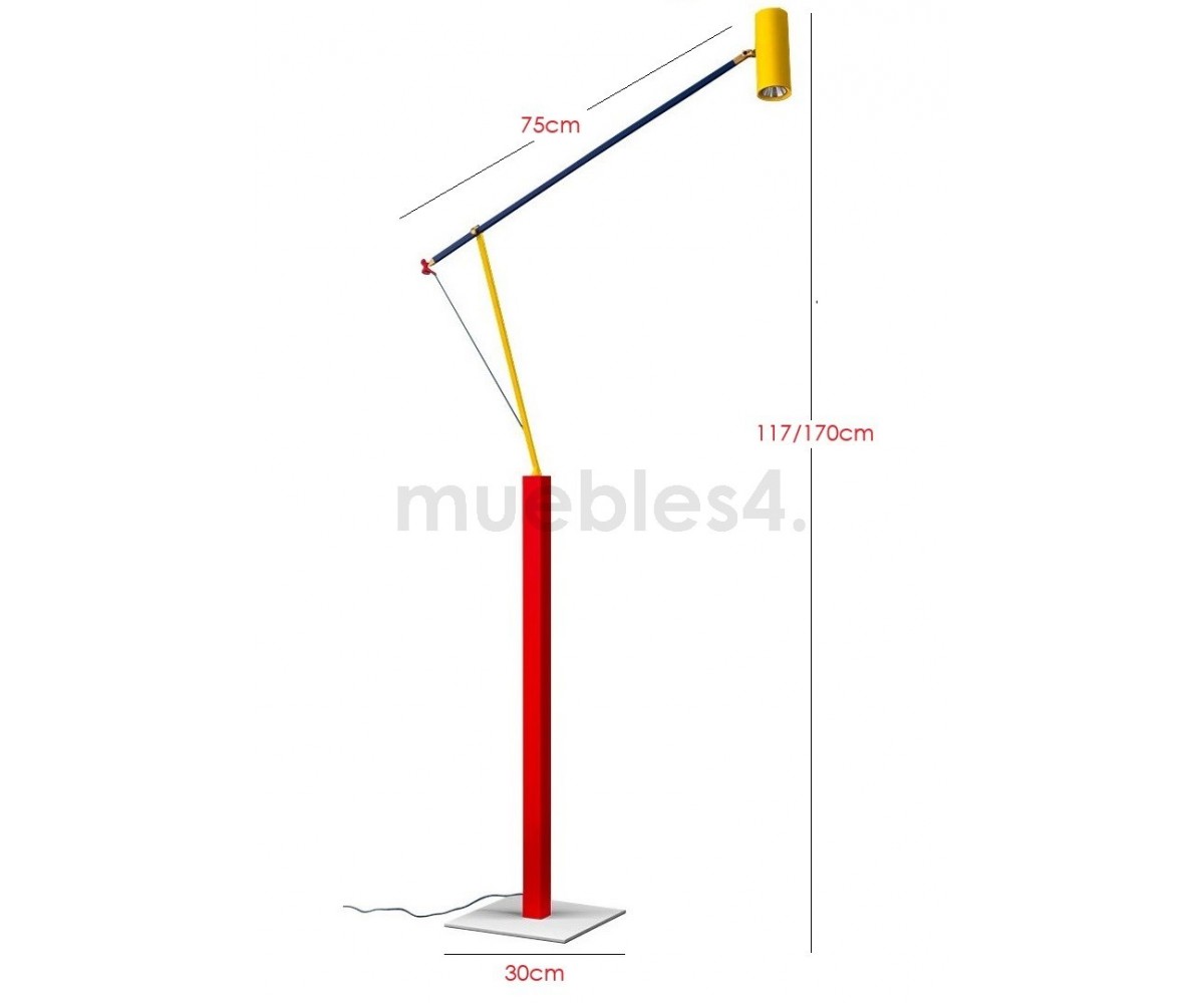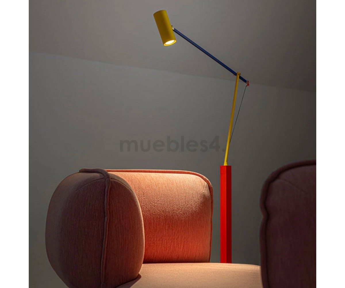 Lámpara de suelo inspirada en un diseño de Catellani & Smith. Versión de colores, mezclando el azul, amarillo y rojo. Ettorino T fue diseñada como lámpara de escritorio, para ofrecer una iluminación correcta en la superficie de trabajo, gracias a la posibilidad de movimiento y rotación de la lámpara.