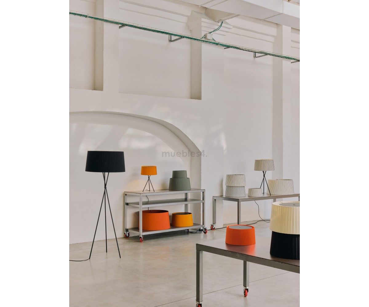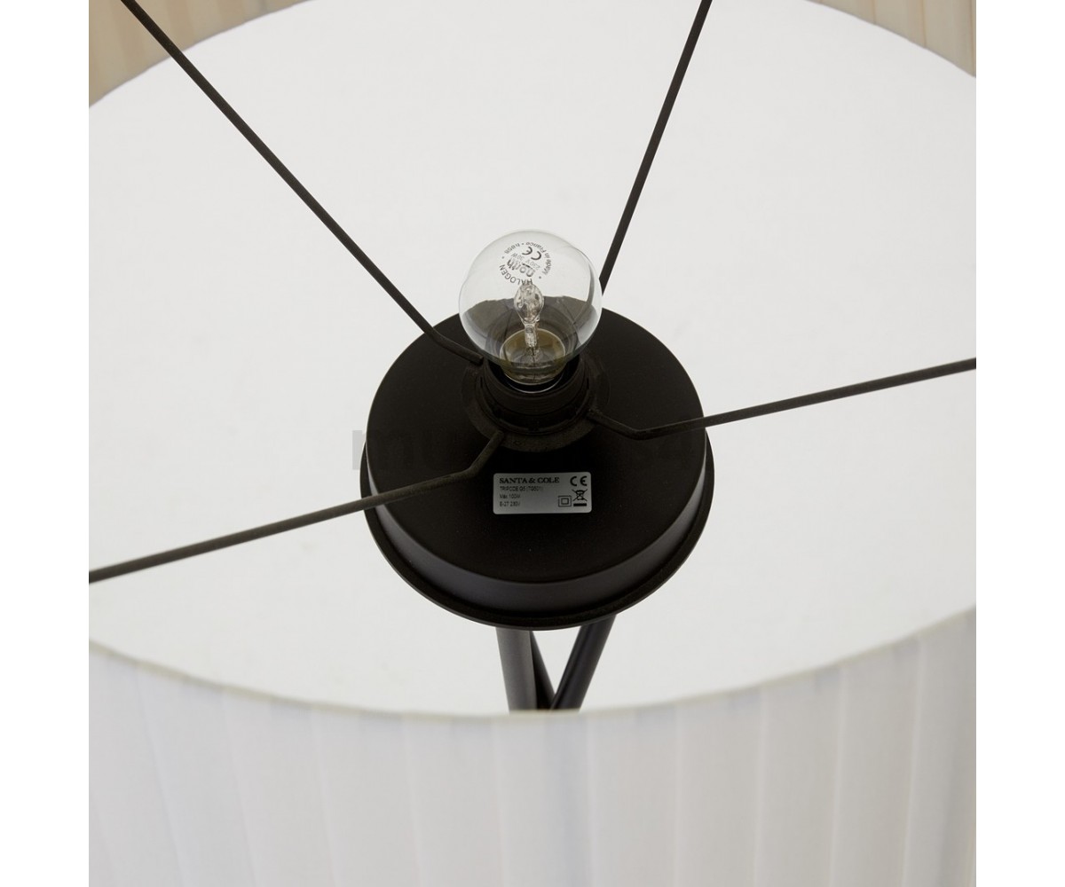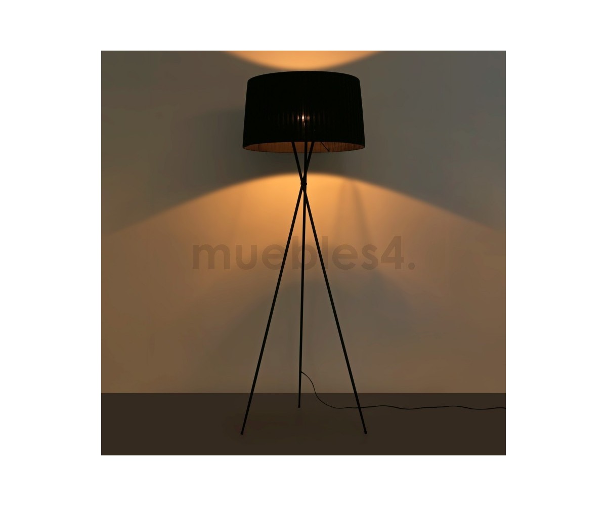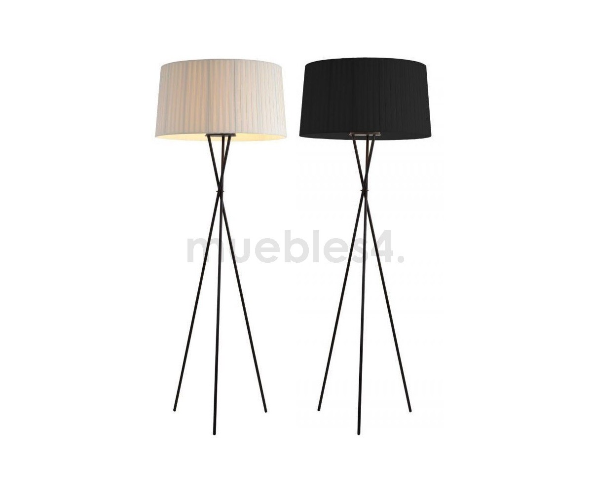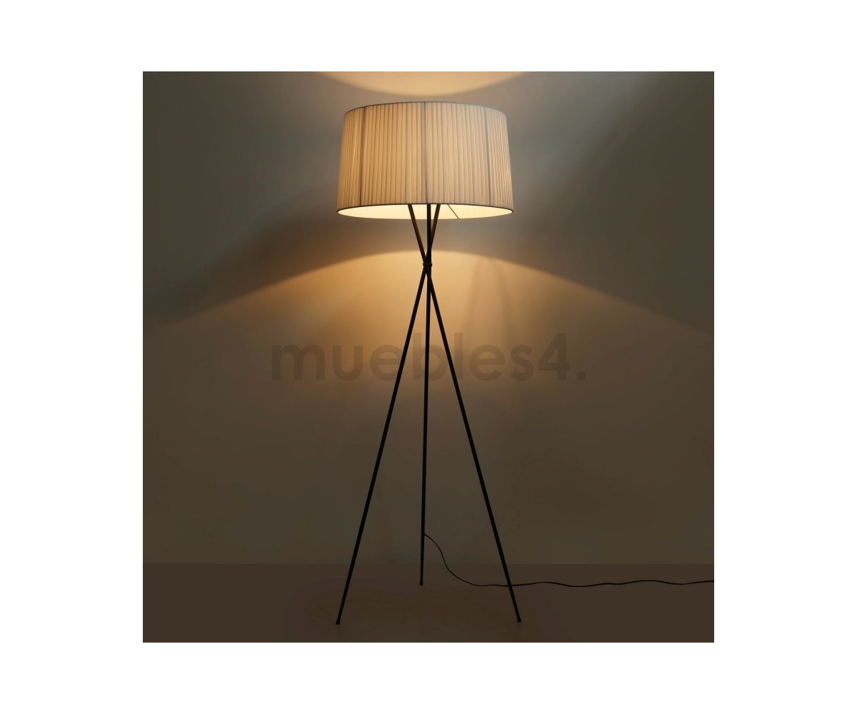 Lámpara de suelo, RÉPLICA INSPIRADA en un diseño de Santa&Cole. Hermosa iluminación compuesta por un haz de tres tubos negros unidos como un juego de palillos chinos, que levanta una amplia pantalla encintada. La pantalla es un verdadero símbolo del diseño moderno, proporcionando una luz cálida.