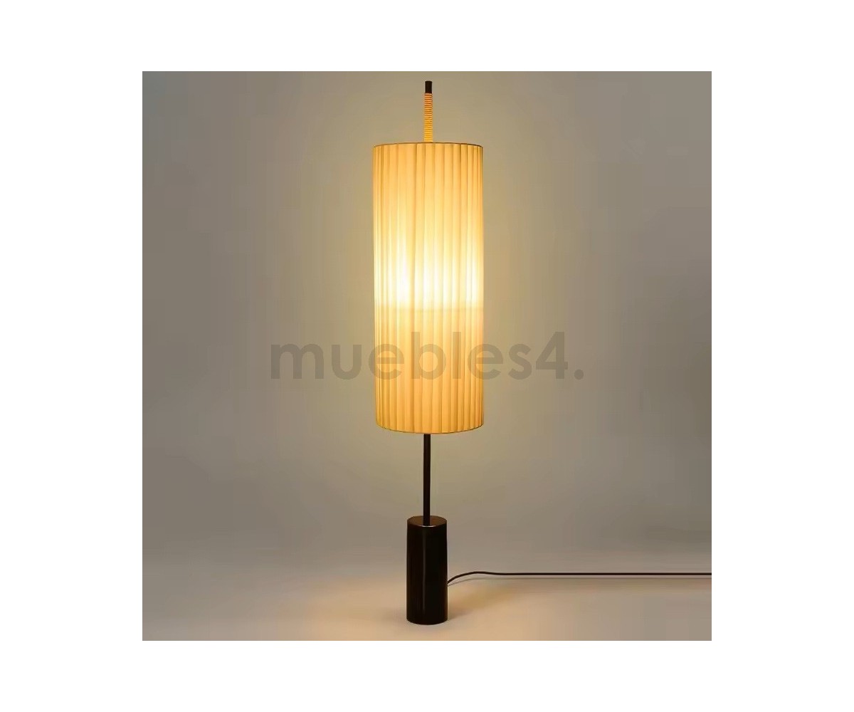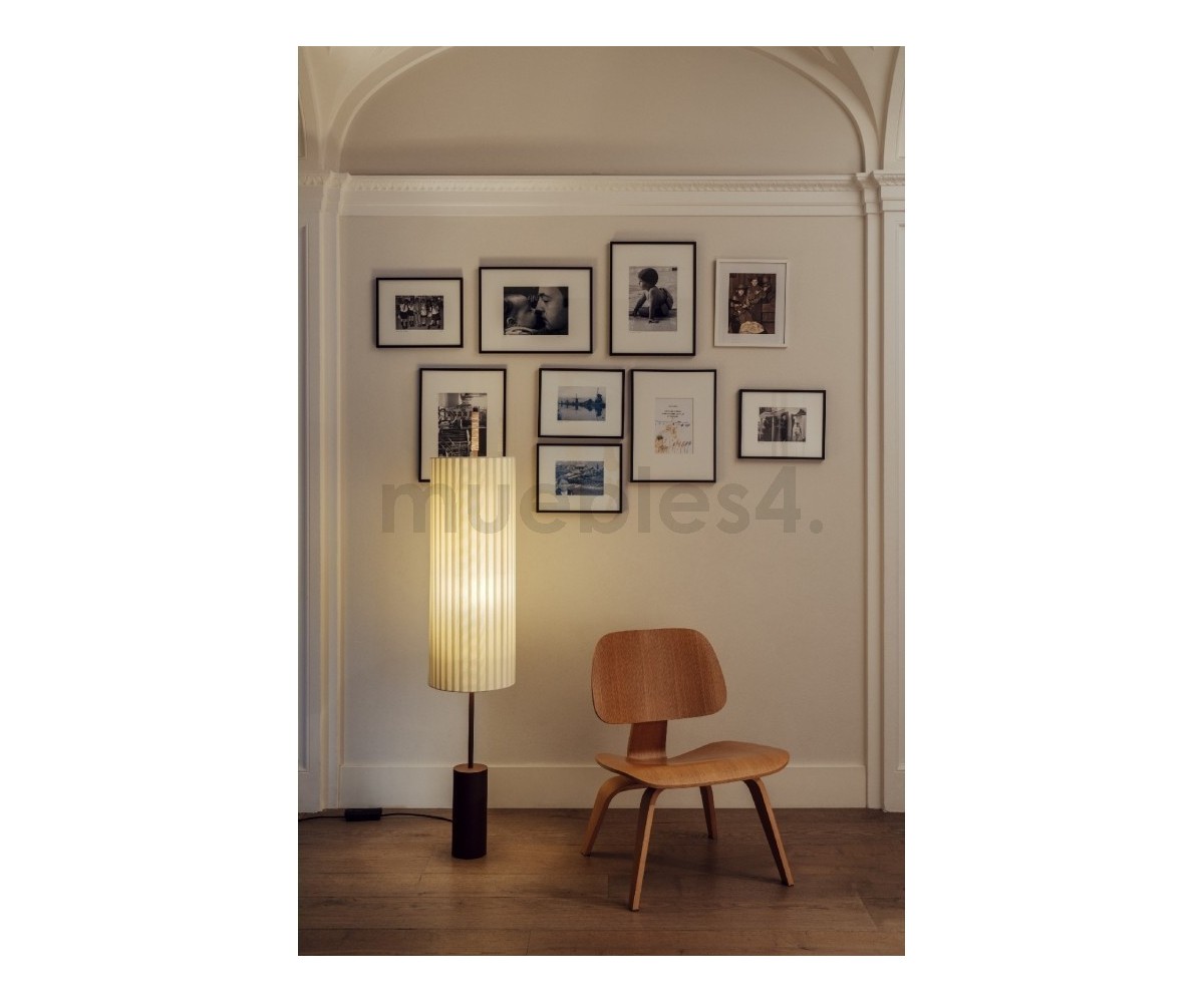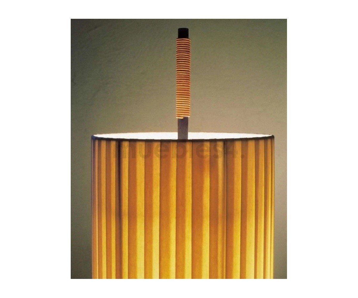 Lámpara de suelo inspirada en un diseño de Jordi Mirabell, Mariona Raventós. Su verticalidad impone un juego de proporciones armoniosas entre la materia y la luz, elementos característicos de la estética grecolatina. No obstante, la solidez de su pesada base bronceada contrasta con la liviandad de su pantalla encintada.