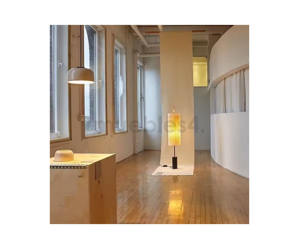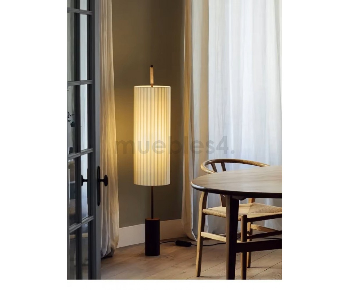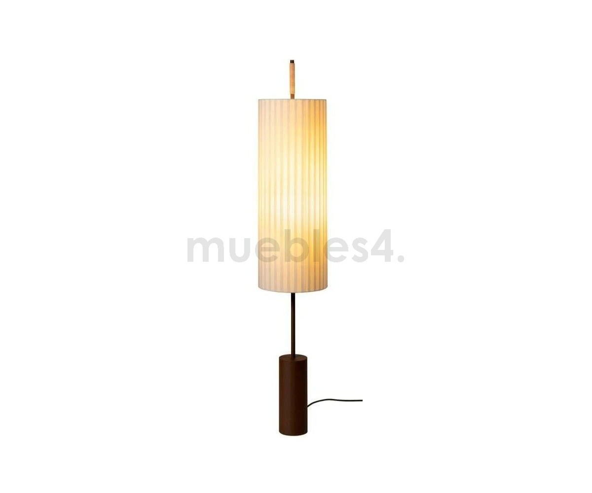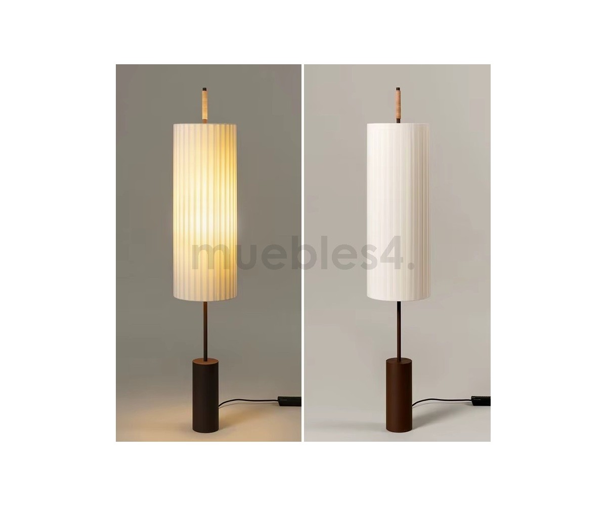 Lámpara de suelo inspirada en un diseño de Jordi Mirabell, Mariona Raventós. Su verticalidad impone un juego de proporciones armoniosas entre la materia y la luz, elementos característicos de la estética grecolatina. No obstante, la solidez de su pesada base bronceada contrasta con la liviandad de su pantalla encintada.