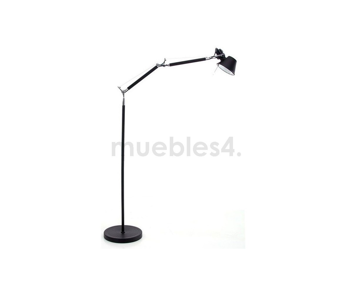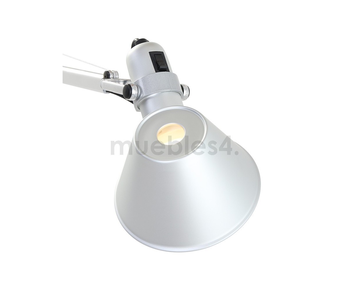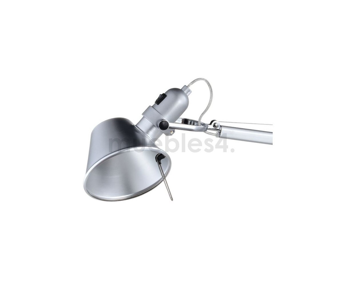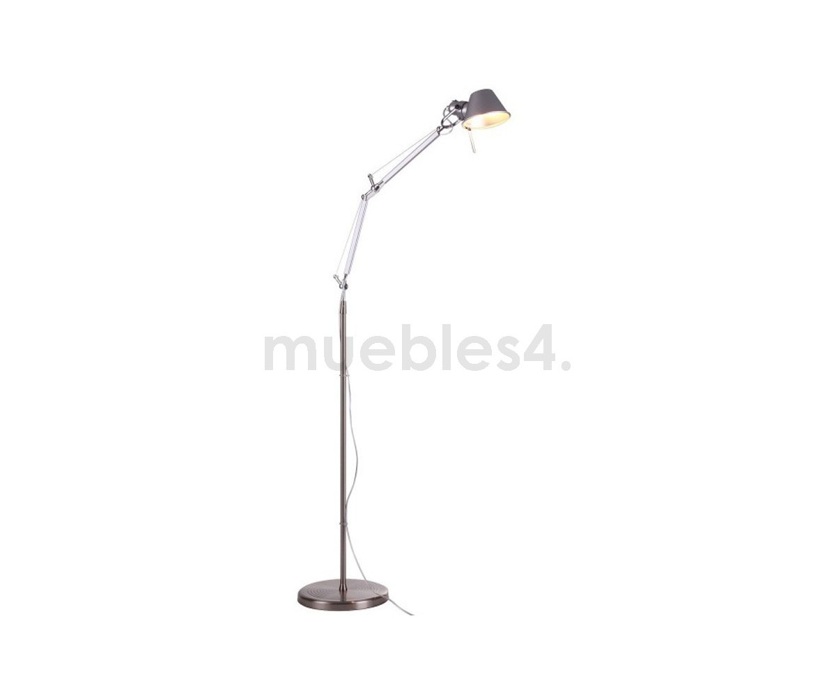Lámpara de suelo, inspirada en un diseño de Michele de Lucchi. Fabricada en aluminio y acero de carbono, terminación color plata. Diámetro base - 28.00 cm, alto campana - 10.00 cm, ancho campana - 14.00 cm, brazo Fijo - 100.00 cm, primer brazo articulado - 30.00 cm, segundo brazo articulado con campana - 60.00 cm. Réplica exacta con materiales originales de máxima calidad.