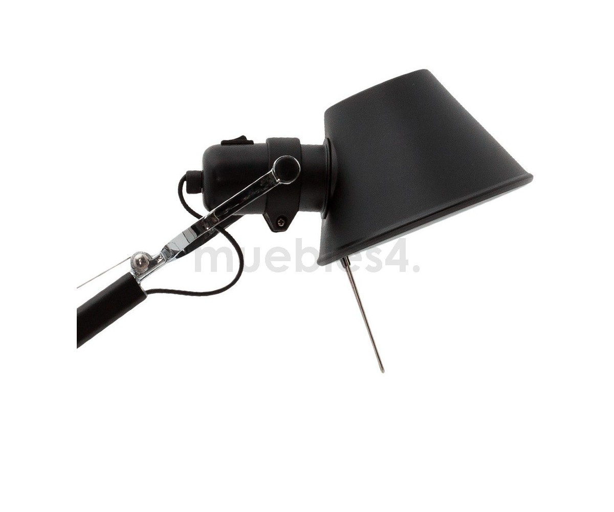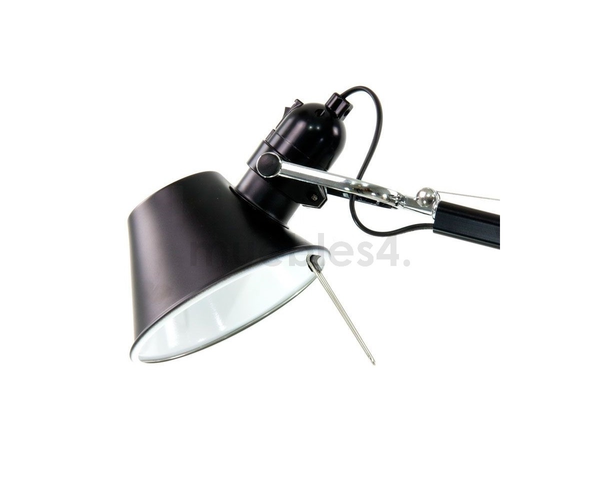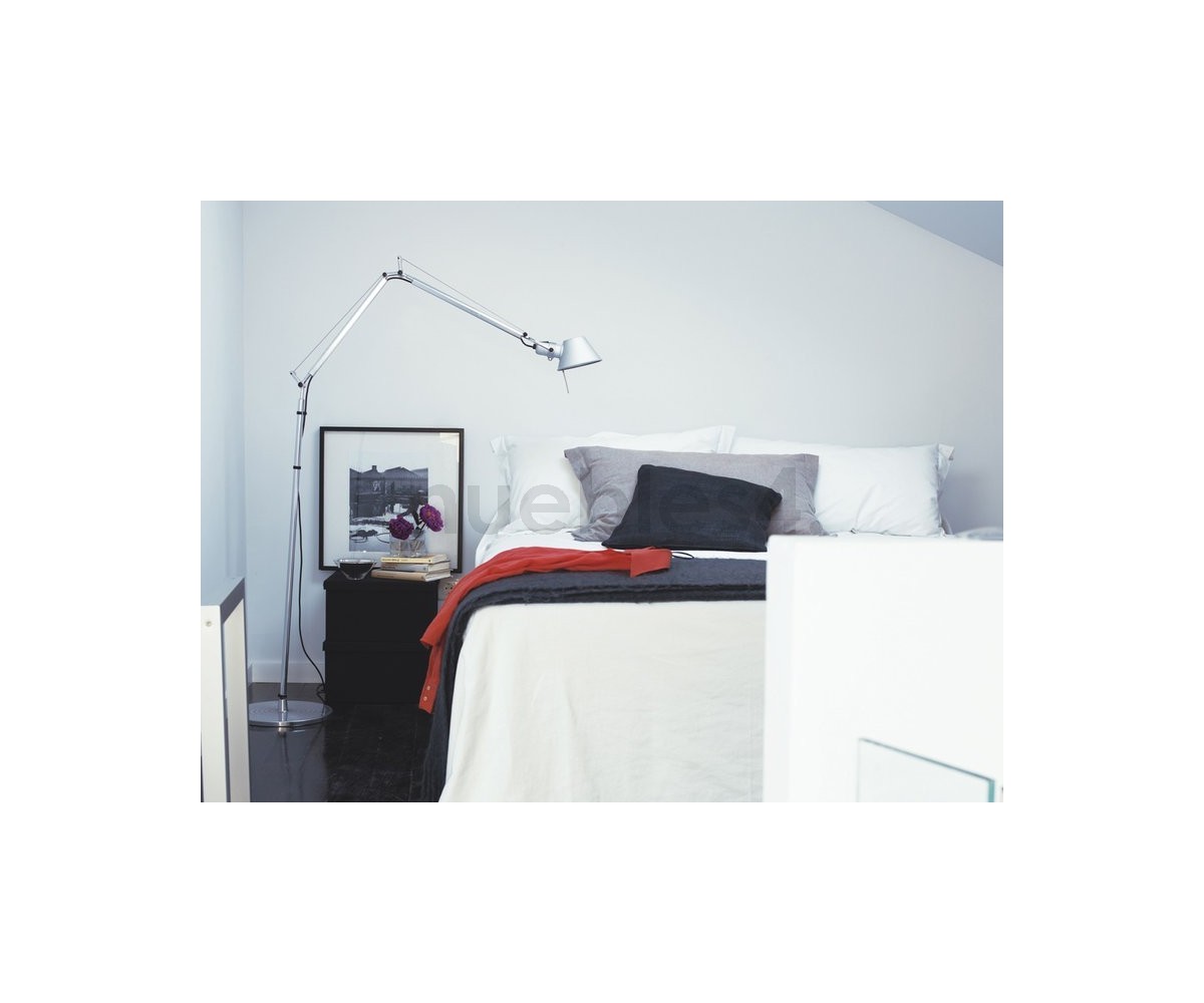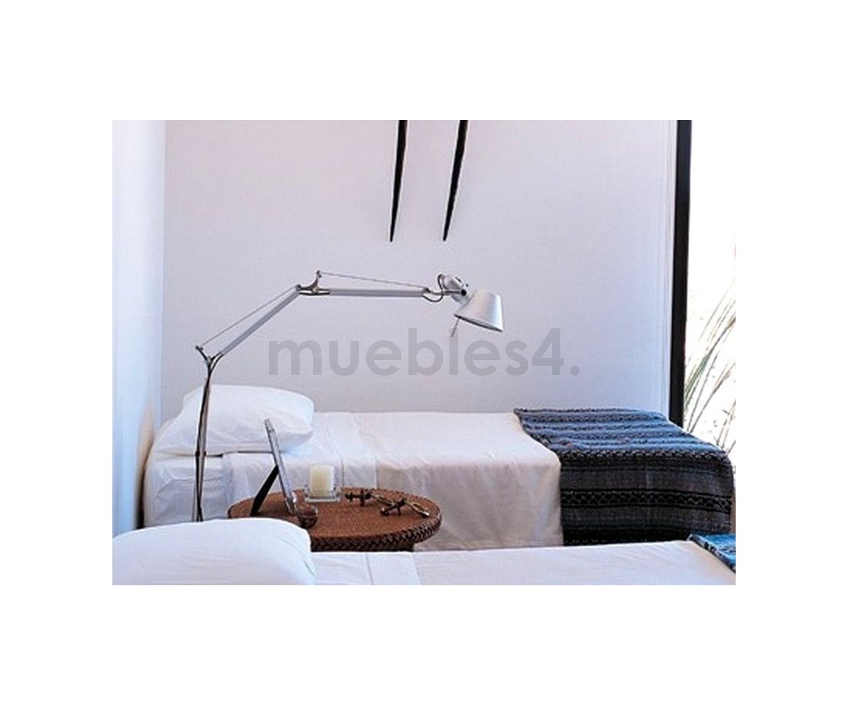 Lámpara de suelo, inspirada en un diseño de Michele de Lucchi. Fabricada en aluminio y acero de carbono, terminación color plata. Diámetro base - 28.00 cm, alto campana - 10.00 cm, ancho campana - 14.00 cm, brazo Fijo - 100.00 cm, primer brazo articulado - 30.00 cm, segundo brazo articulado con campana - 60.00 cm. Réplica exacta con materiales originales de máxima calidad.
