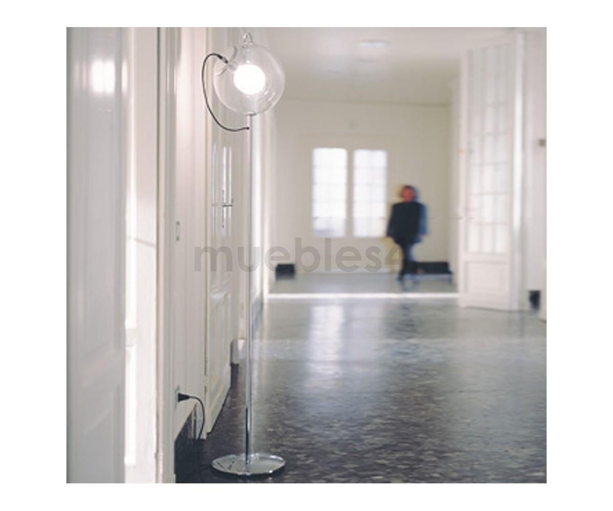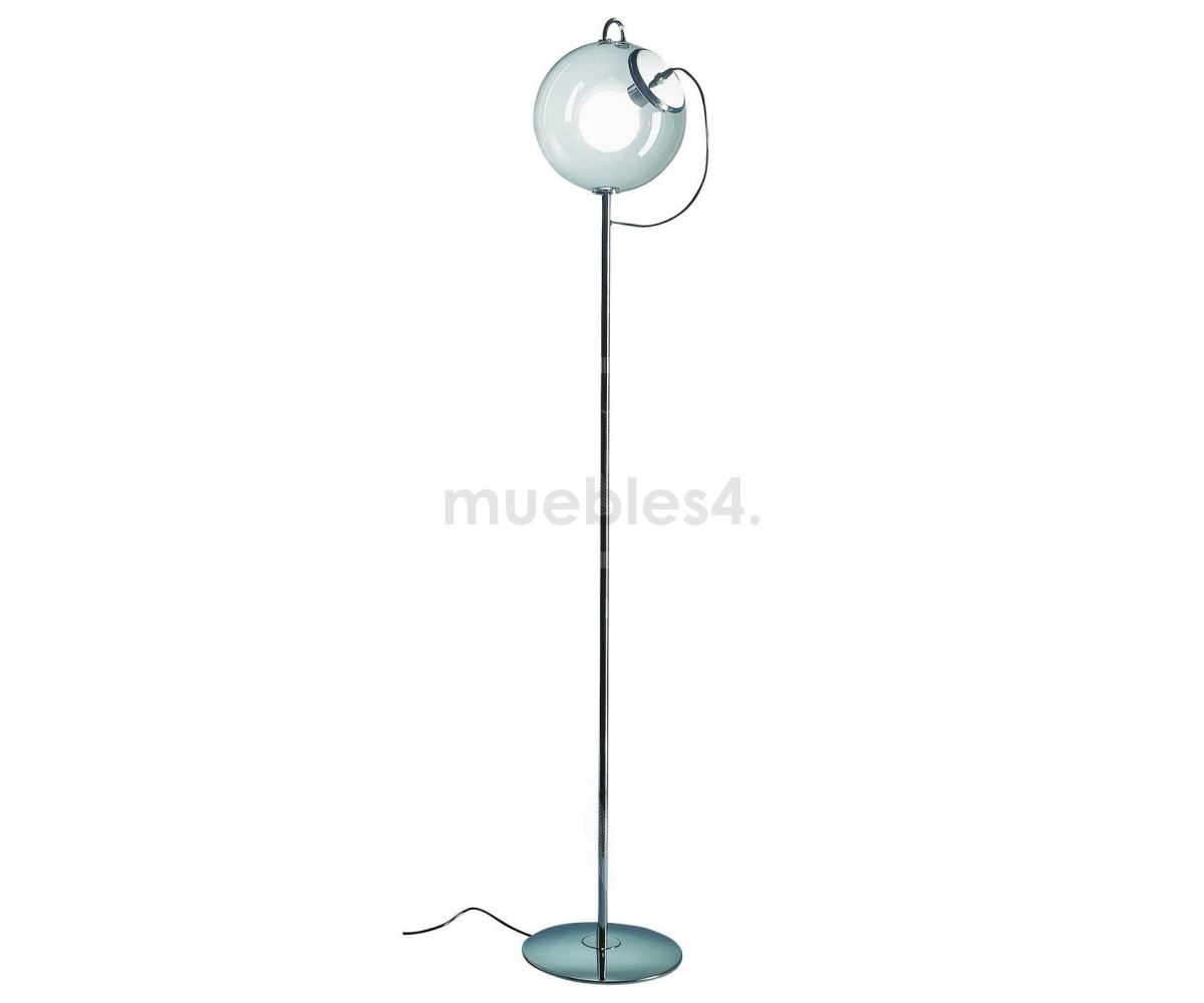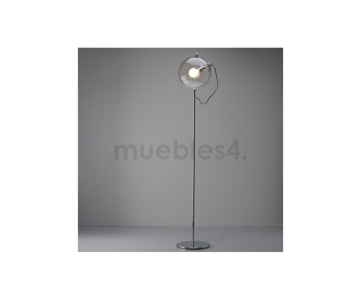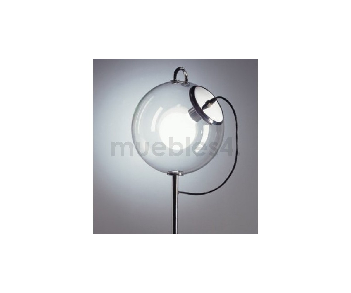 Lámpara de suelo, inspirada en un diseño de Ernesto Gismondi. Base en acero cromado brillo, globo de cristal transparente. Tambien disponible en lámpara de sobremesa. Réplica exacta con materiales originales de máxima calidad.