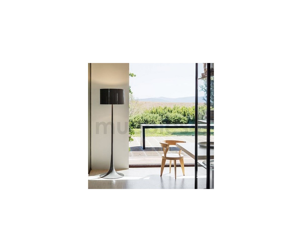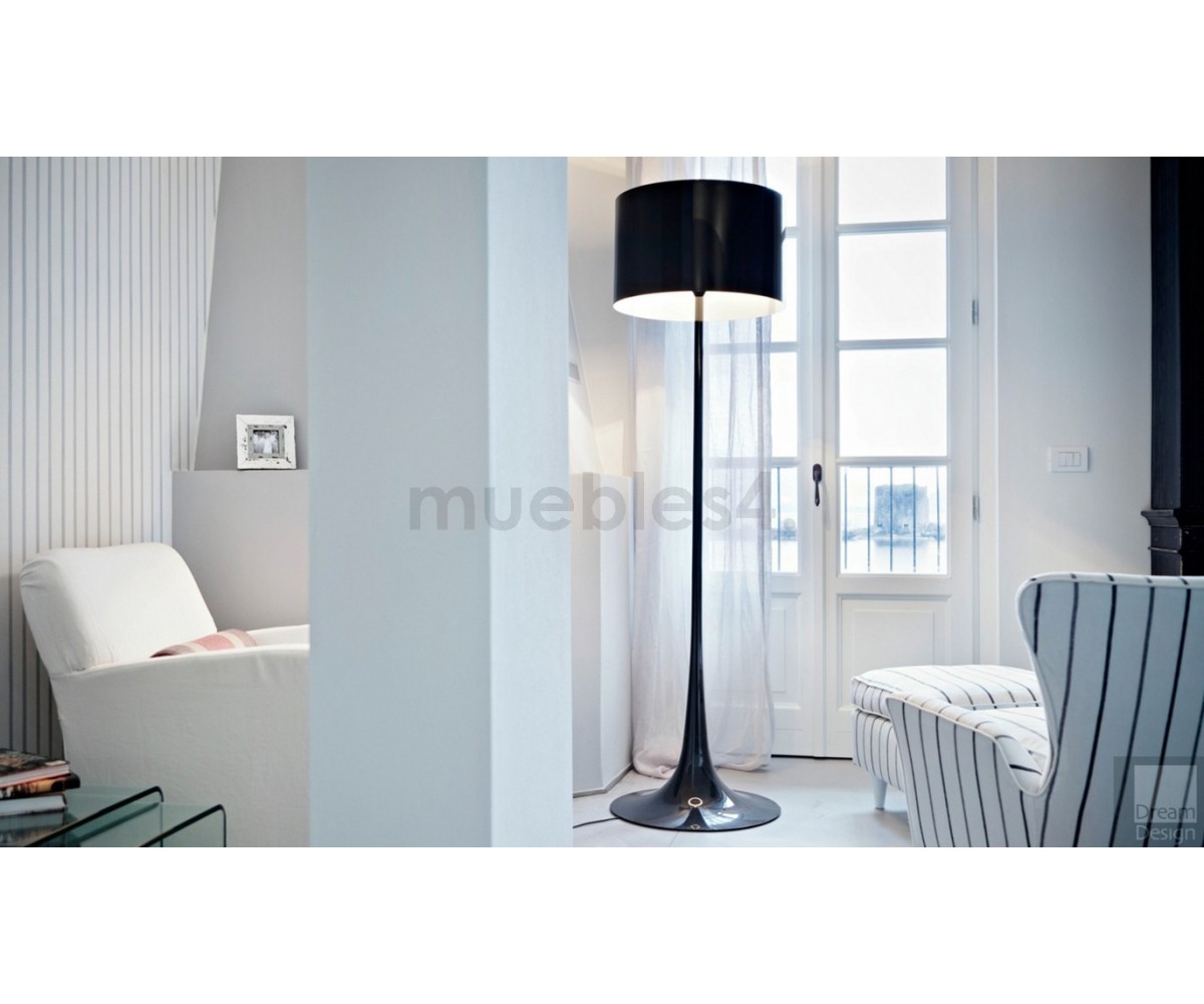 Lámpara de suelo, inspirada en un diseño de Sebastian Wrong. Cuerpo y pantalla fabricada totalmente en metal, lacado en color negro brillo o blanco brillo, interior de la pantalla color blanco para las dos opciones. Disponible también en lámpara de sobremesa. Modelo de bombilla E27. Réplica exacta con materiales originales de máxima calidad.