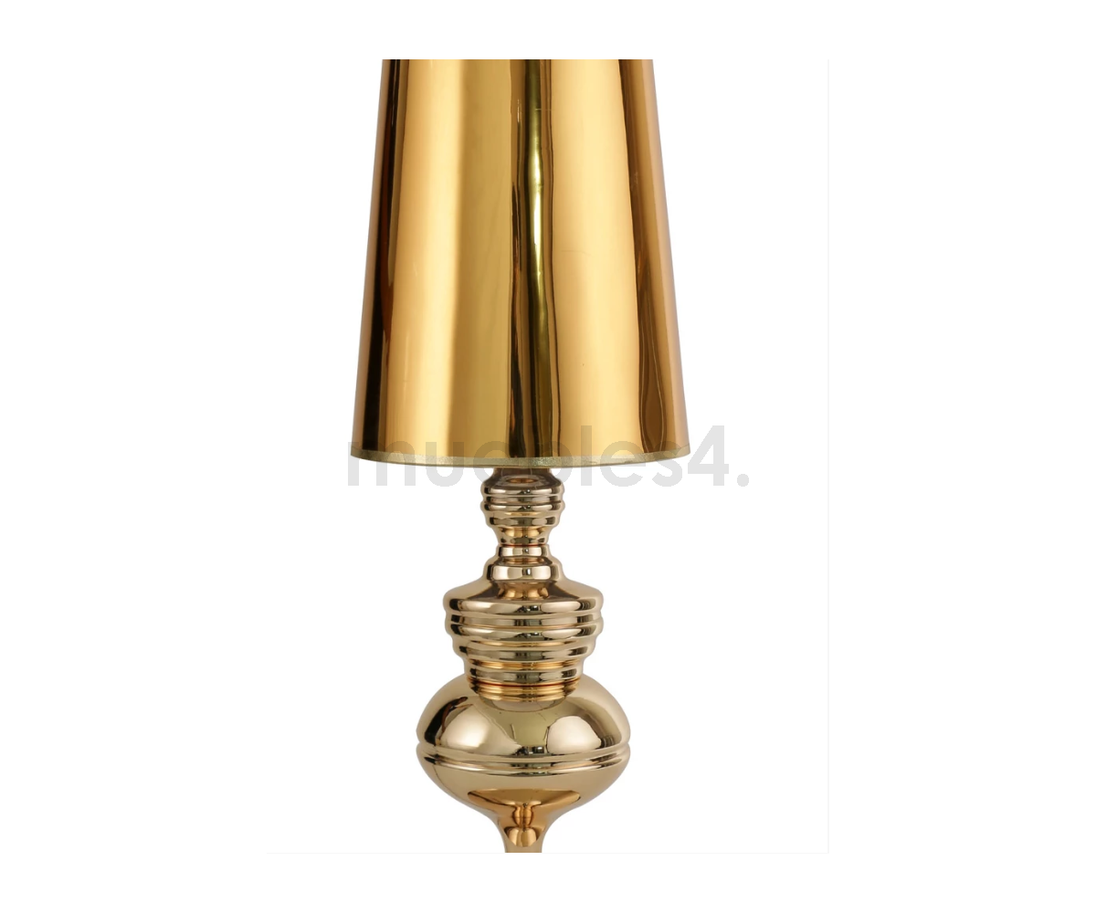 Lámpara de sobremesa inspirada en un diseño de Jaime Hayón. Cuerpo realizado en metal terminación color oro brillo, pantalla en vinilo mismo color que el cuerpo. Bombilla modelo E27. Campana: Ø 10cm. / Ø 15cm x Alto 23 cm. Réplica exacta con materiales originales de máxima calidad.