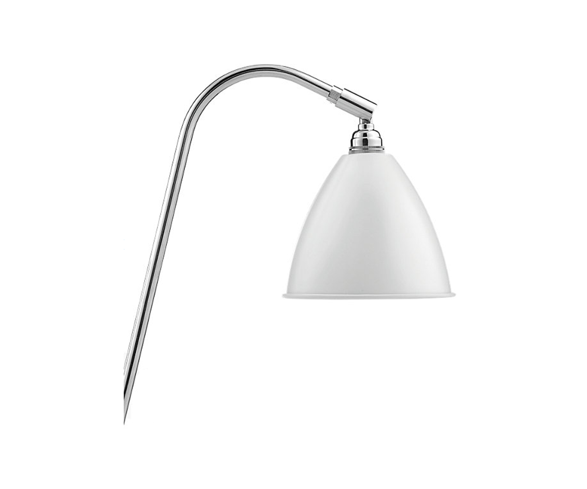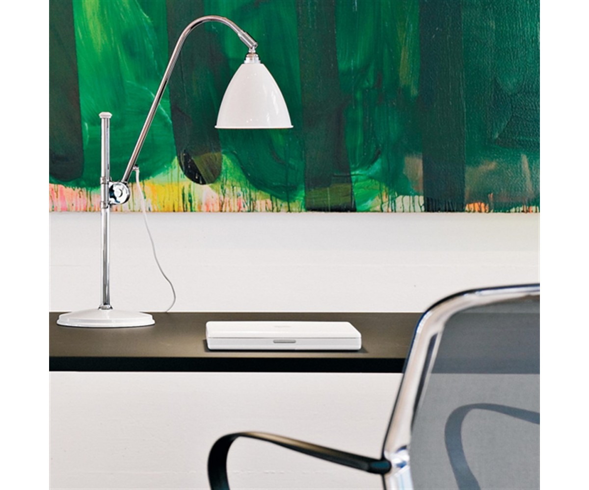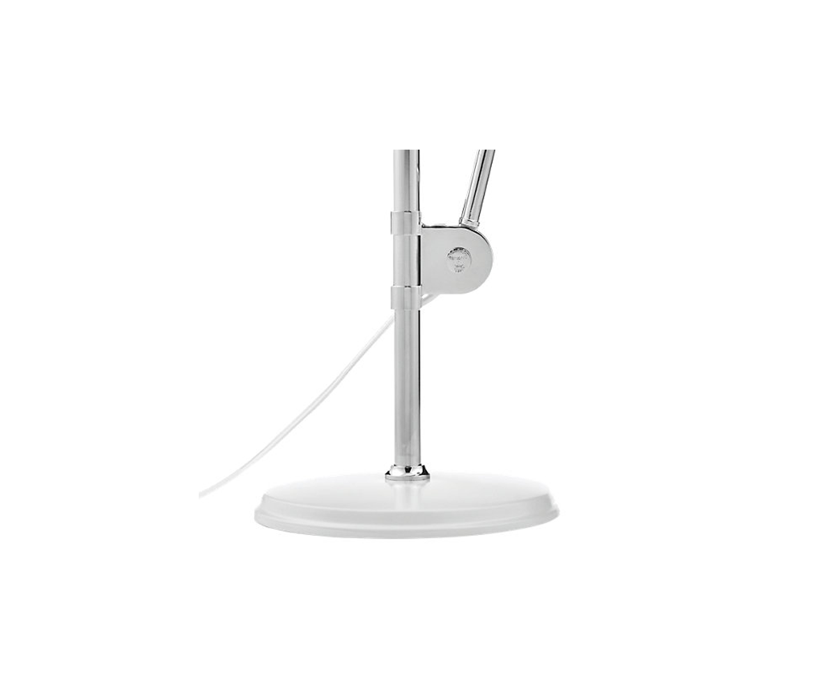 Lámpara de sobremesa / flexo de altura ajustable de 55/84cm, inspirada en un diseño de Robert Dudley Best. Armazón fabricado en acero terminación brillo, pantalla circular con TRIPLE lacado colo blanco. Utiliza 1 bombilla modelo E14 no incluida. Disponible en aplique. Réplica exacta con materiales originales de máxima calidad.