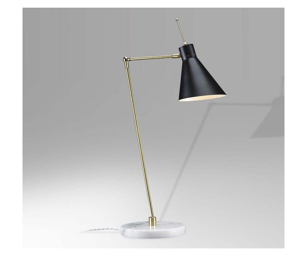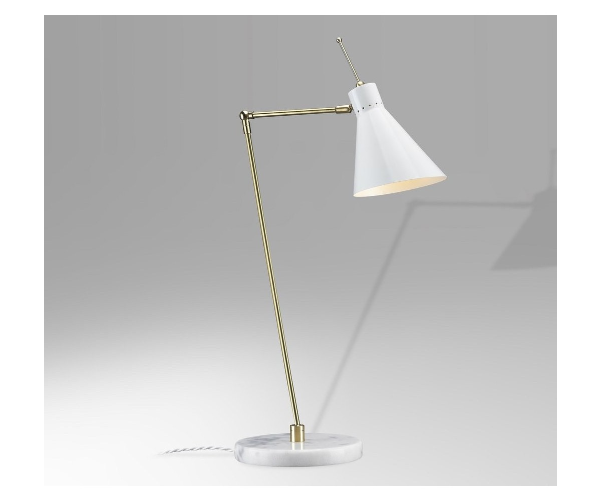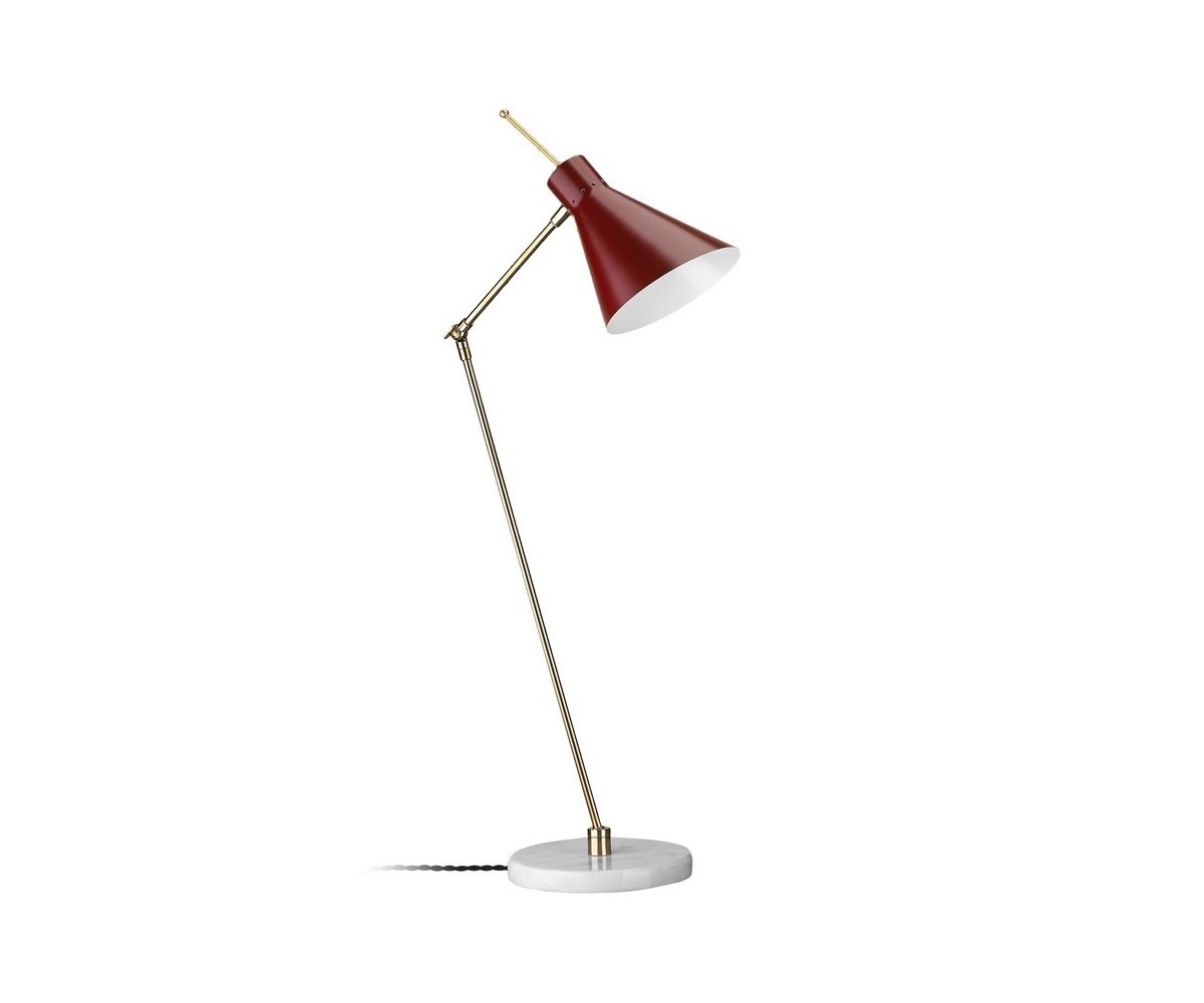 Lámpara de sobremesa / flexo, inspirado en un diseño de Vittoriano Vigano. Base circular de mármol blanco macael, cuerpo de dos brazos articulados en latón, campana en acero con TRIPLE LACADO color negro, blanco o granate. Cable retorcido de tela. Modelo de bombilla E27 no incluida. Fabricada en Italia. Réplica exacta con materiales originales de máxima calidad.
