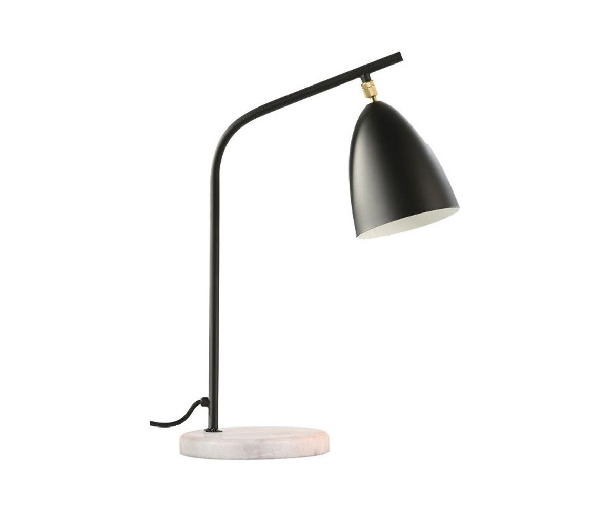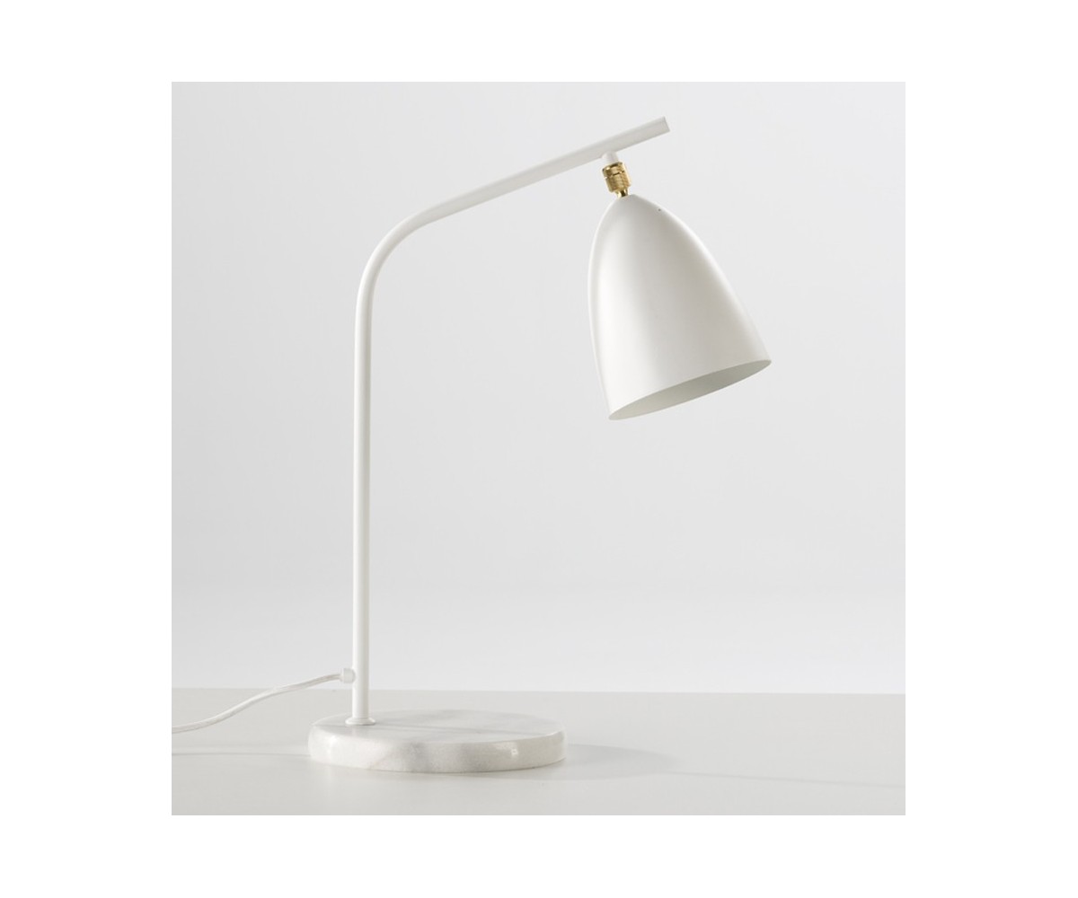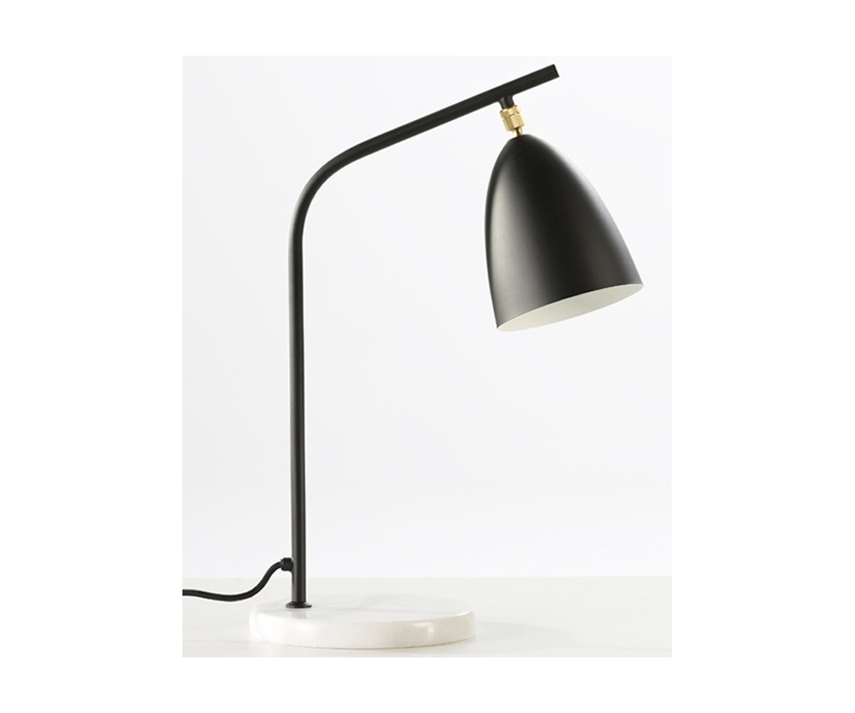 Lámpara de sobremesa / flexo, inspirada en un diseño de Greta Grossman para Gubi. Base circular fabricada en mármol, cuerpo y tulipa en acero con TRIPLE LACADO color negro o blanco, unión cuerpo y campana bronce. También disponible en lámpara supendida, suelo y aplique. Modelo de bombilla E27. Fabricada en Italia. Réplica exacta con materiales originales de máxima calidad.