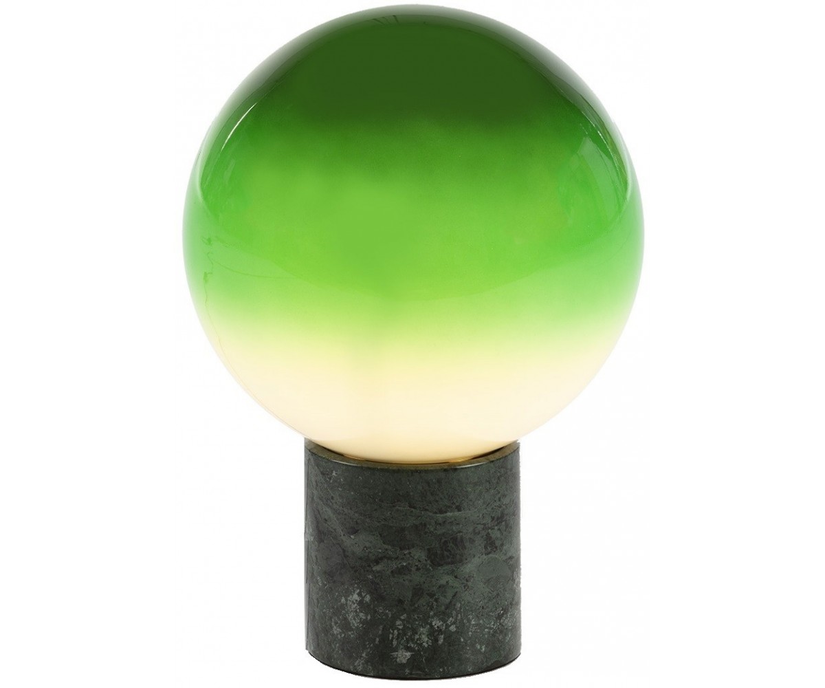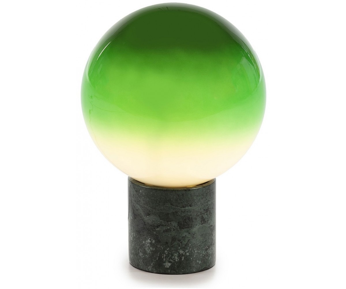 Lámpara de sobremesa inspirada en un diseño de Jordi Canudas. Base tubular en mármol color verde, tulipa circular fabricado en cristal soplado color verde y blanco. Réplica exacta con materiales originales de máxima calidad.