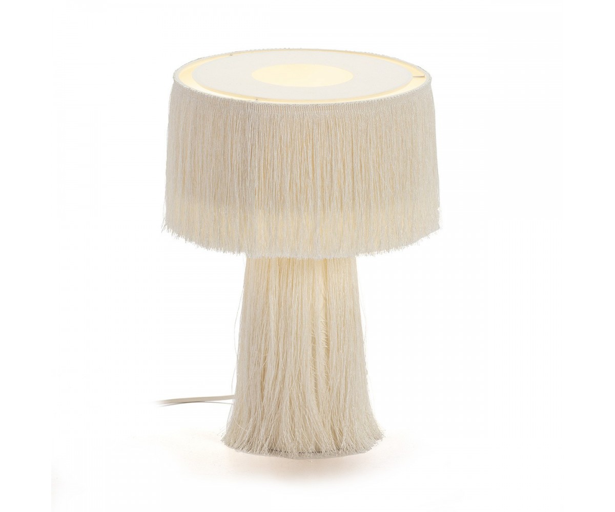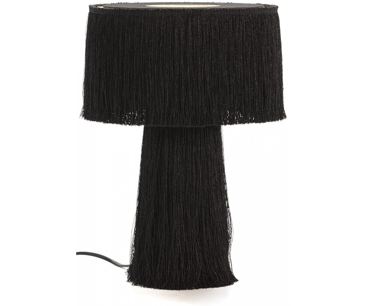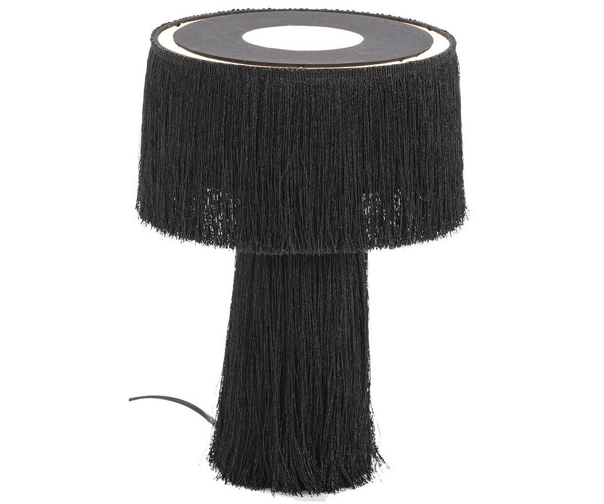 Lámpara de sobremesa inspirada en un diseño de Hans-Age Jakobbson para Markaryd. Base cónica y tulipa circular, fabricada en tela y hilos de seda color beig o negro. Modelo de bomilla E14 no incluida. Réplica exacta con materiales originales de máxima calidad.