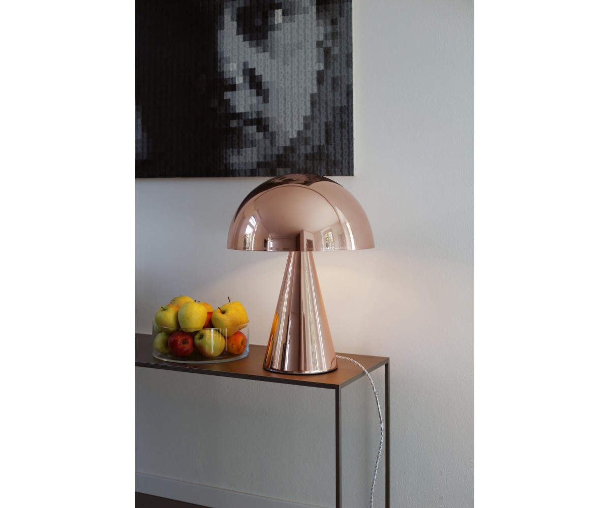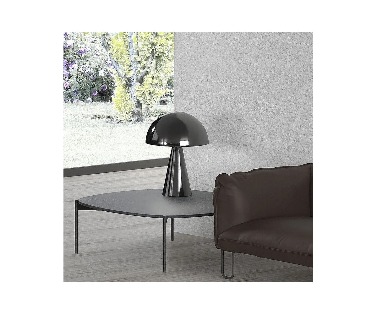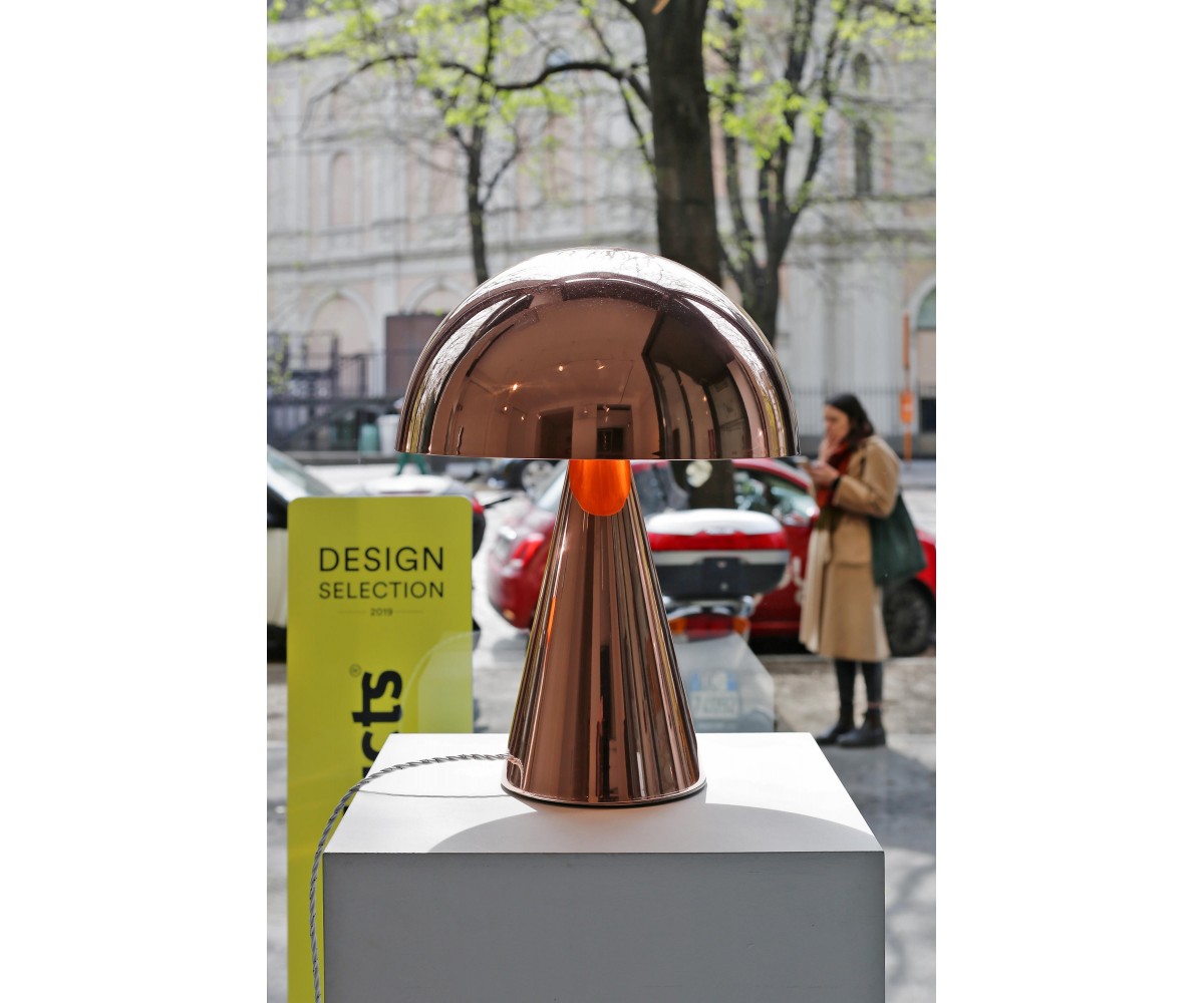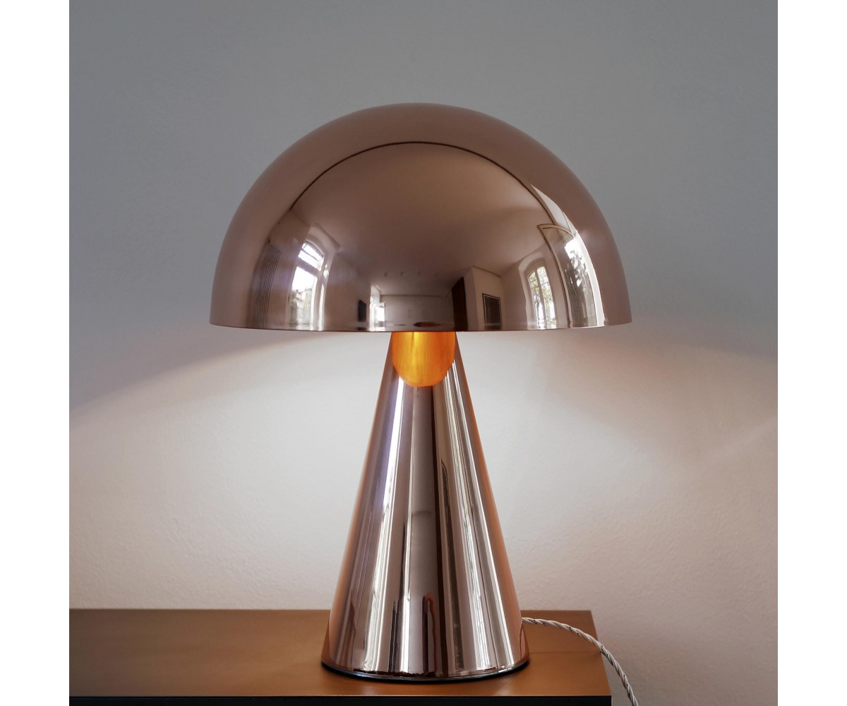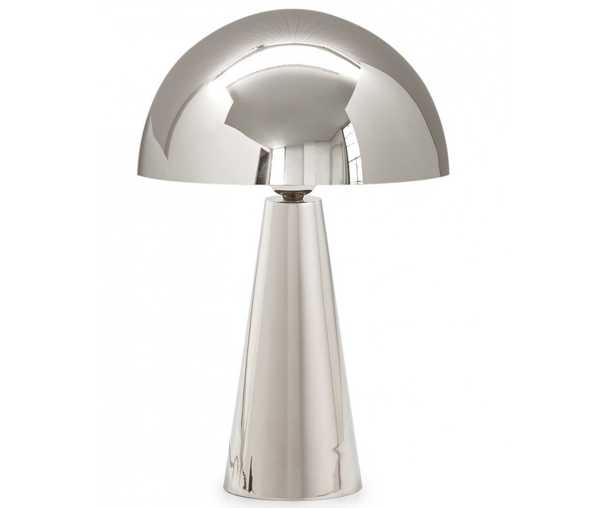 Lámpara de sobremesa inspierada en un diseño de Filippo Dell'Orto. Base cónica y tulipa en media esfera de nickel y acero torneado, pulido a mano con terminación nickel brillo. Réplica exacta con materiales originales de máxima calidad.