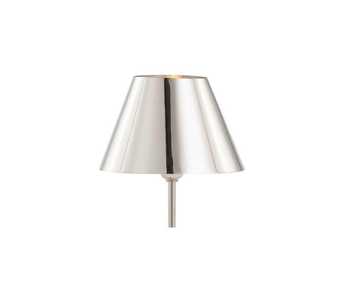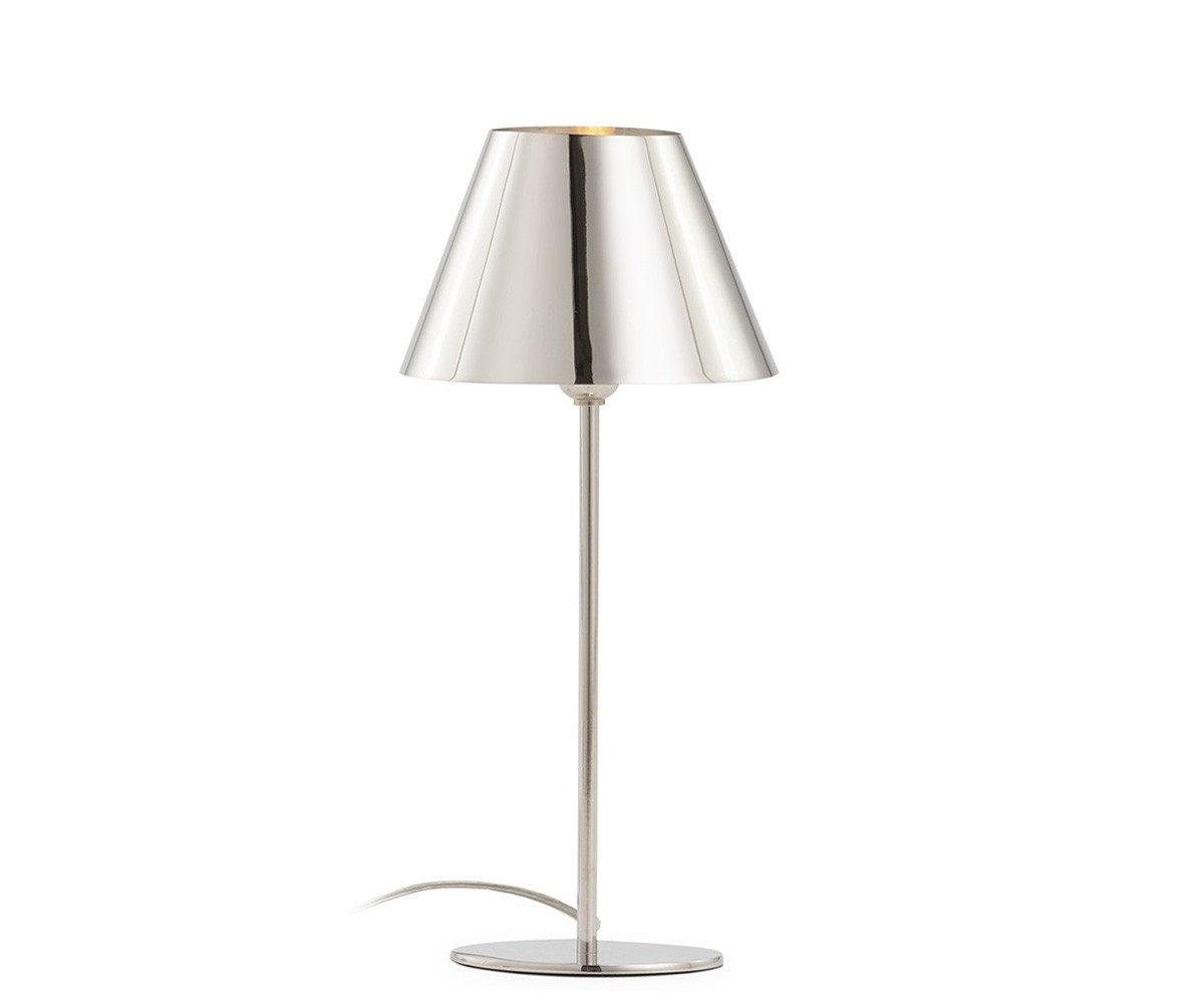 Lámpara de sobremesa diseñada por Italia Design. Base circular plana, con cuerpo tubular y tulipa cónica fabricada en acero terminación brillo. También disponible en lámpara de suelo. Réplica con materiales originales de máxima calidad