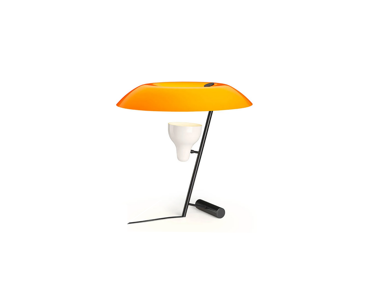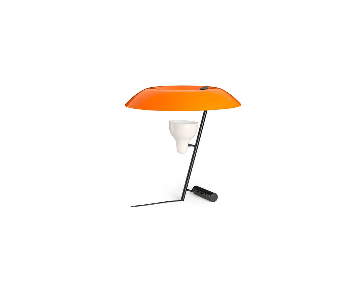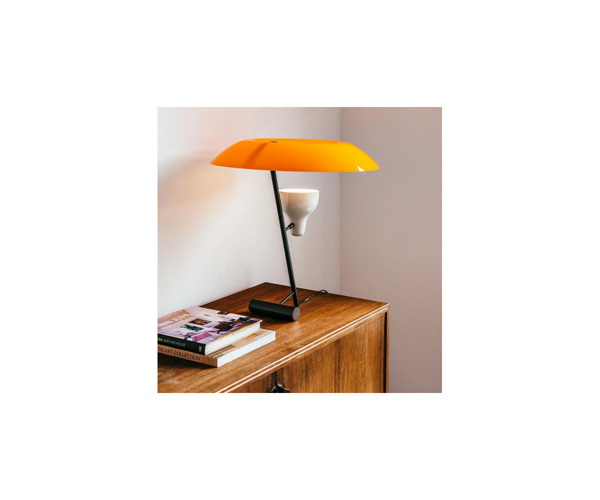 Lámpara de sobremesa inspirada en un diseño de Gino Sarfatti. Estructura en latón color negro pulido, terminación mate, difusor terminación brillo naranja o negro. Modelo de bombilla E14 LED (no incluida). Réplica con materiales originales de máxima calidad.