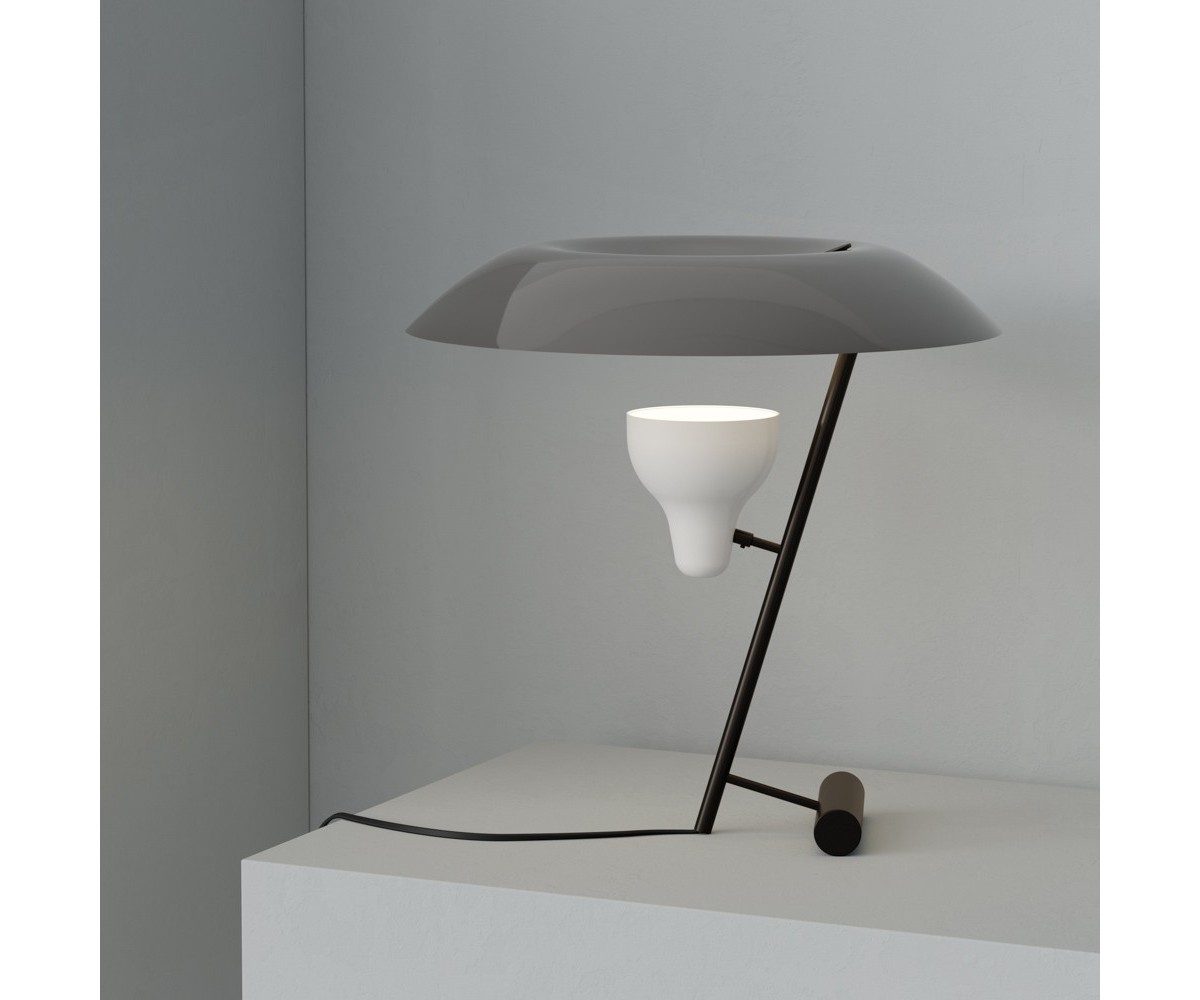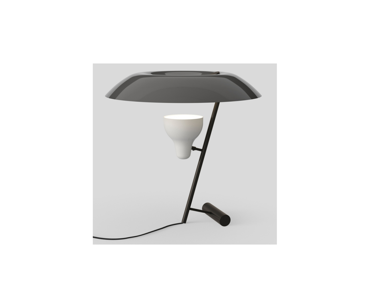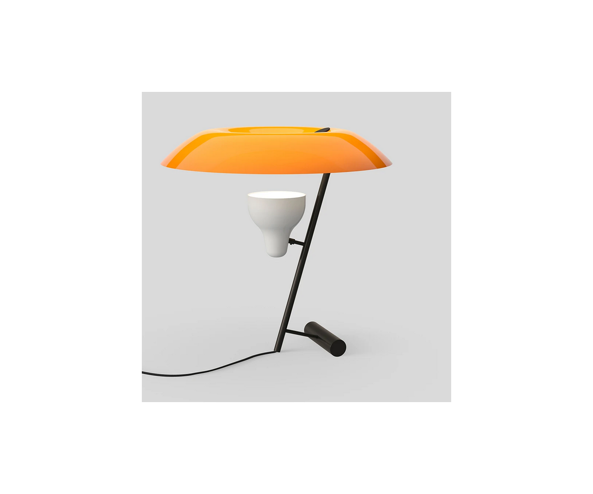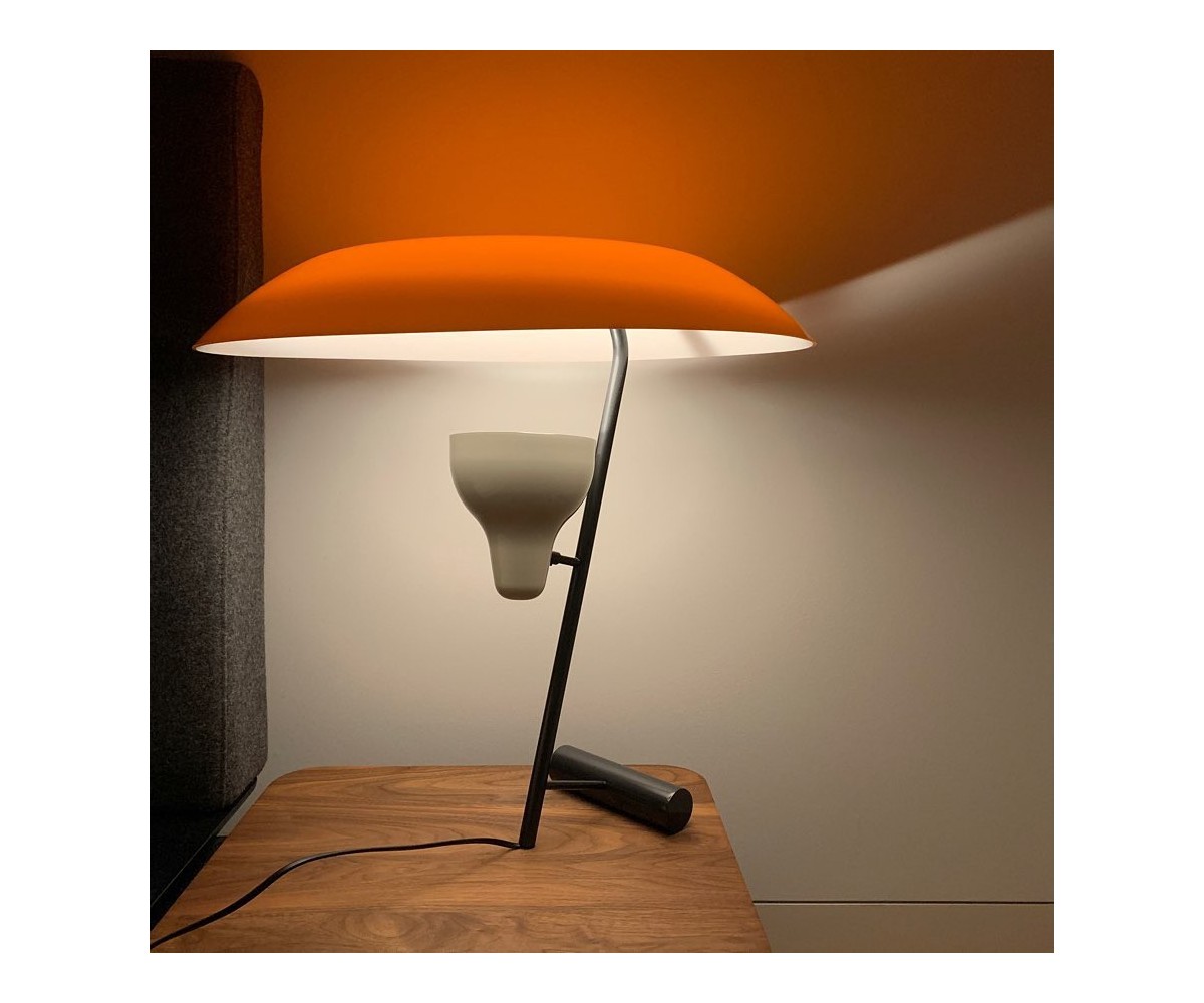 Lámpara de sobremesa inspirada en un diseño de Gino Sarfatti. Estructura en latón color negro pulido, terminación mate, difusor terminación brillo naranja o negro. Modelo de bombilla E14 LED (no incluida). Réplica con materiales originales de máxima calidad.