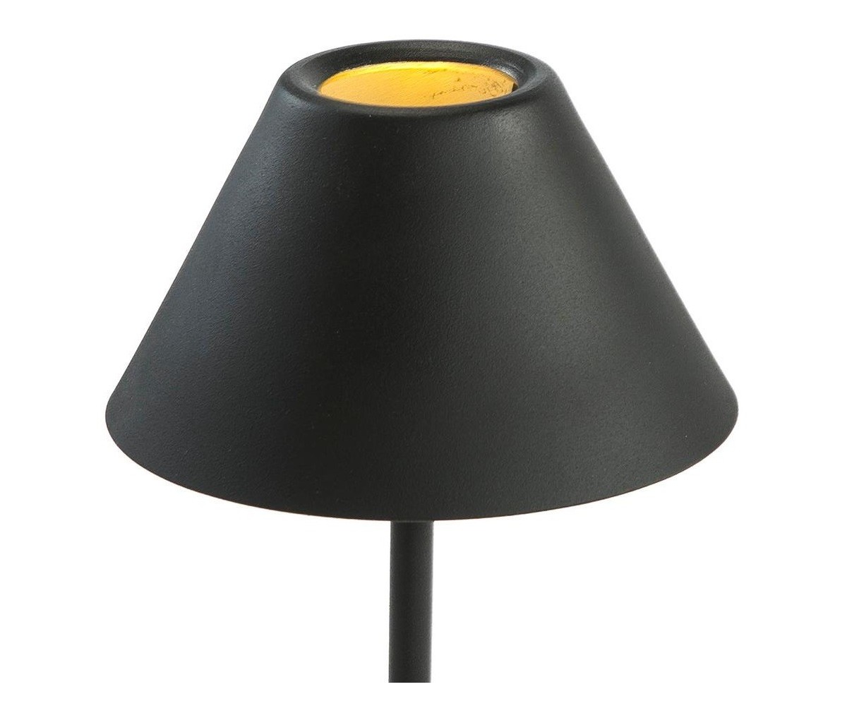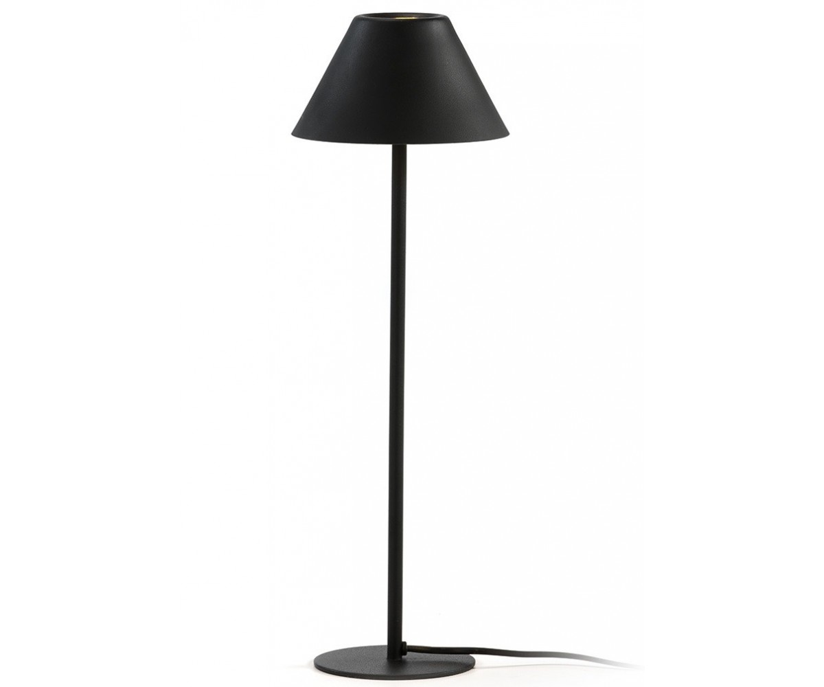 Lámpara de sobremesa diseñada por Italia Design. Base circular plana, con cuerpo tubular y tulipa cónica fabricada en acero terminación lacado al horno color negro. También disponible en lámpara de suelo. Réplica con materiales originales de máxima calidad