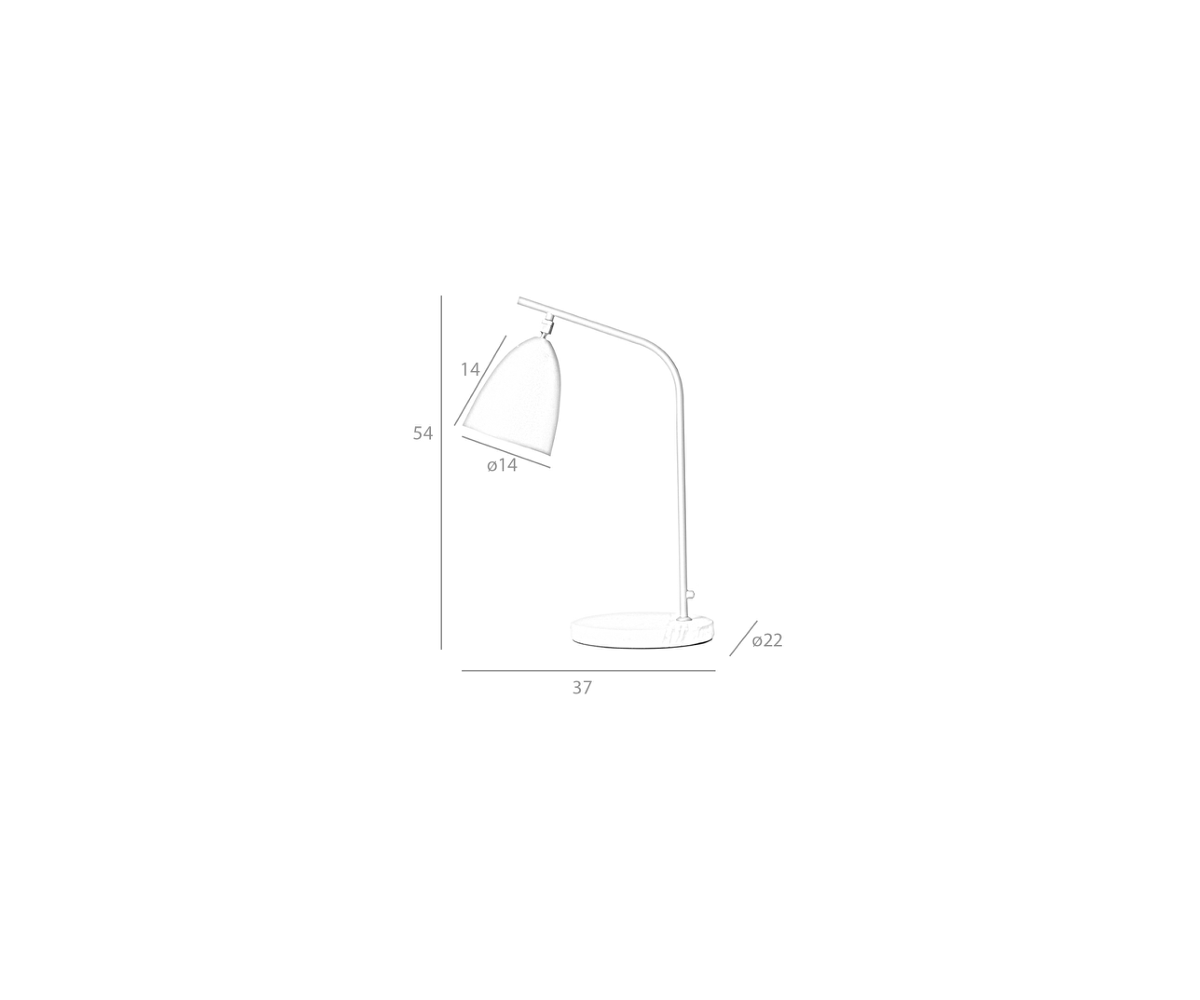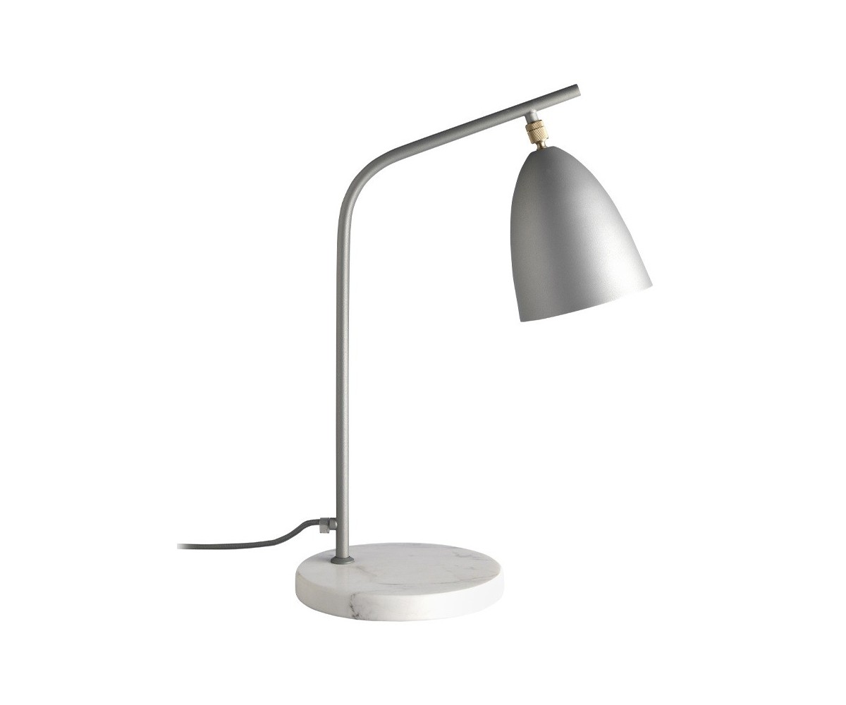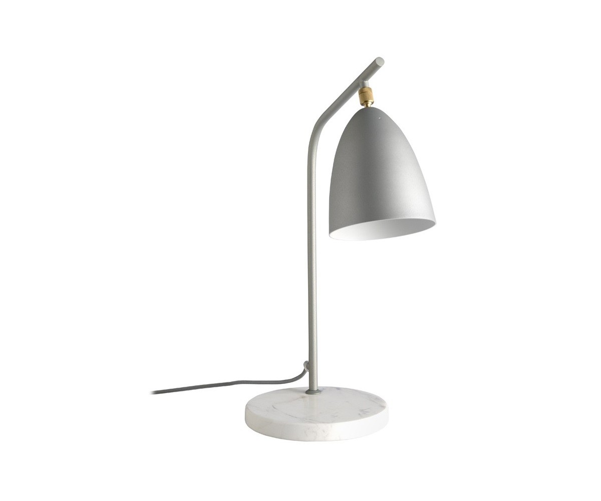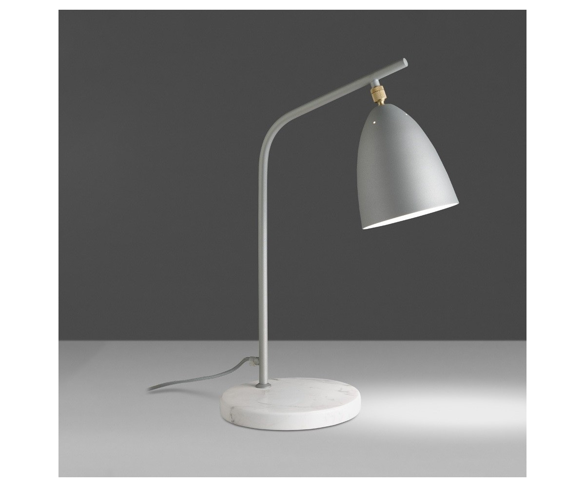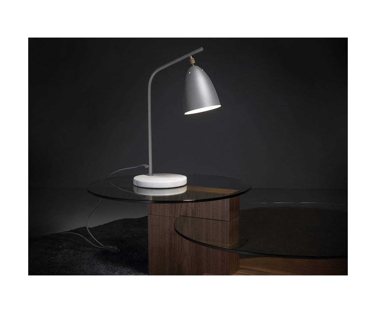 Lámpara de sobremesa / flexo, inspirada en un diseño de Greta Grossman para Gubi. Base circular fabricada en mármol, cuerpo y tulipa en acero lacado en epoxy color gris, unión cuerpo y campana bronce. Bombilla LED incluida y reemplazable E27 de 3W. Potencia de 220-240V y 50/60 Hz. IP: 20 clase II, calificación energética A++. Máximo soportado 40W. Largo del cable 220 cm. Peso total 4.1kg. Fabricada en Italia. Réplica exacta con materiales originales de máxima calidad.