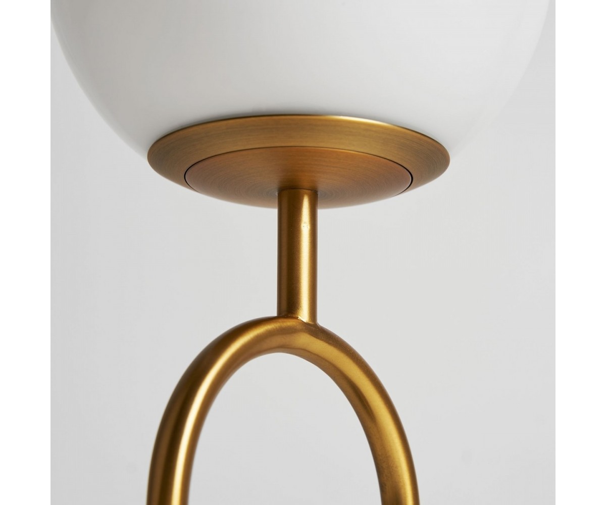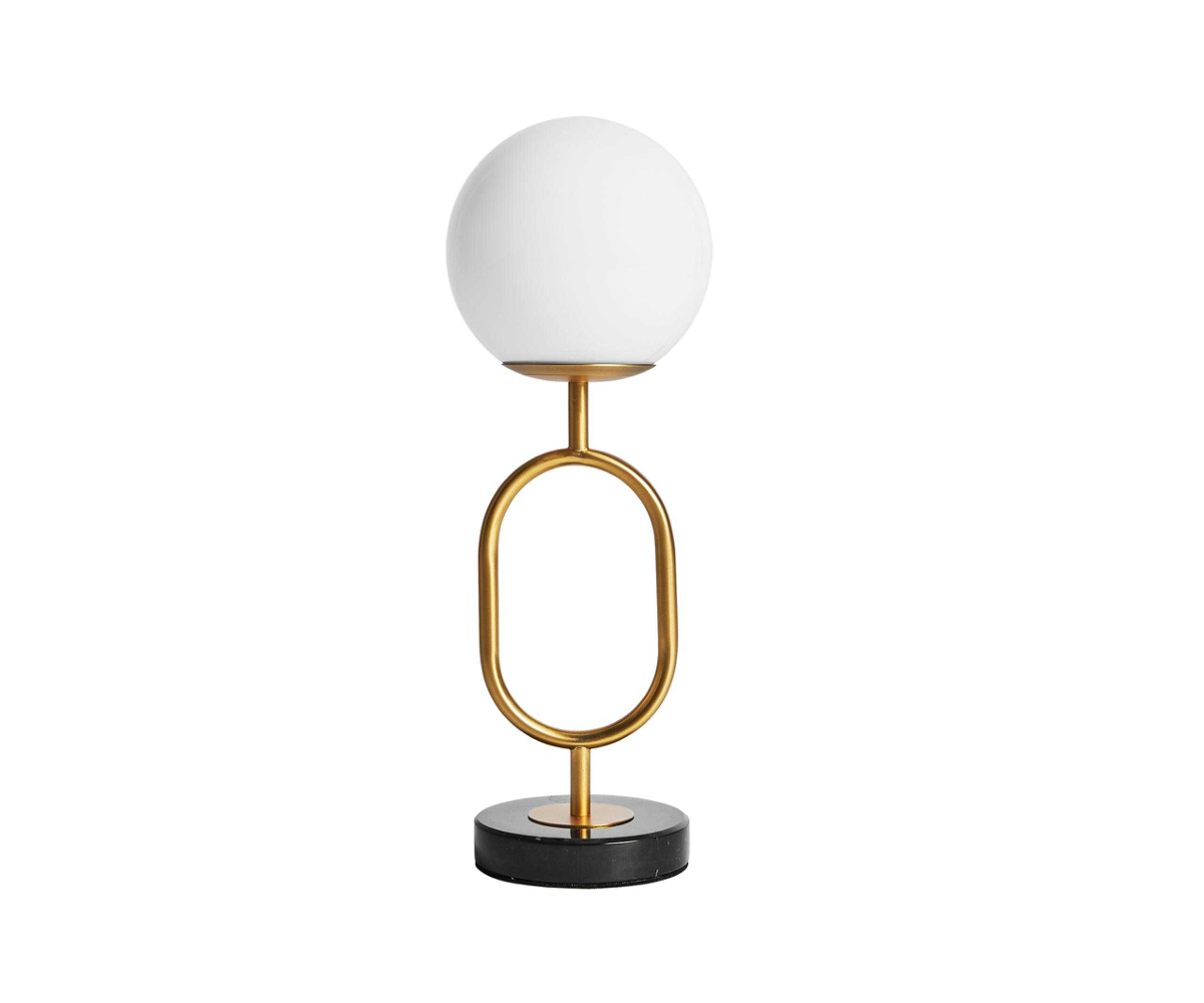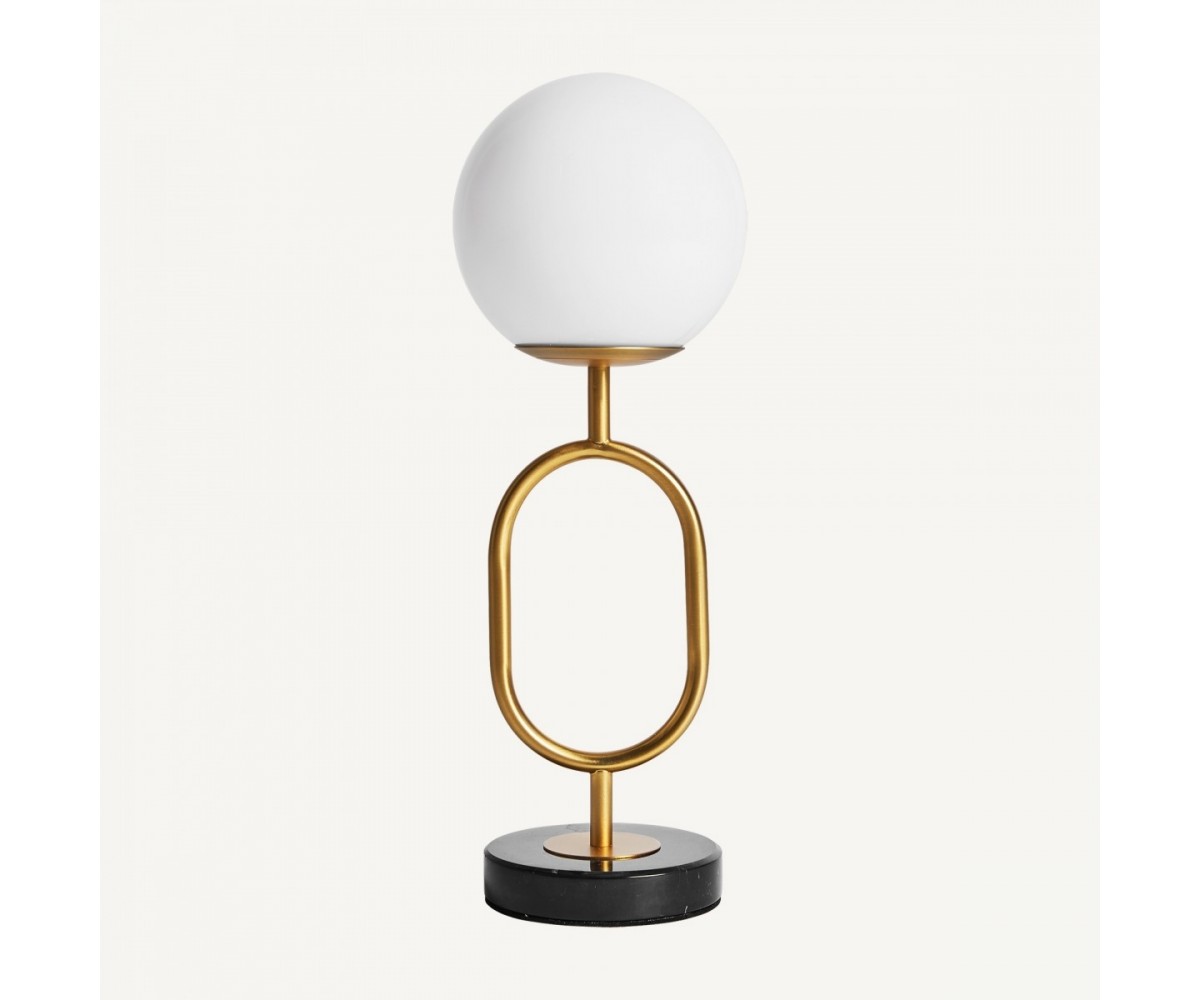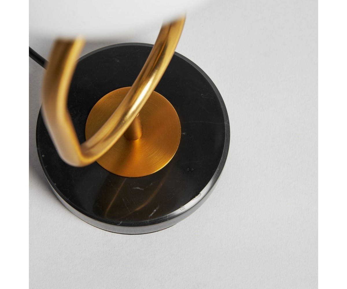 Lámpara de sobremesa inspirada en un diseño de Stone Designs - The Brand Lux. Cuerpo fabricado en acero tubular dorado, base circular en mármol negro, tulipa circular en cristal soplado color blanco brillo. Modelo de bombilla E14, no incluida. Largo del cable 1.60cm, distancia del interruptor 40cm. Peso 1.3kg. Réplica con materiales originales de máxima calidad.