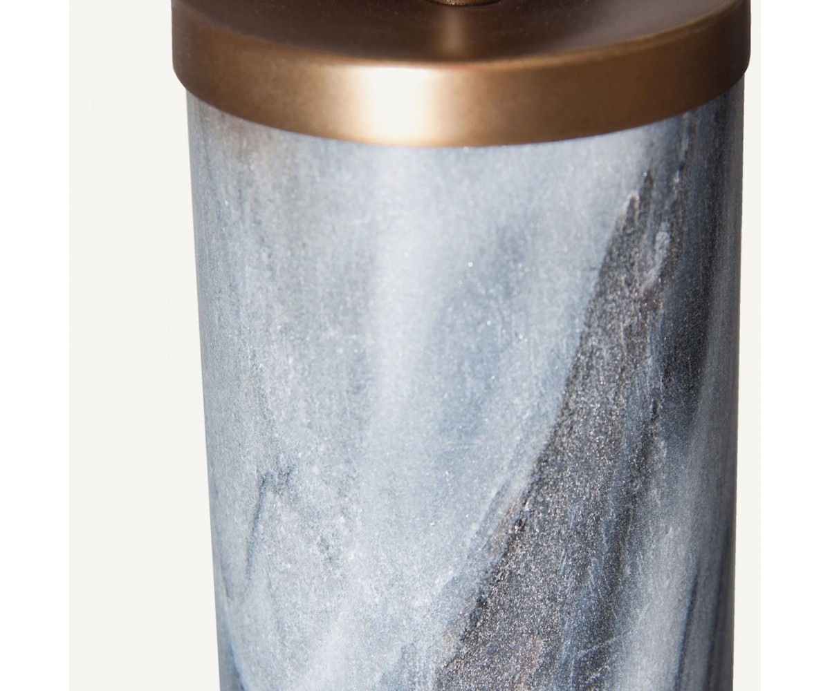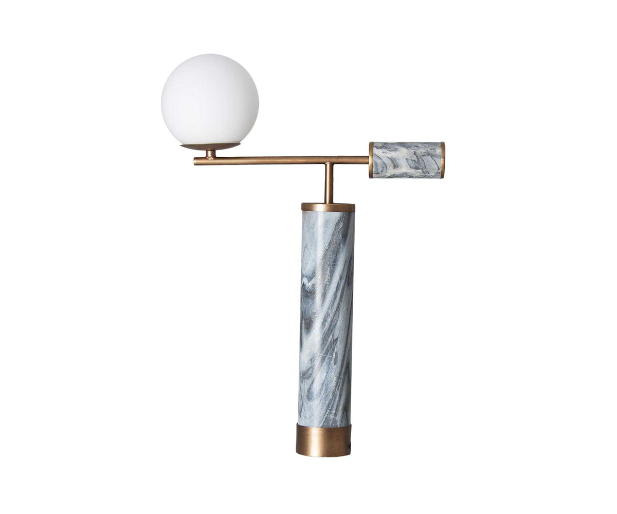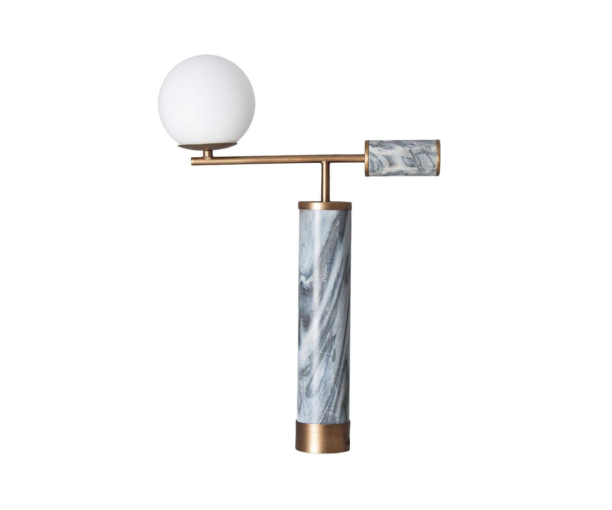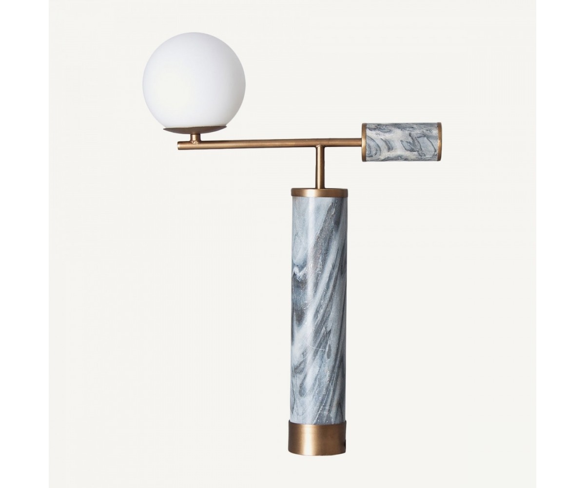 Lámpara de sobremesa de estilo contemporáneo, inspirada en un diseño de Marcin Rusak. Fabricada en mármol gris, latón y cristal soplado terminación blanco. Largo del cable 200cm. Distancia del interruptor 150cm. Rosca de bombilla E27 no incluida, máximo 5W. Peso total 4.3kg. Alimentación: 220-240 V 50-60Hz cm. Réplica con materiales originales de máxima calidad.