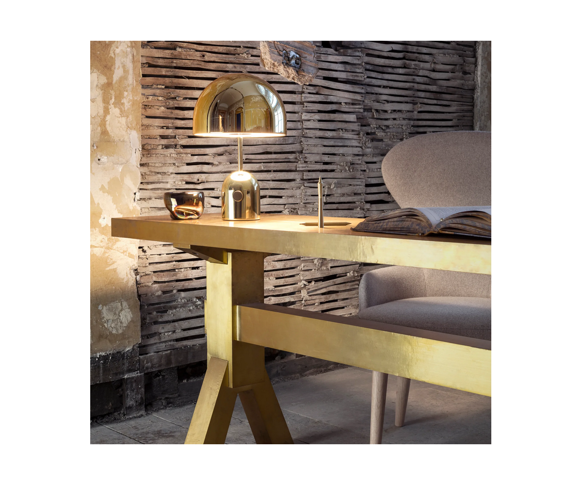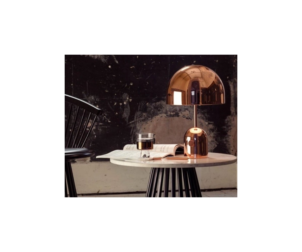 Lámpara de sobremesa inspirada en un diseño de Tom Dixon. Fabricada en acero, disponible en plata, cobre o dorado, terminación brillo. Réplica con materiales originales de máxima calidad.