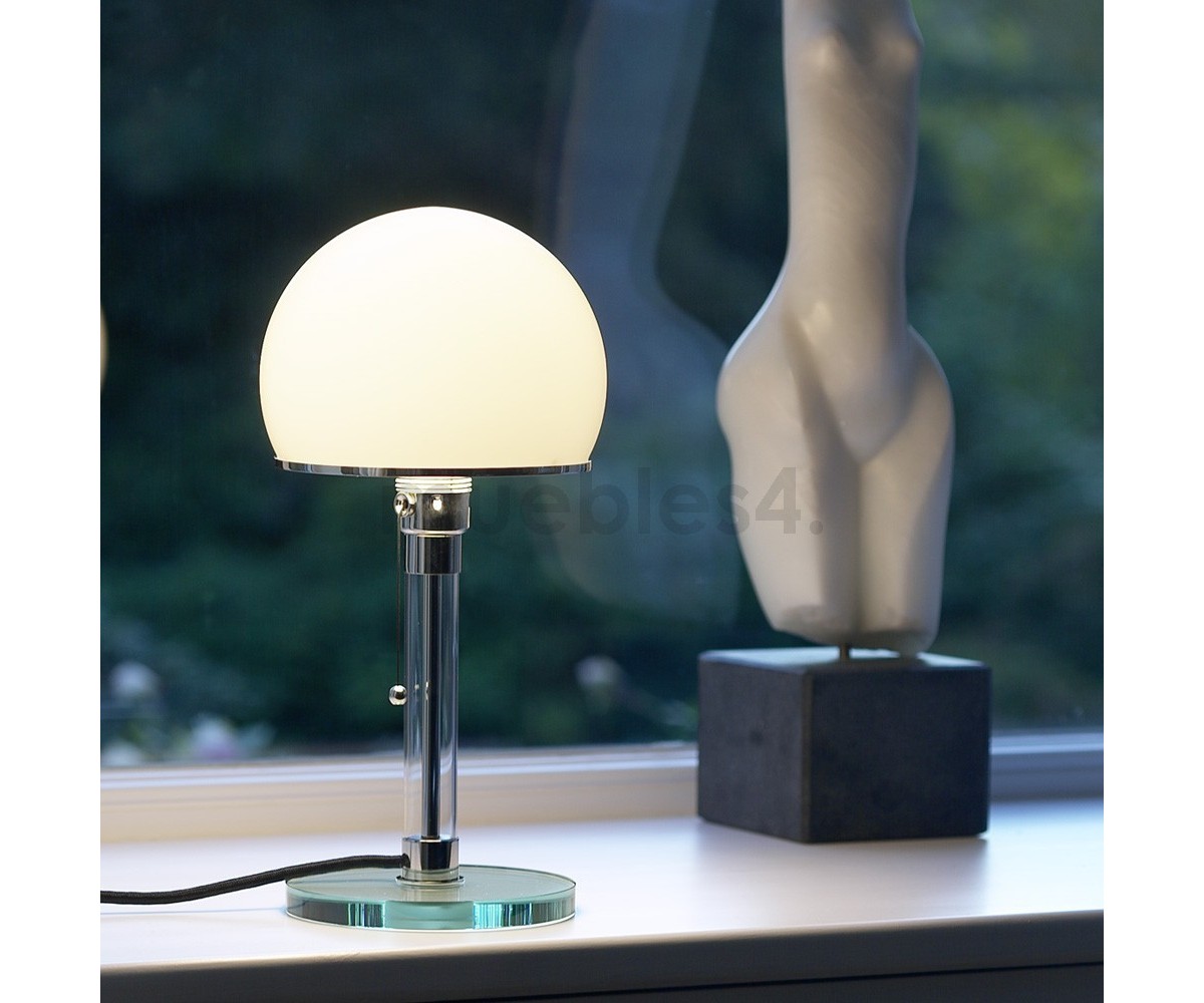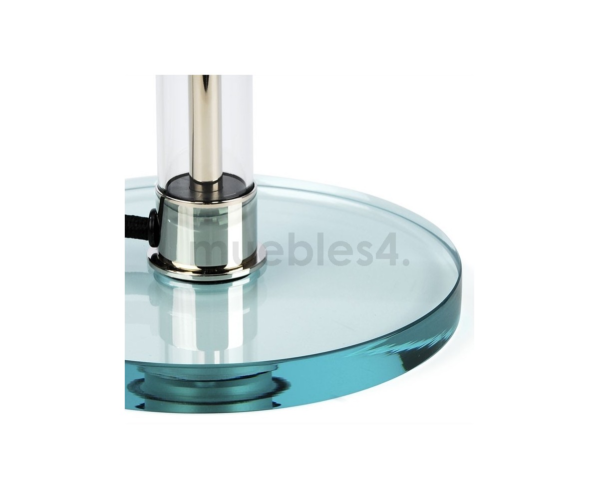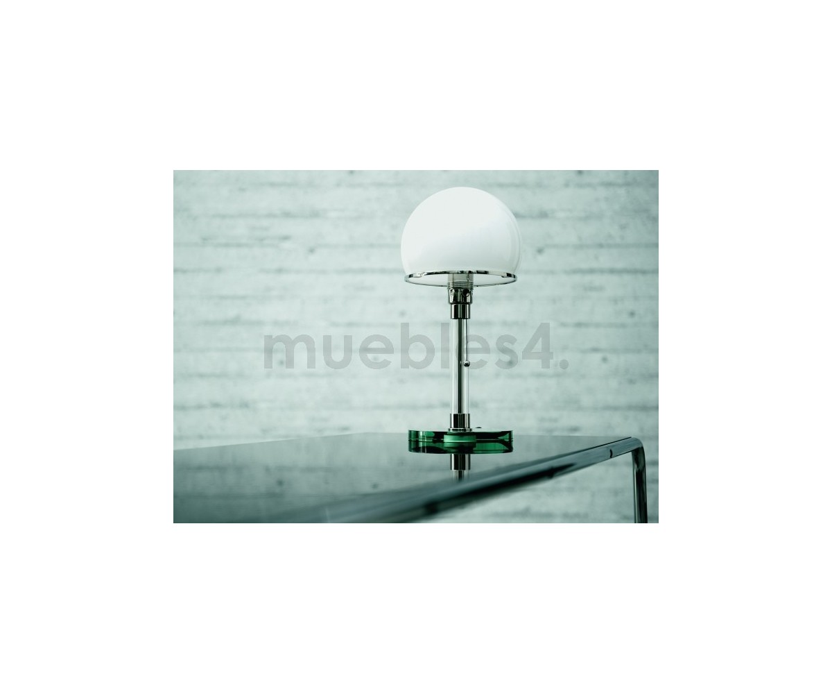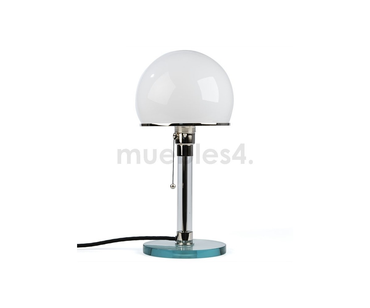 Lámpara de sobremesa, inspirada en un diseño de Wilhelm Wagenfeld. Base fabricada en cristal transparente y acero. Difusor realizado en cristal terminación blanco. Tirador de encendido y apagado. Réplica exacta con materiales originales de máxima calidad.