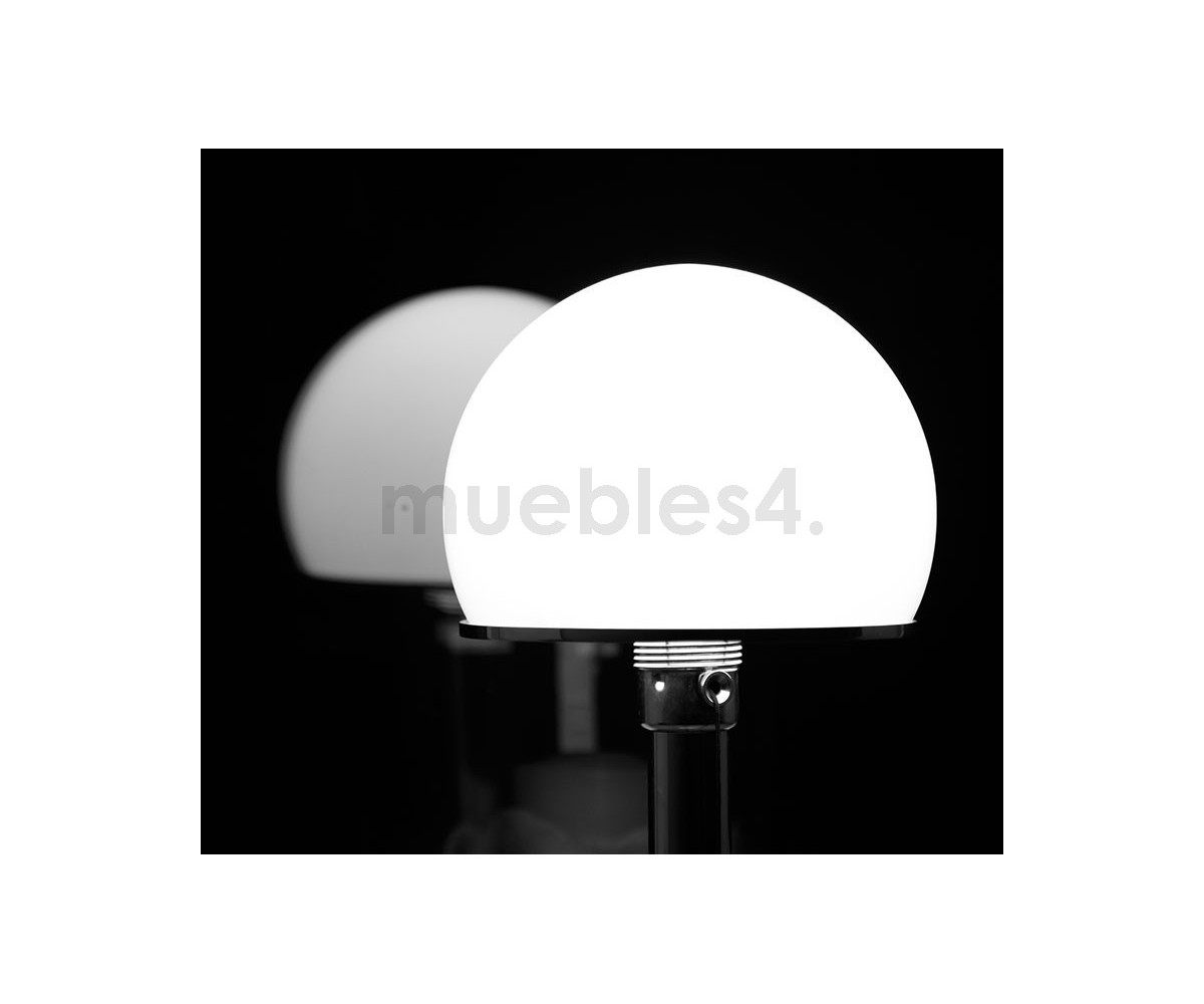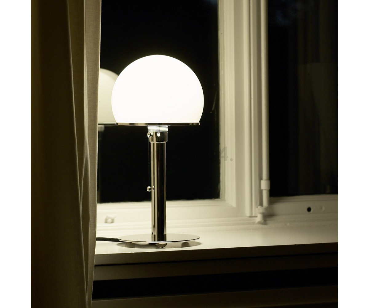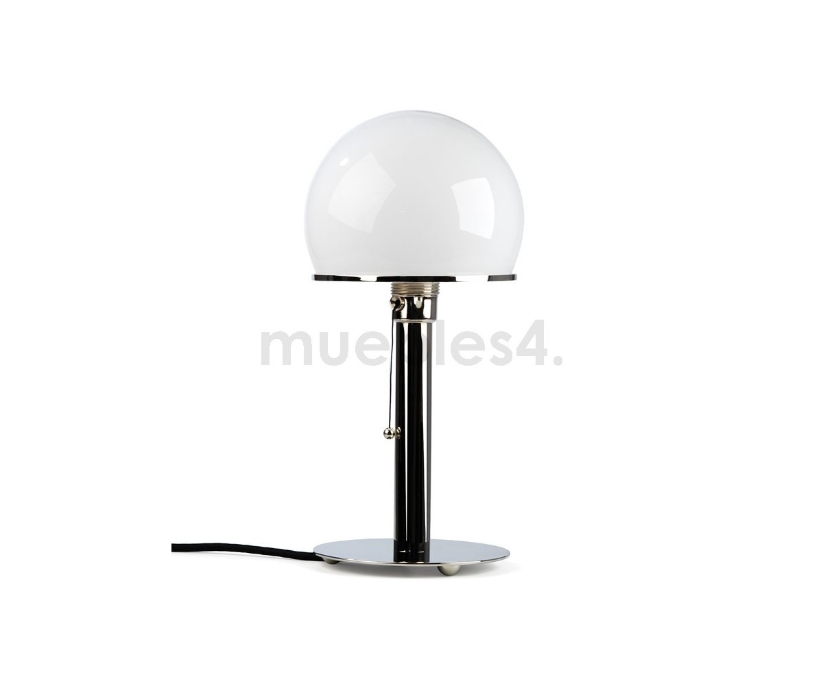 Lámpara de sobremesa, inspirada en un diseño de Wilhelm Wagenfeld. Base fabricada en acero. Difusor realizado en cristal terminación blanco. Tirador de encendido y apagado. Réplica exacta con materiales originales de máxima calidad.